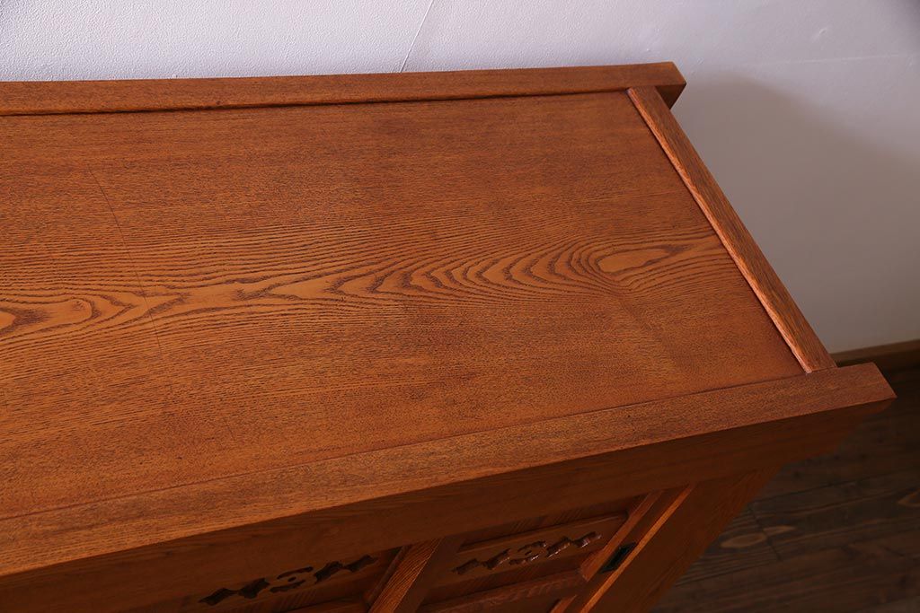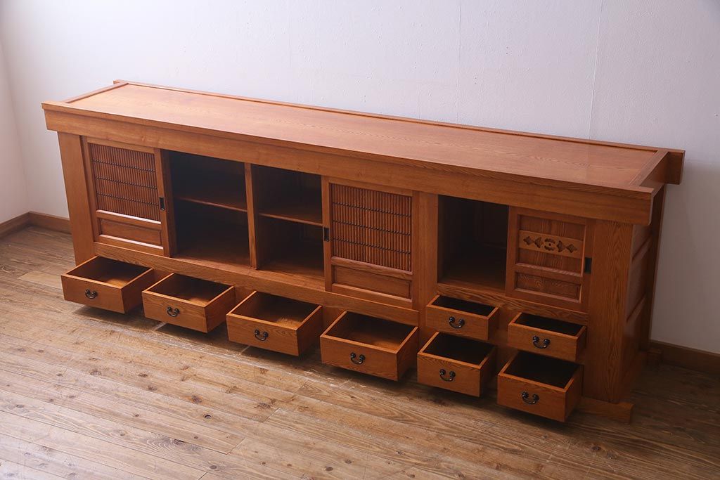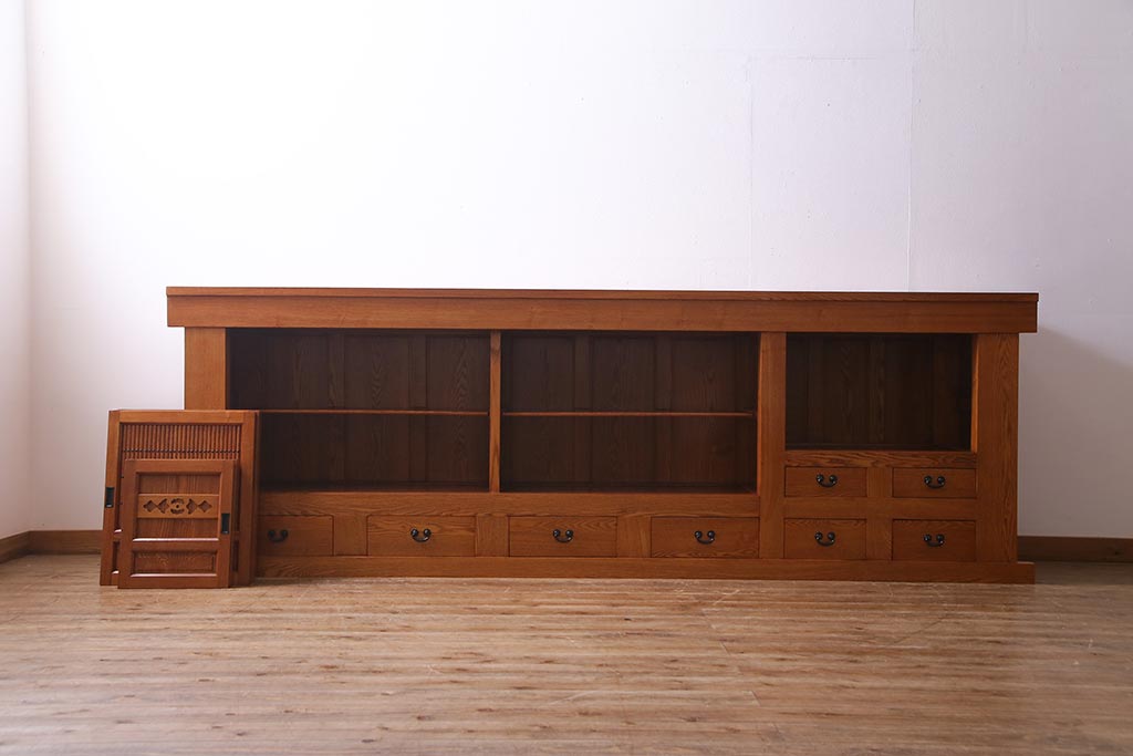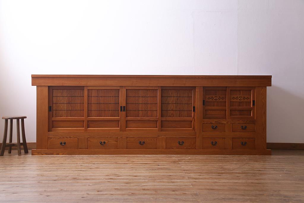 新古品 民芸家具 特大サイズ! ニレ無垢材 和の空間作りに活躍する9尺水屋箪笥・上(九尺水屋、サイドボード、和箪笥、収納棚)(R-038029)です。