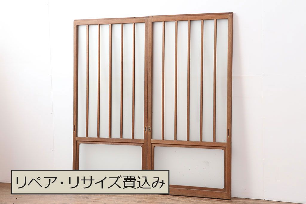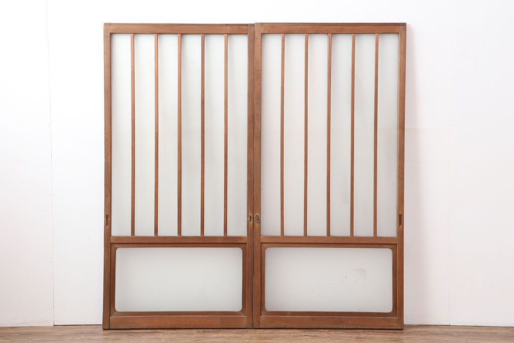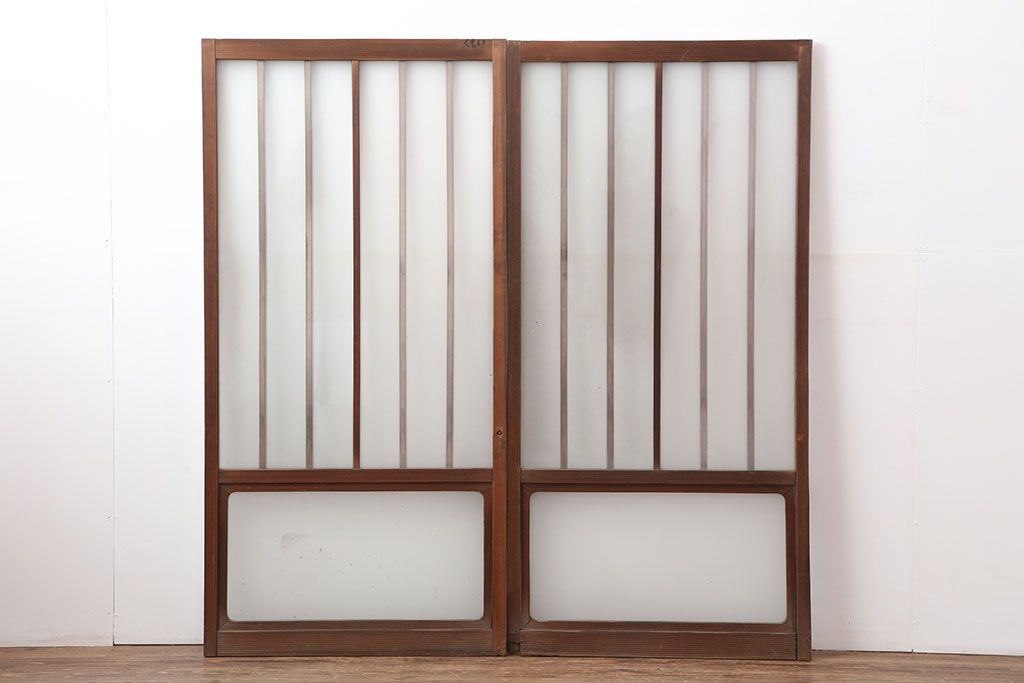 アンティーク建具 和製アンティーク 大正期 縦桟が入ったシンプルな木製フレームのガラス戸2枚セット(窓、引き戸)(R-037121)