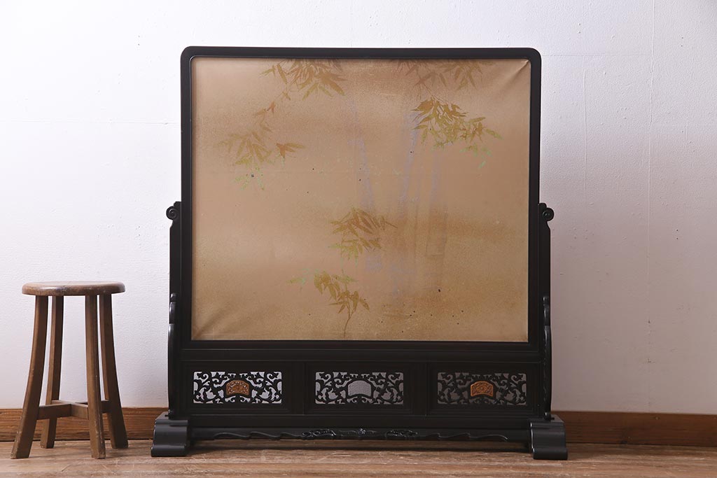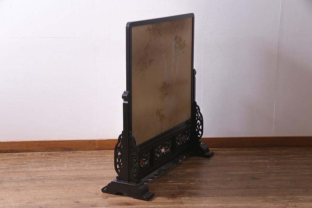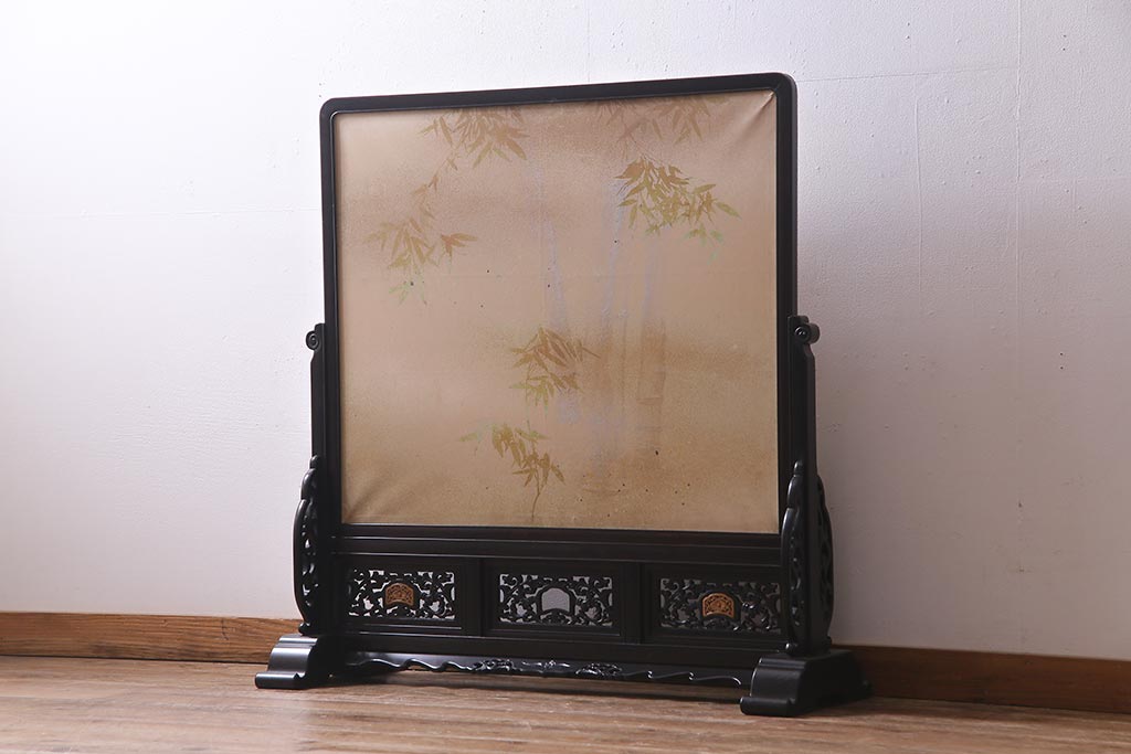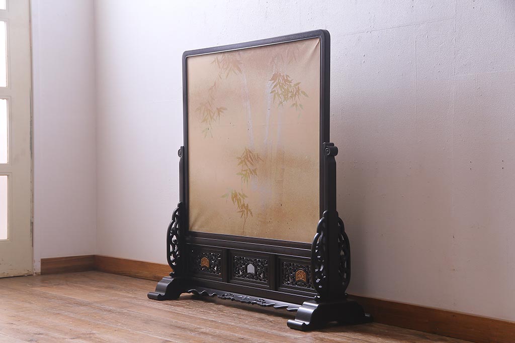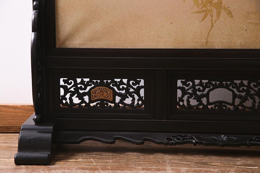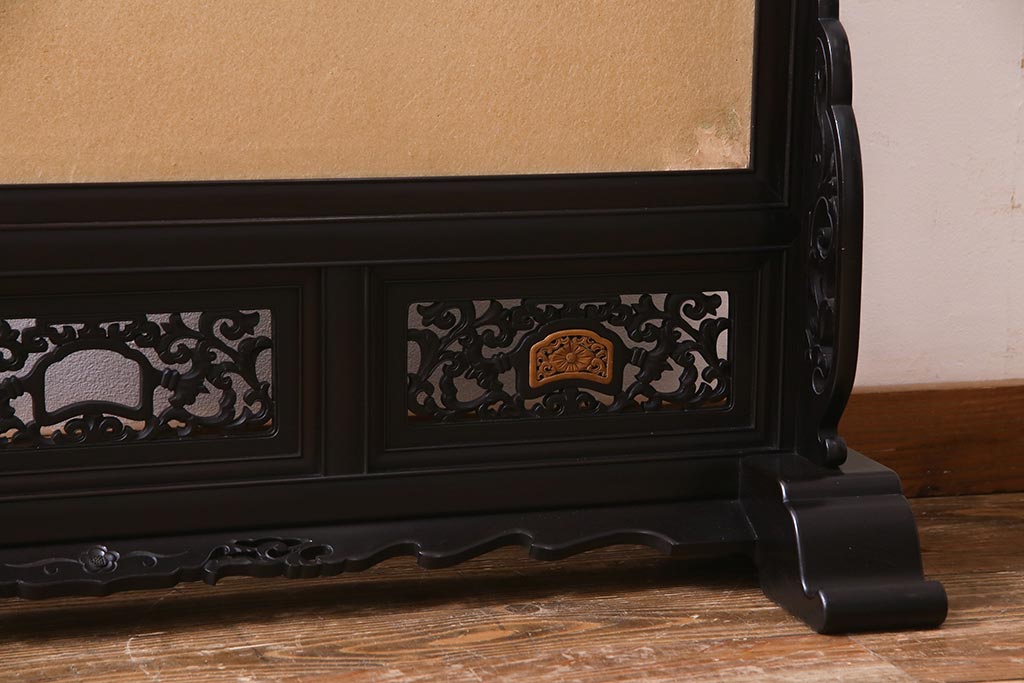 アンティーク家具 黒檀(コクタン)材 漆塗り 透かし彫りが目を引く衝立(パーテーション、仕切り)(R-038177)
