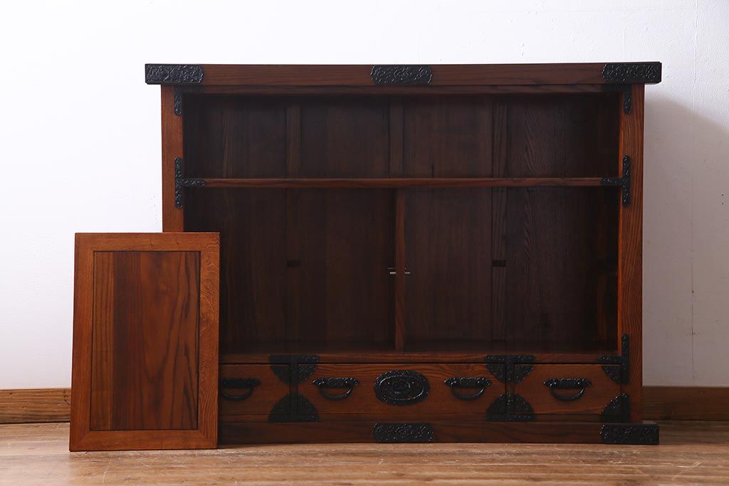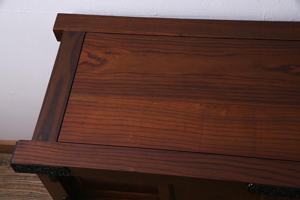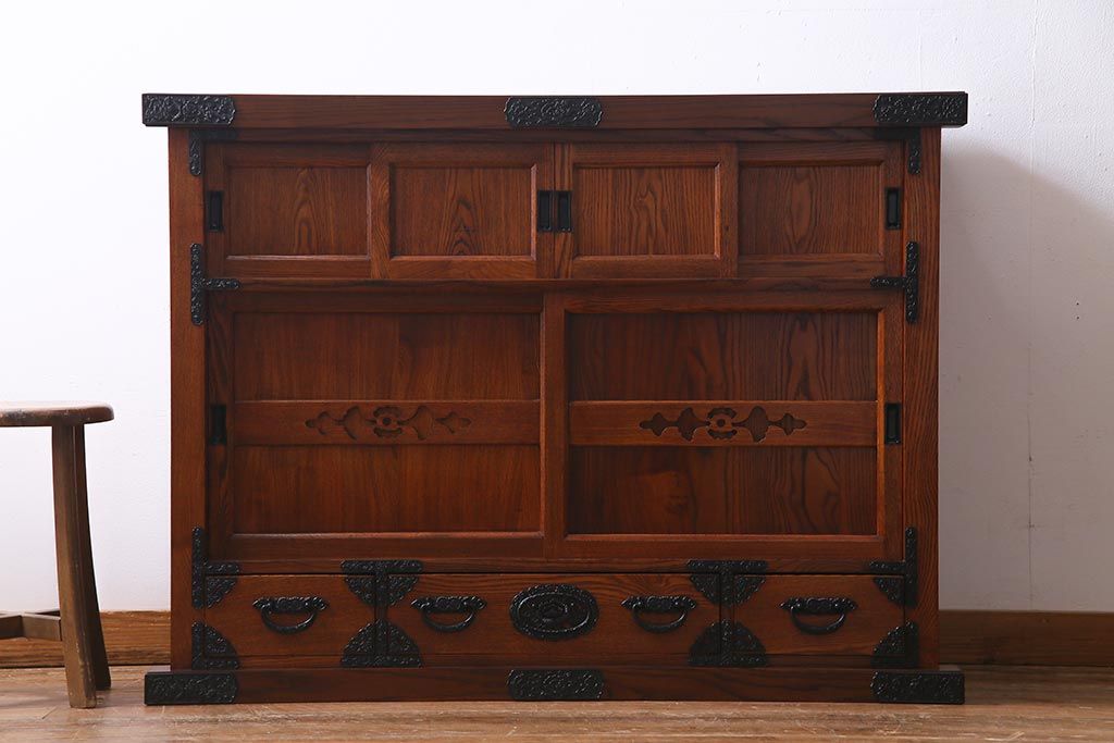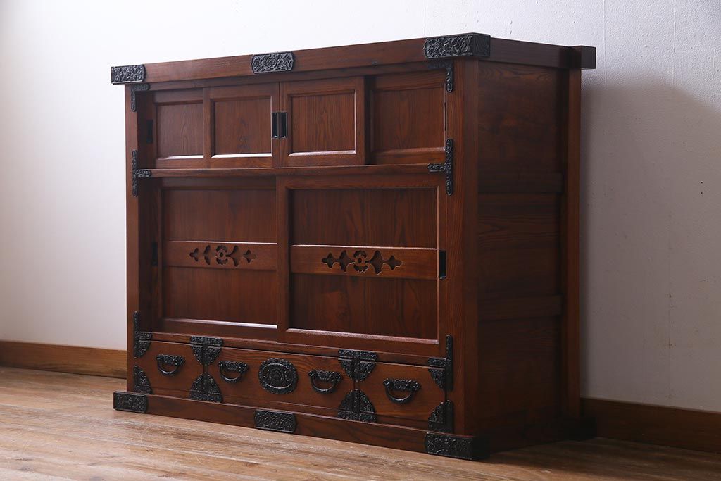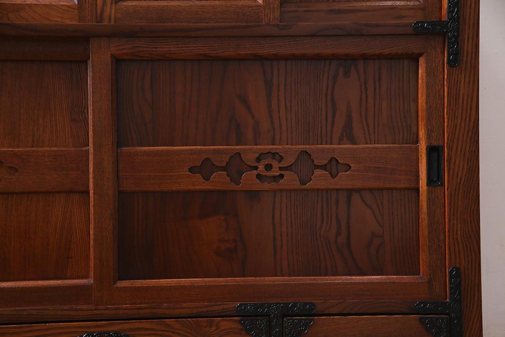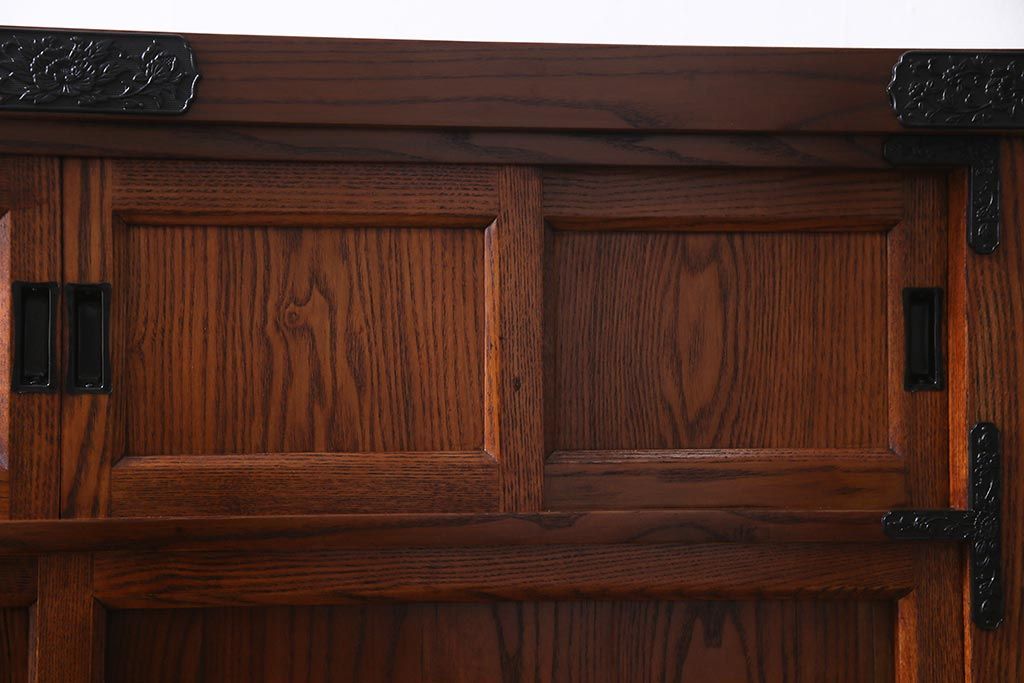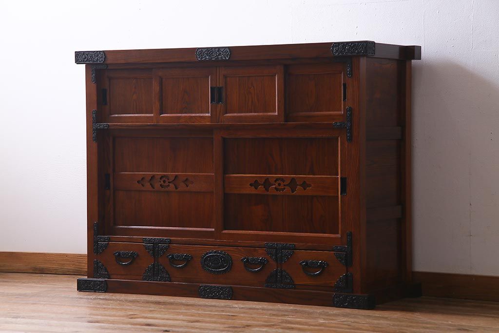 キャビネット・戸棚> サイドキャビネット > 新古品 民芸家具 ニレ無垢材 重厚感と上品さを醸し出す水屋箪笥・上(収納棚、和箪笥、キャビネット)(R-038221)