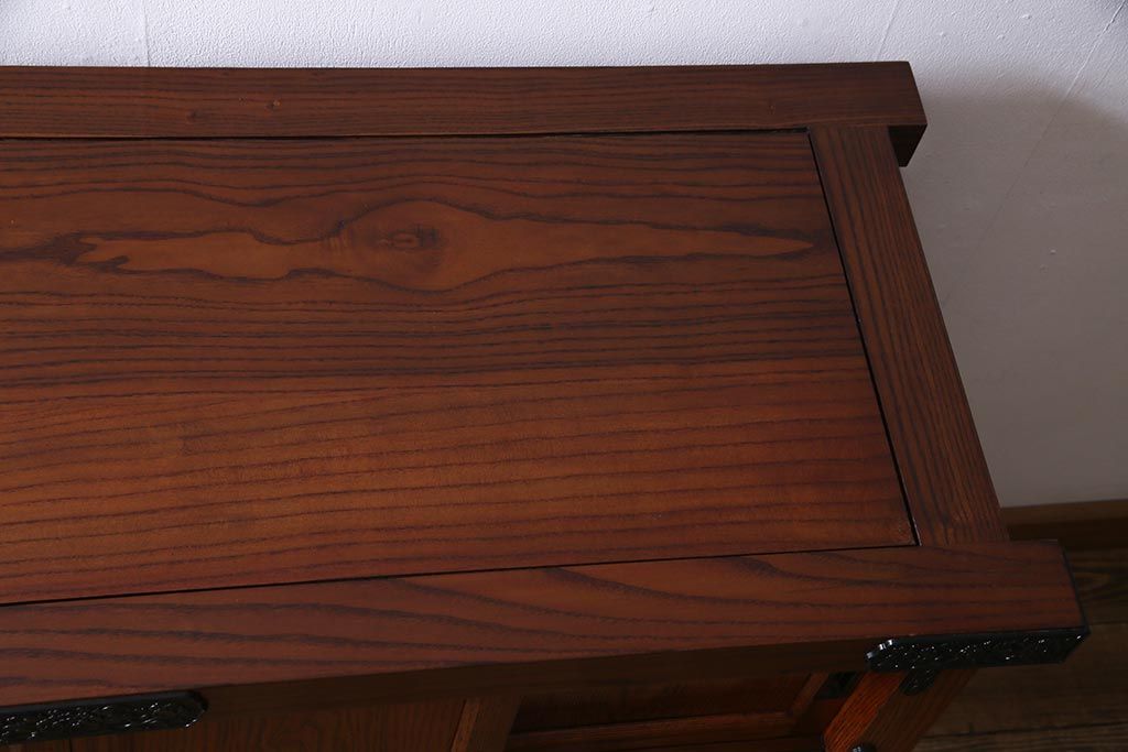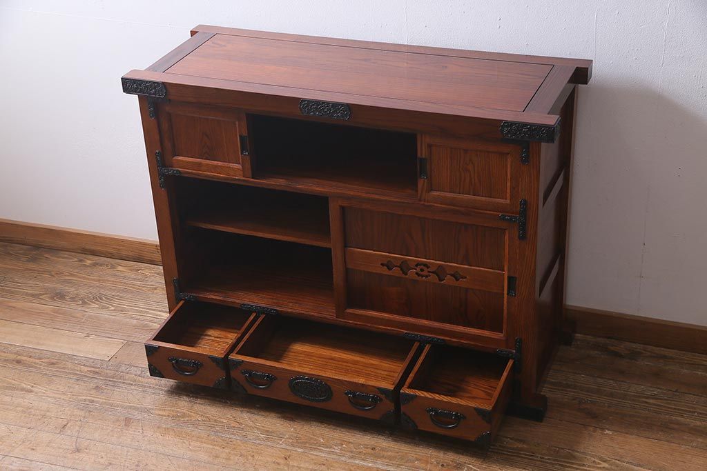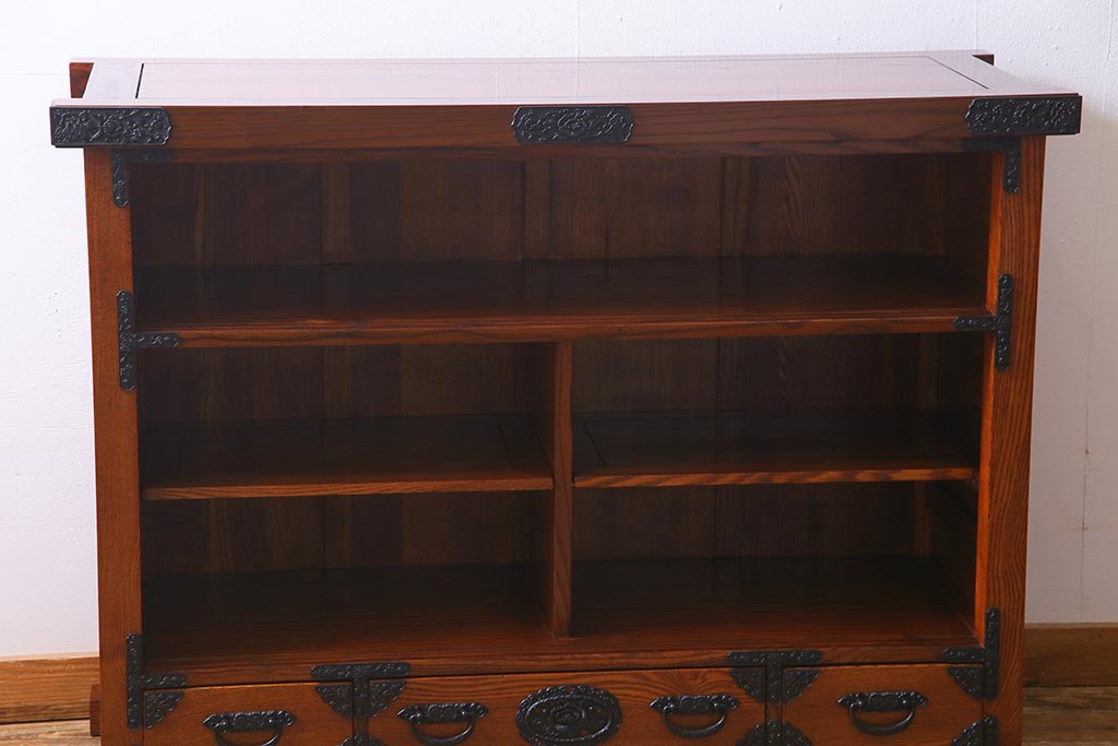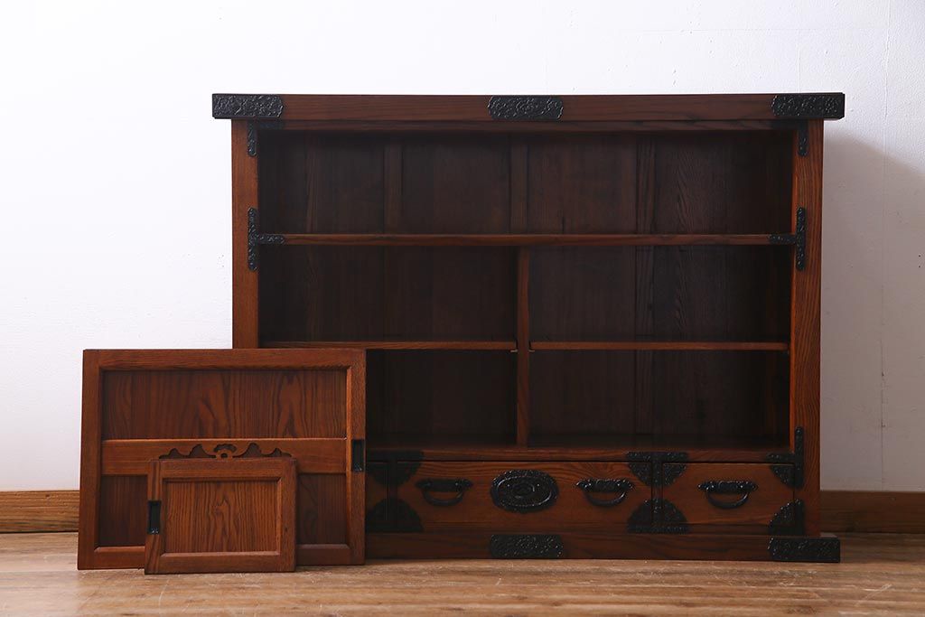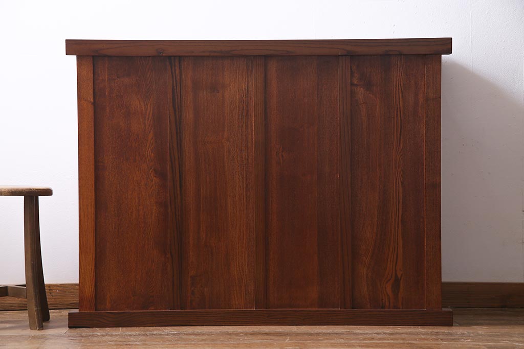 新古品 民芸家具 ニレ無垢材 重厚感と上品さを醸し出す水屋箪笥・上(収納棚、和箪笥、キャビネット)(R-038221)
