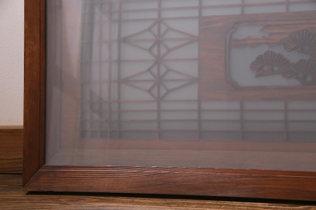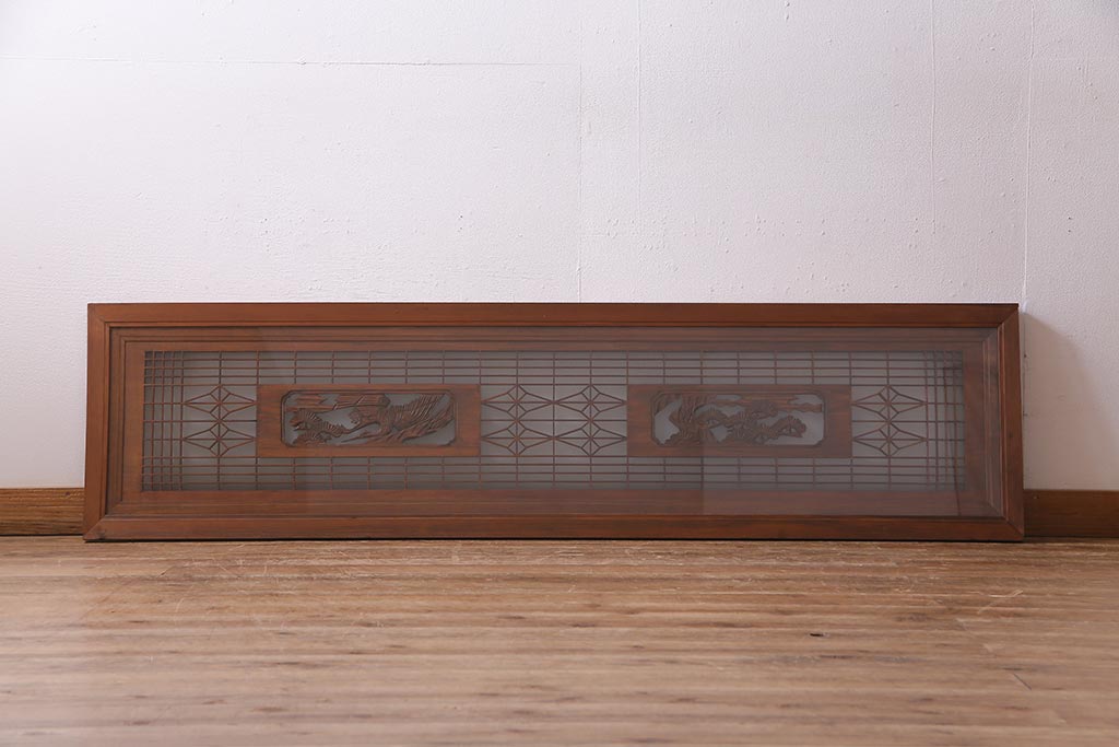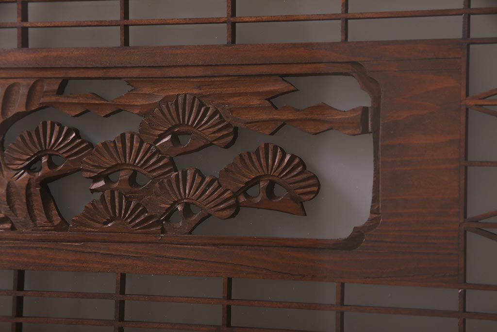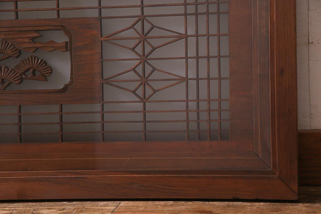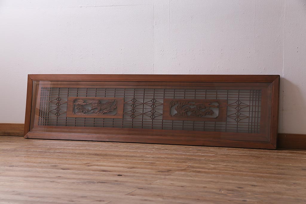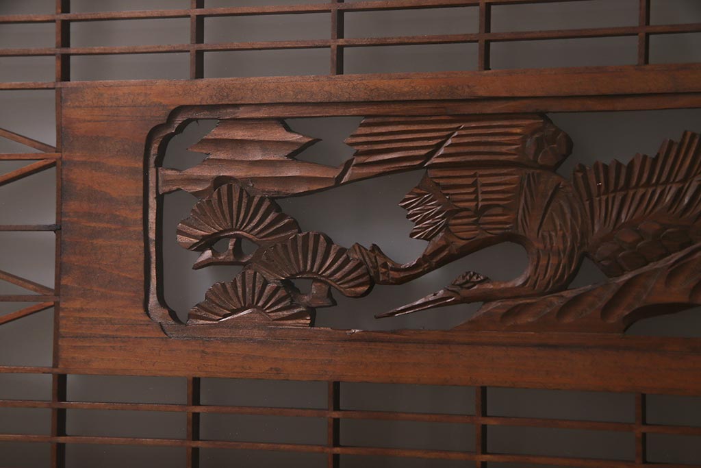 アンティーク建具 繊細な組子と鶴と松の彫刻が見事な欄間(明り取り、両面ガラス)(R-038206)