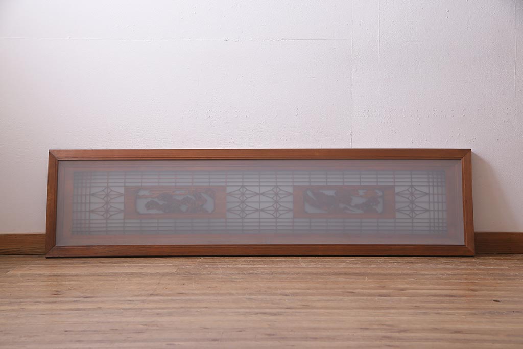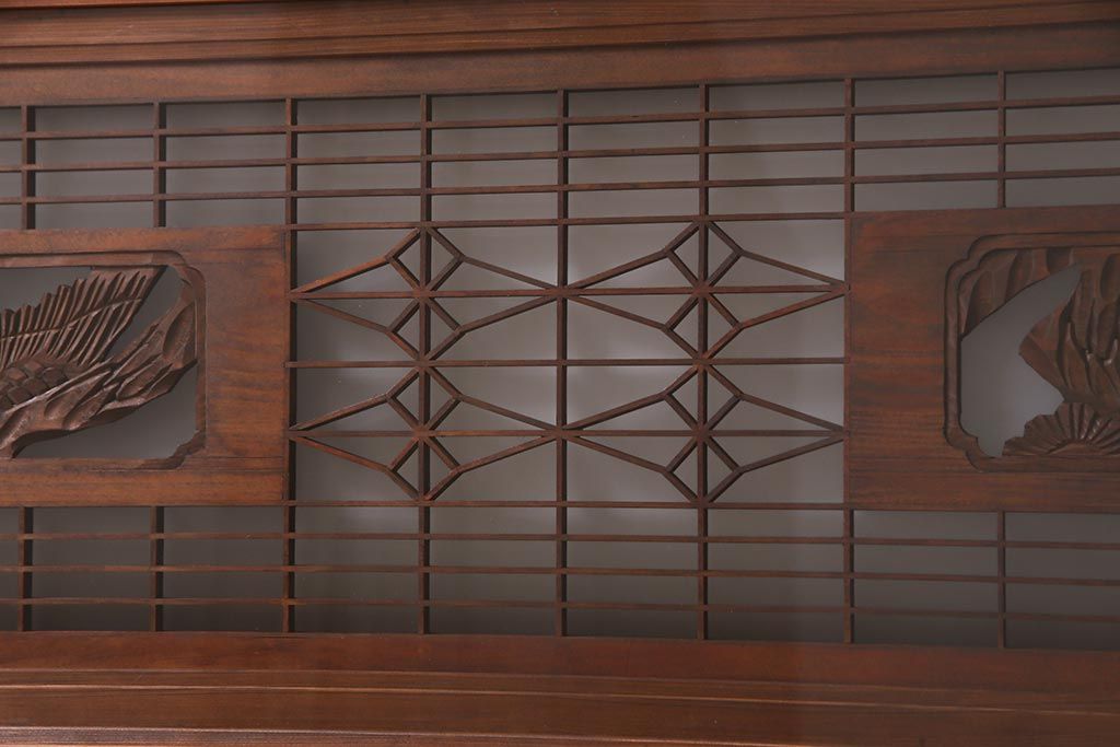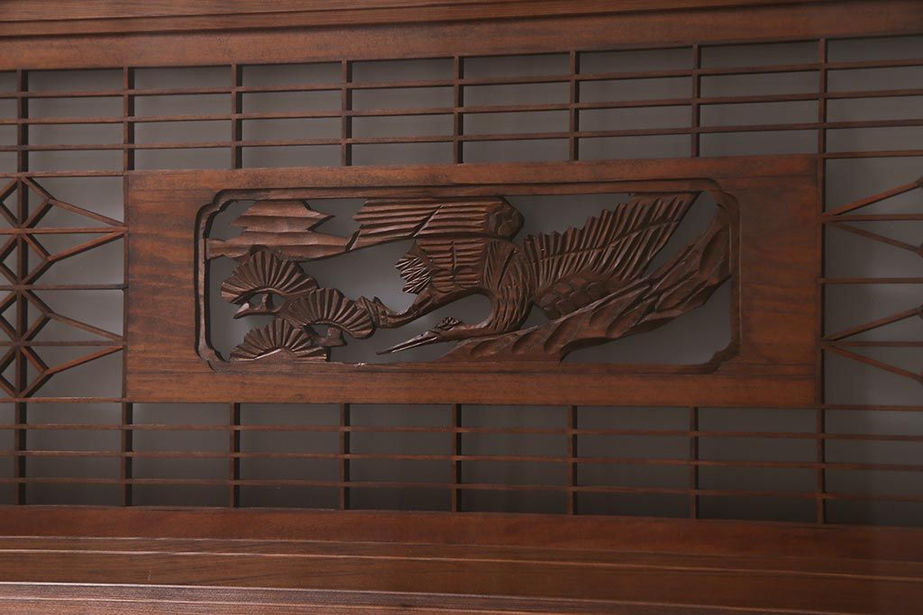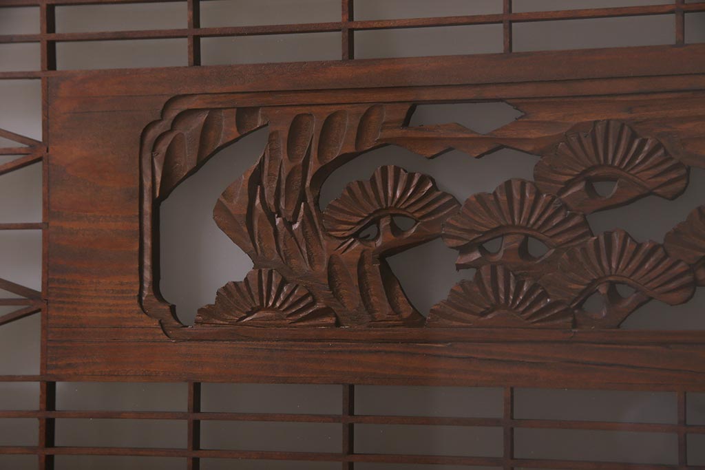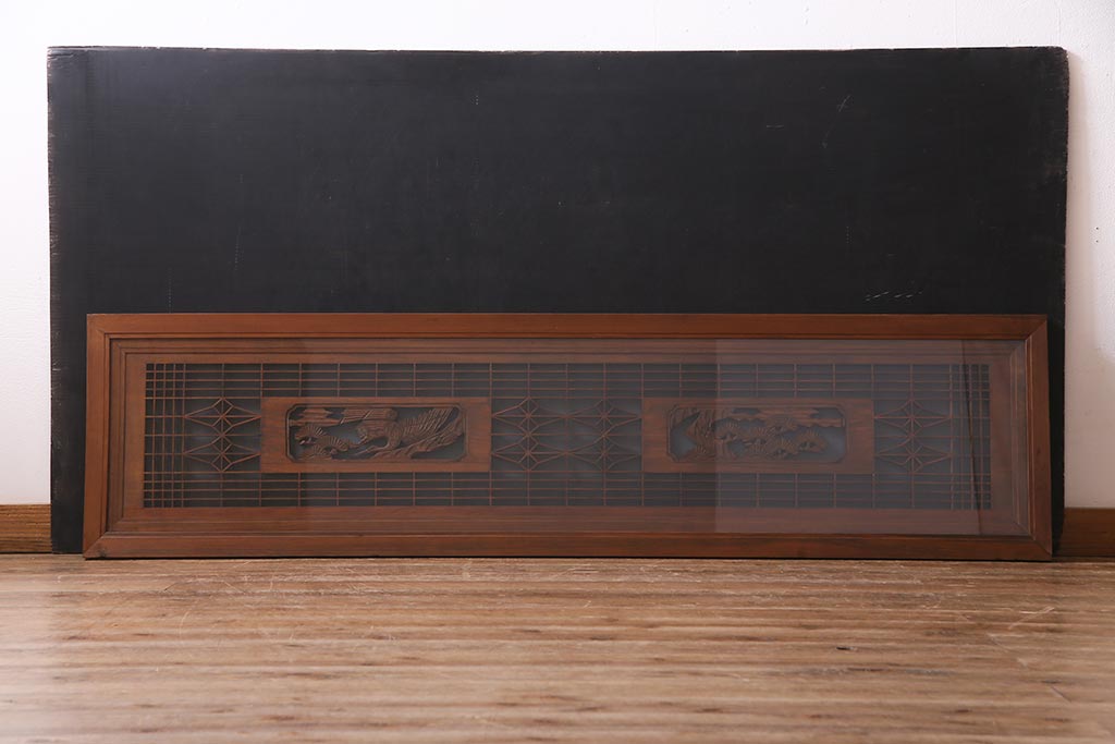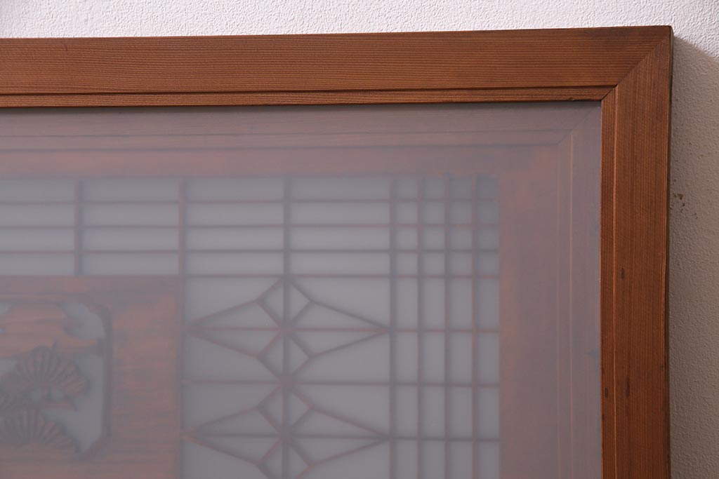 アンティーク建具 繊細な組子と鶴と松の彫刻が見事な欄間(明り取り、両面ガラス)(R-038206)