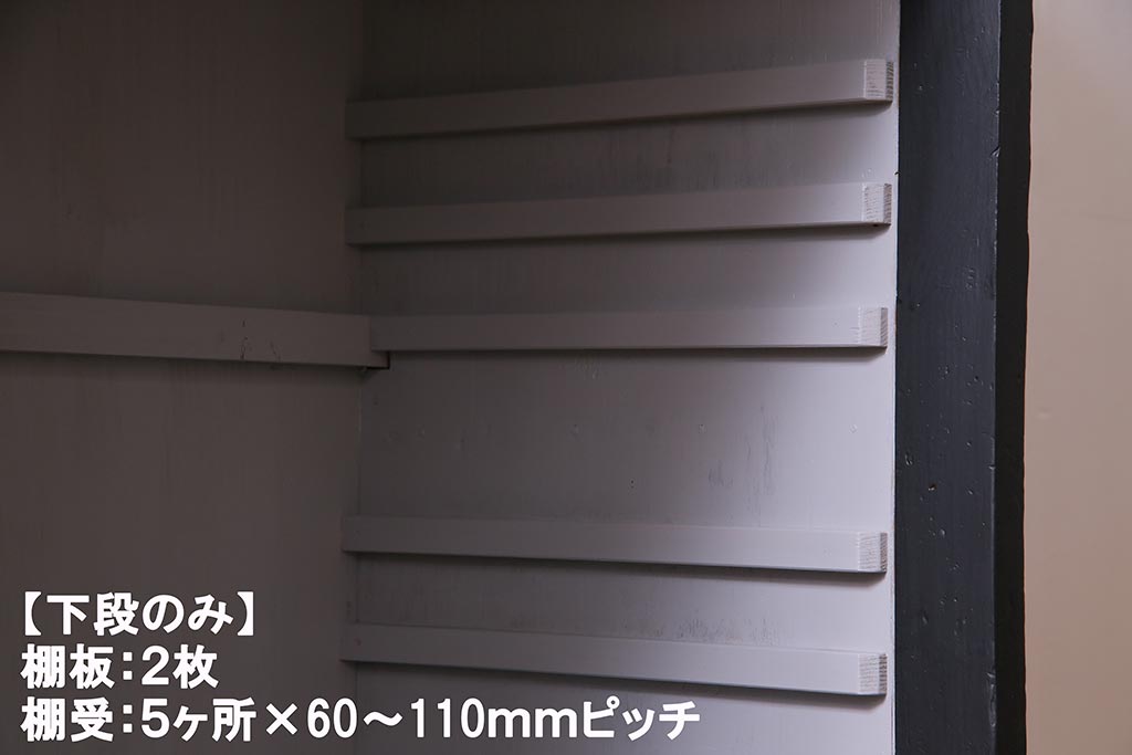 棚板は取り外しできます。棚板は上段1枚、下段2枚あります。下段のみ棚受けは5ヶ所、60〜110mmピッチで調整できます。棚幅サイズのものが1枚の作りです。