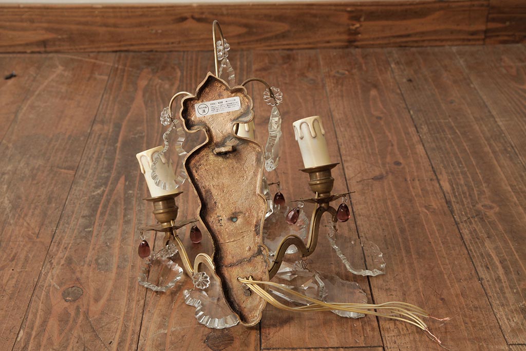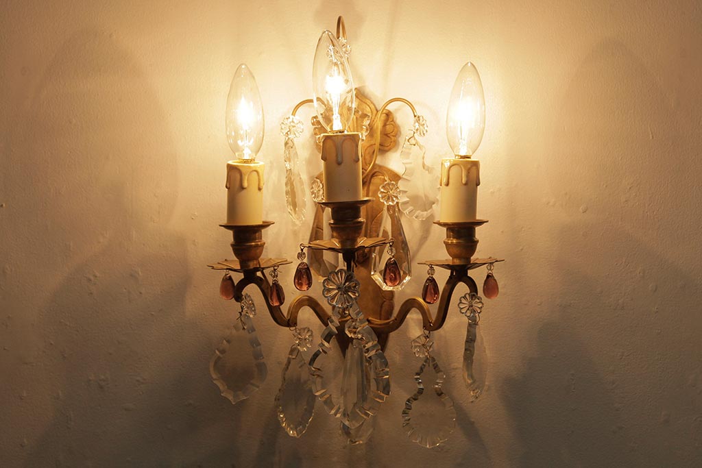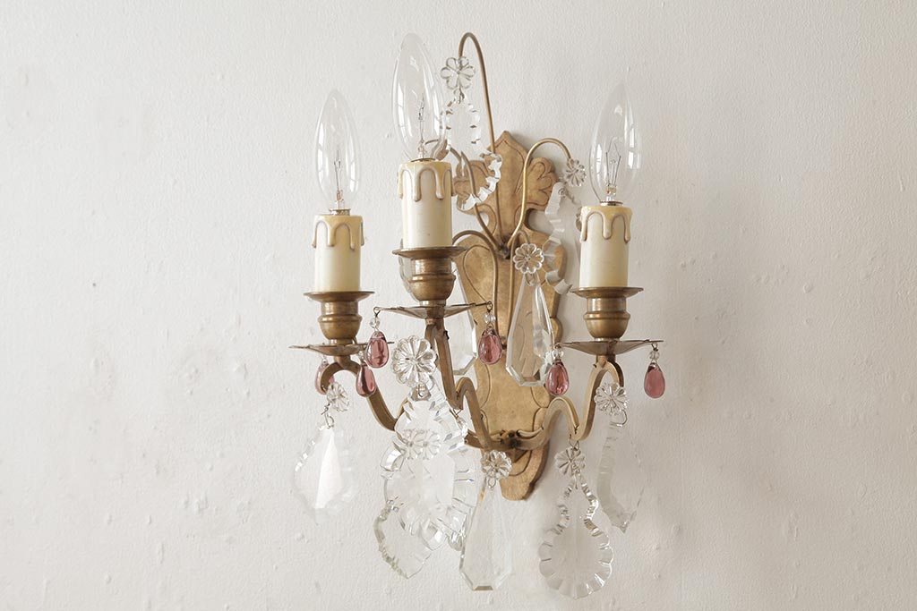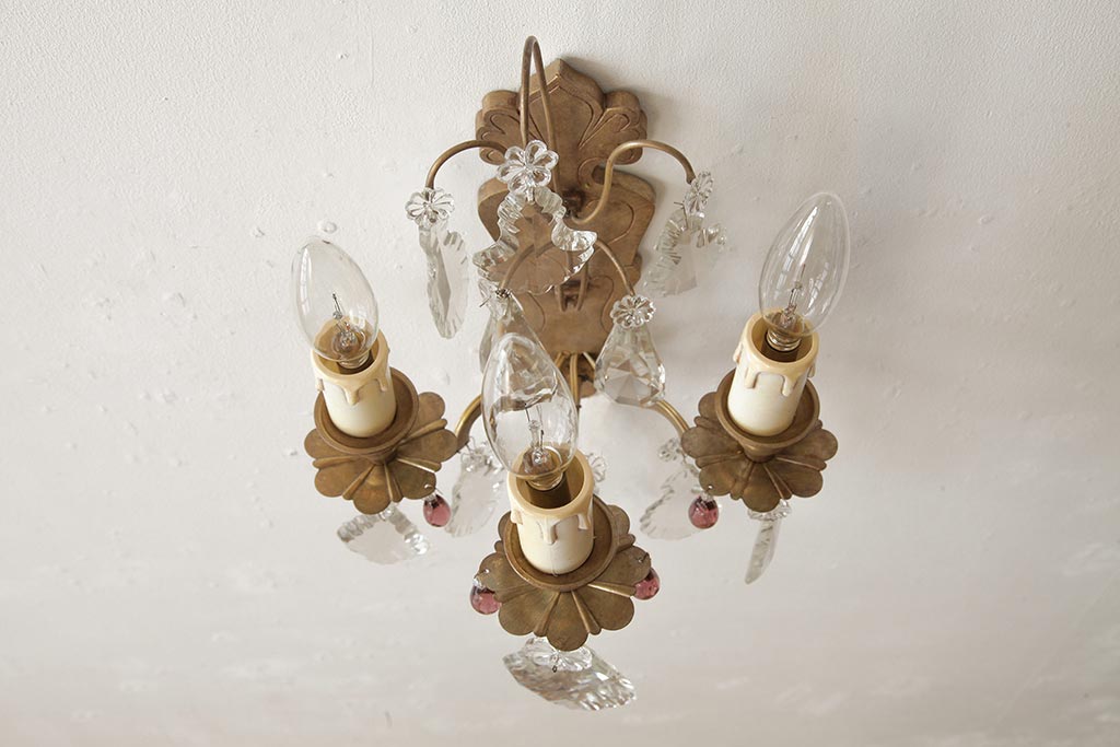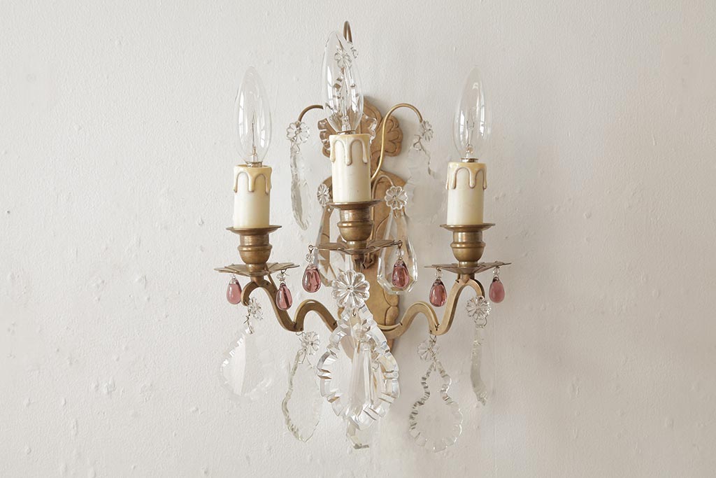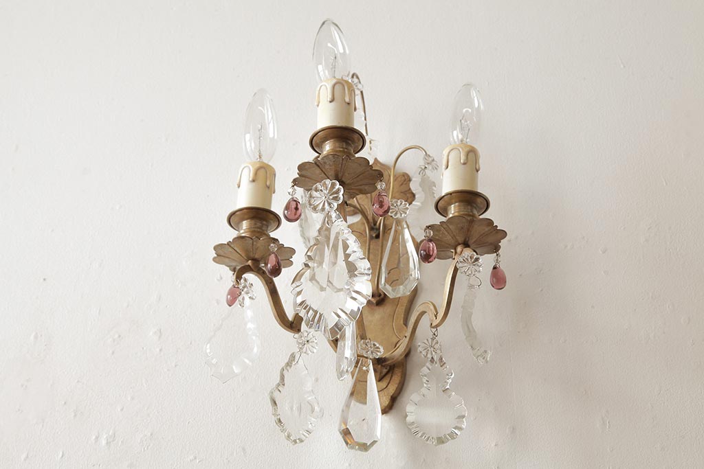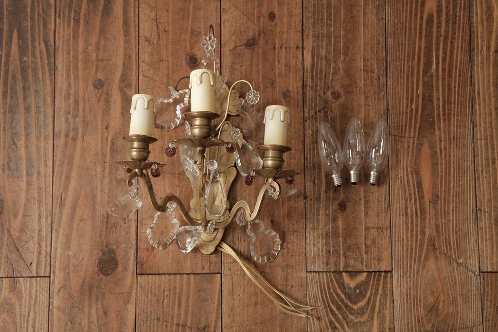 照明・ランプ> シャンデリア > ビンテージ照明 真鍮製 ガラスドロップがおしゃれなフランスヴィンテージのウォールランプ(3灯、壁掛けシャンデリア、壁付け照明)(R-038240)