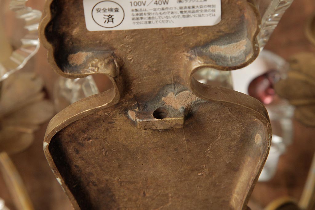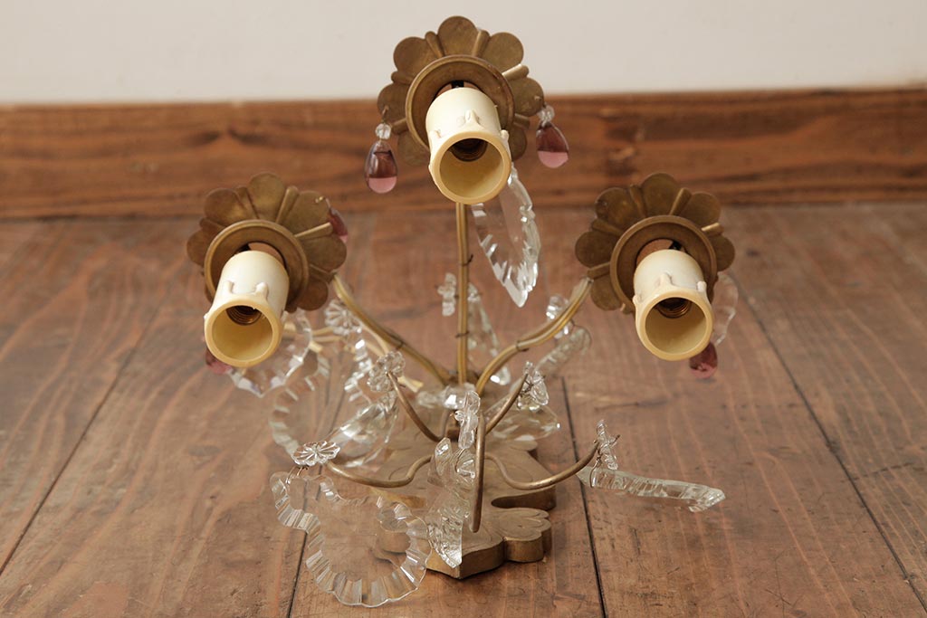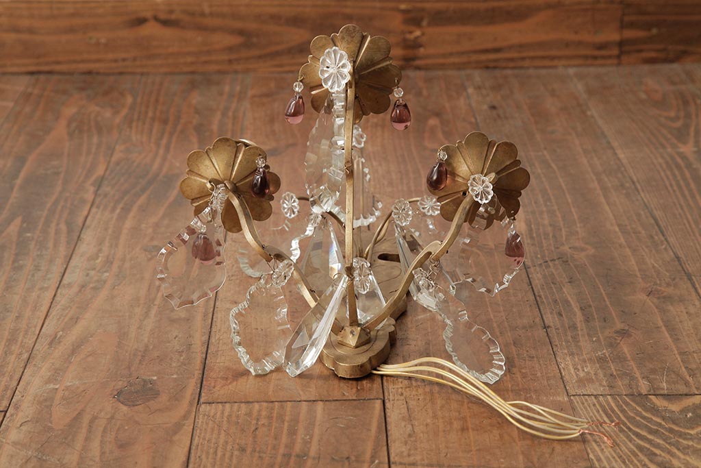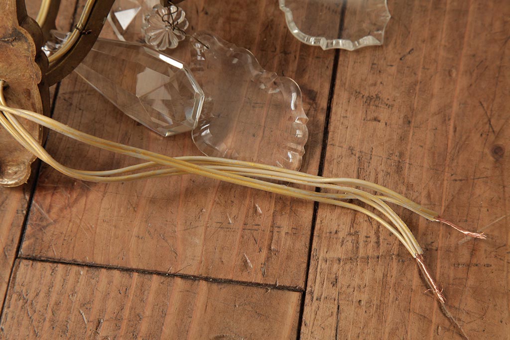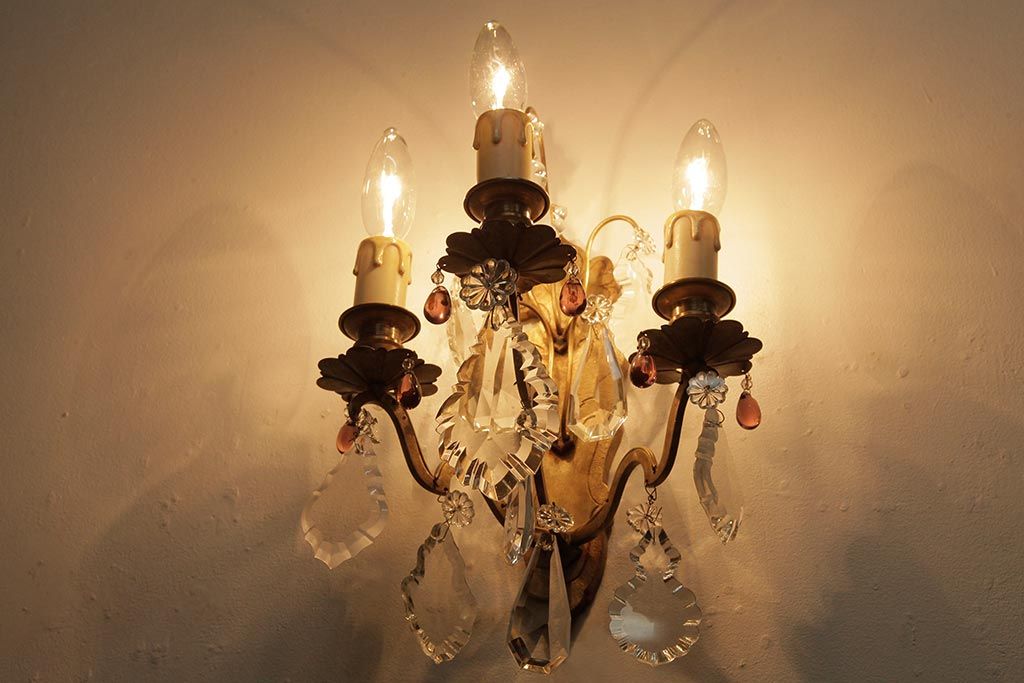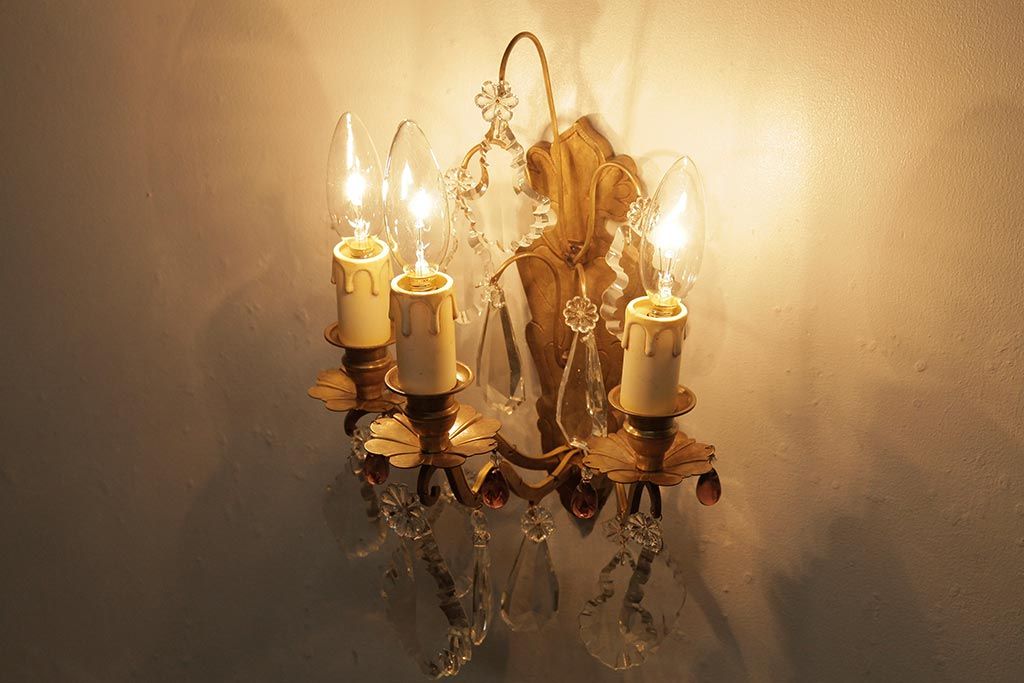 照明・ランプ> シャンデリア > ビンテージ照明 真鍮製 ガラスドロップがおしゃれなフランスヴィンテージのウォールランプ(3灯、壁掛けシャンデリア、壁付け照明)(R-038240)