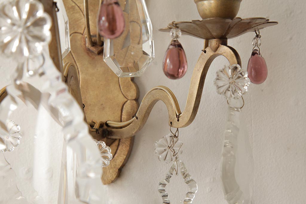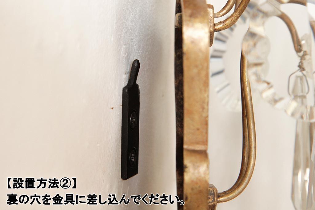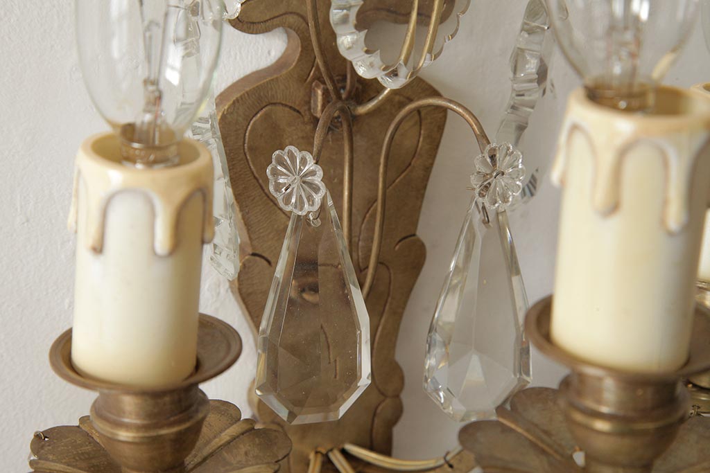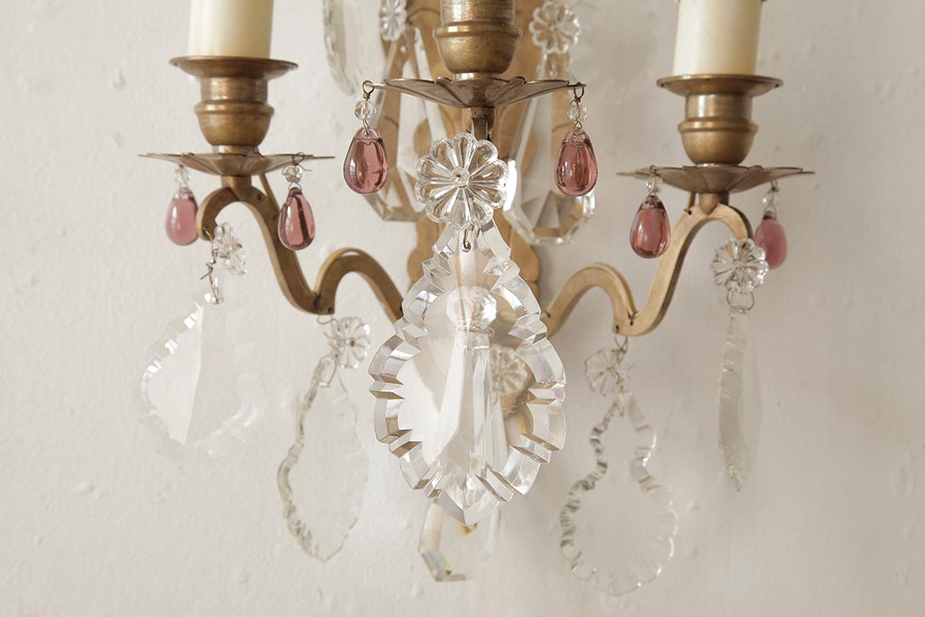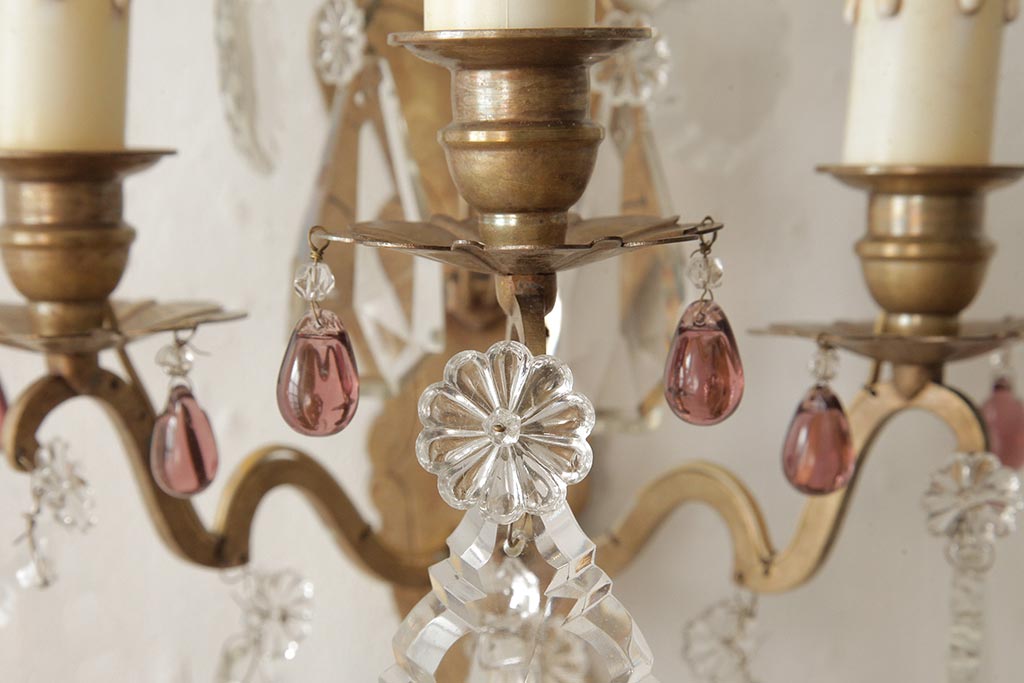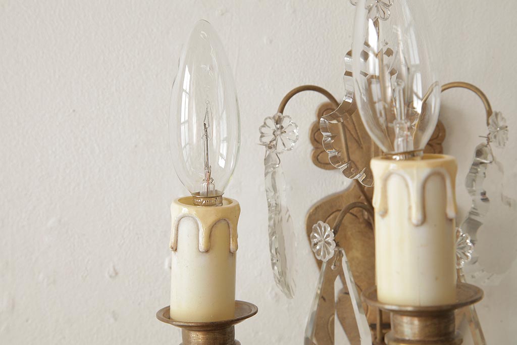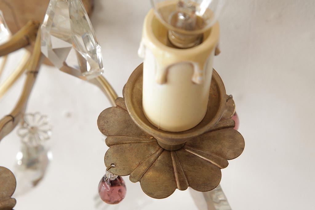 照明・ランプ> シャンデリア > ビンテージ照明 真鍮製 ガラスドロップがおしゃれなフランスヴィンテージのウォールランプ(3灯、壁掛けシャンデリア、壁付け照明)(R-038240)