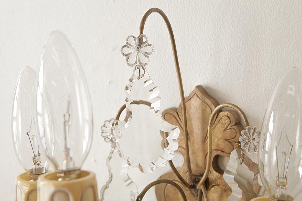 照明・ランプ> ウォールライト > ビンテージ照明 真鍮製 ガラスドロップがおしゃれなフランスヴィンテージのウォールランプ(3灯、壁掛けシャンデリア、壁付け照明)(R-038240)