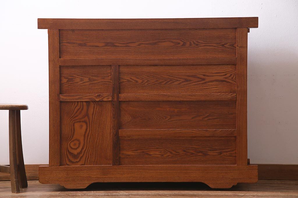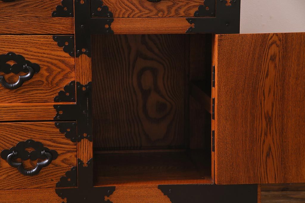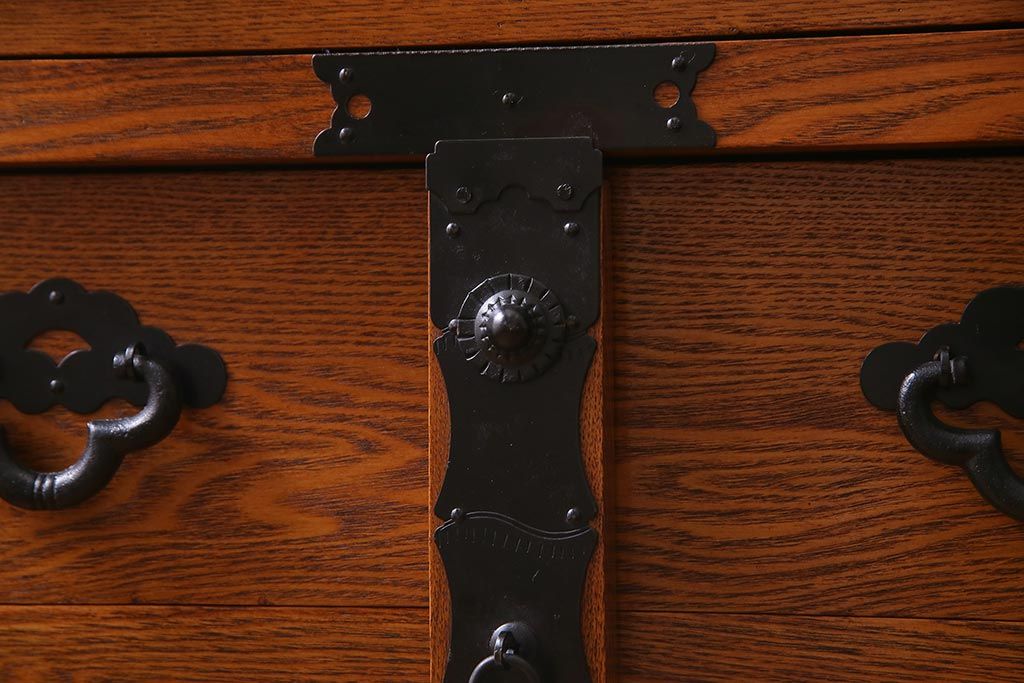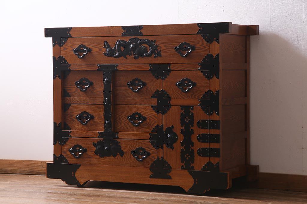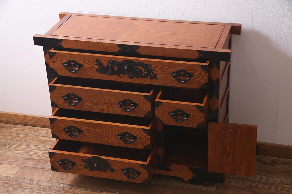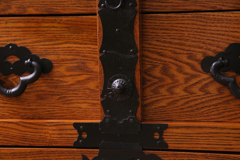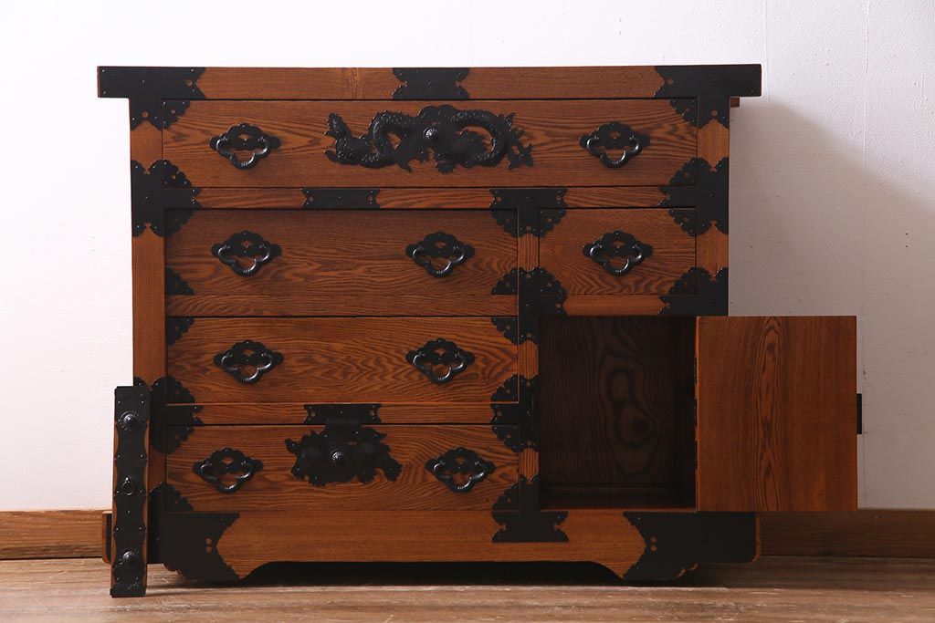 新古品 民芸家具 楡(ニレ)材総無垢 重厚な金具が目を引く車箪笥(帳場箪笥、チェスト)(R-038294)