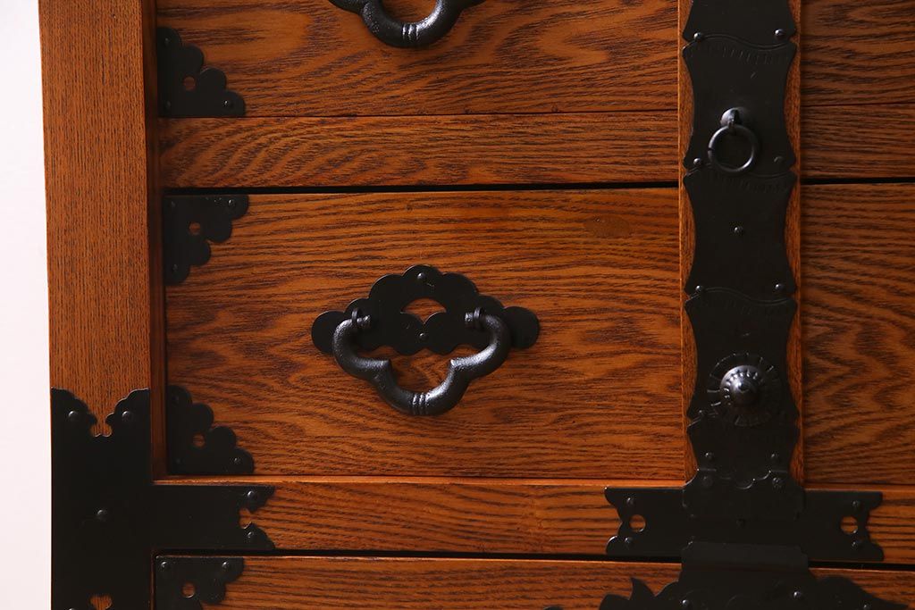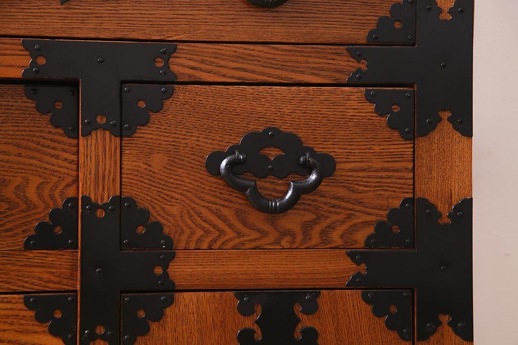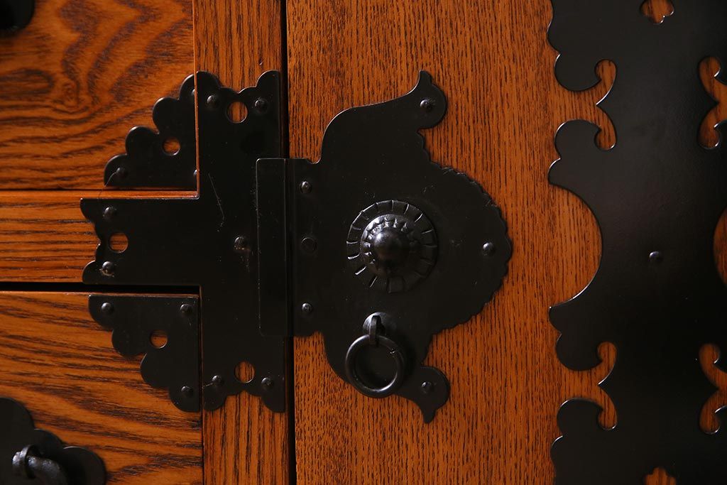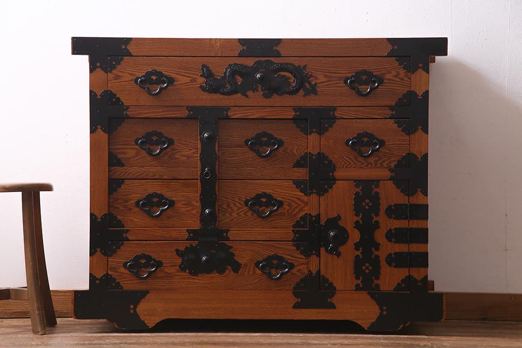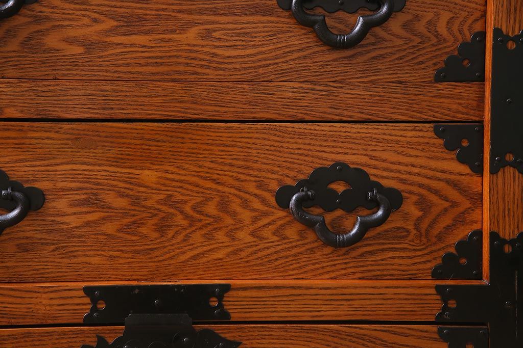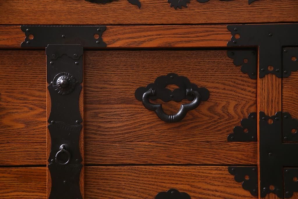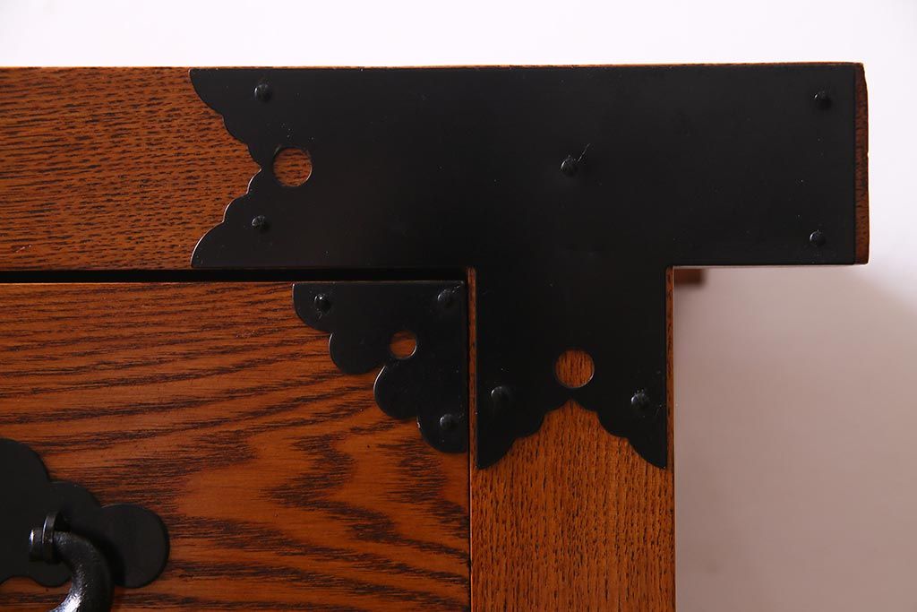 和箪笥 > 新古品 民芸家具 楡(ニレ)材総無垢 重厚な金具が目を引く車箪笥(帳場箪笥、チェスト)(R-038294)