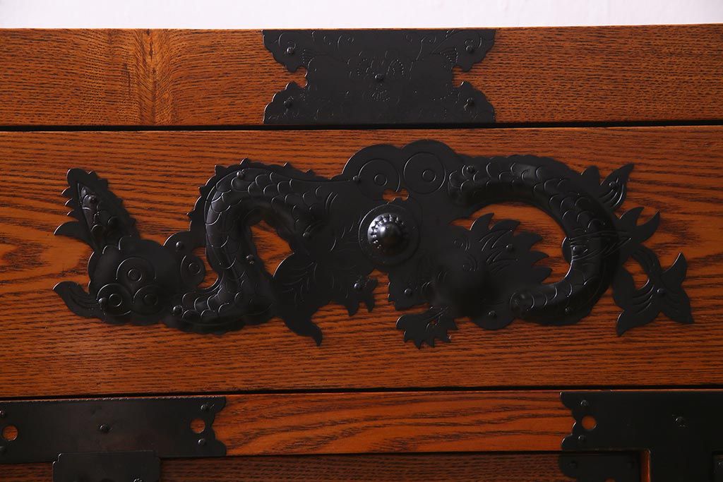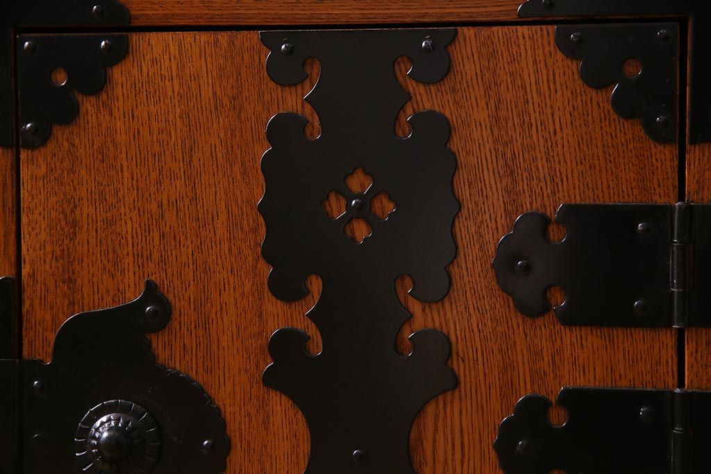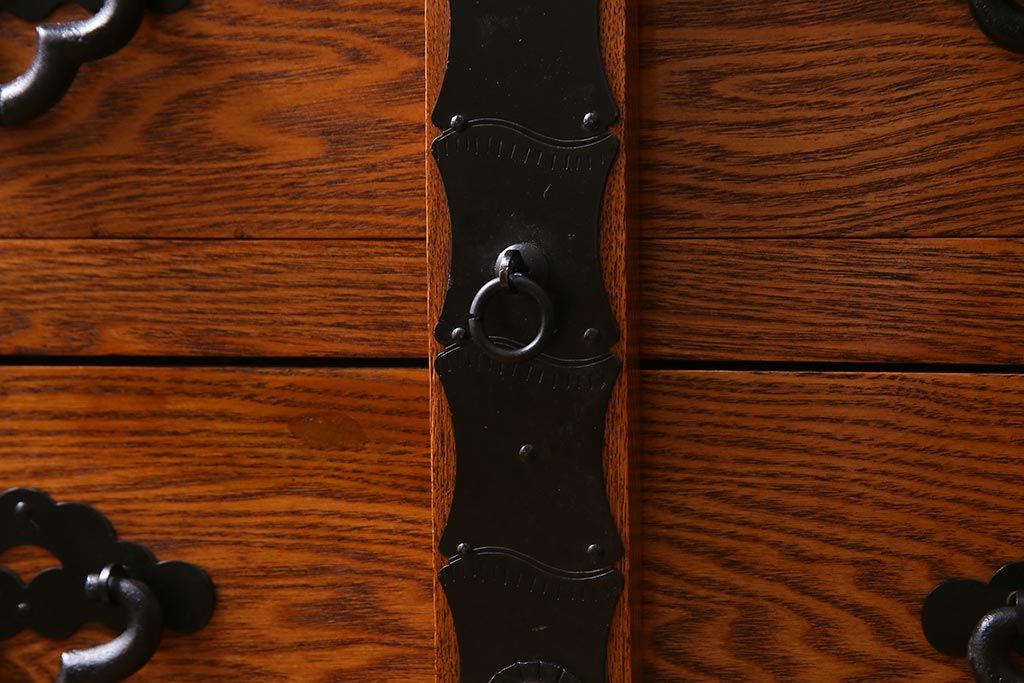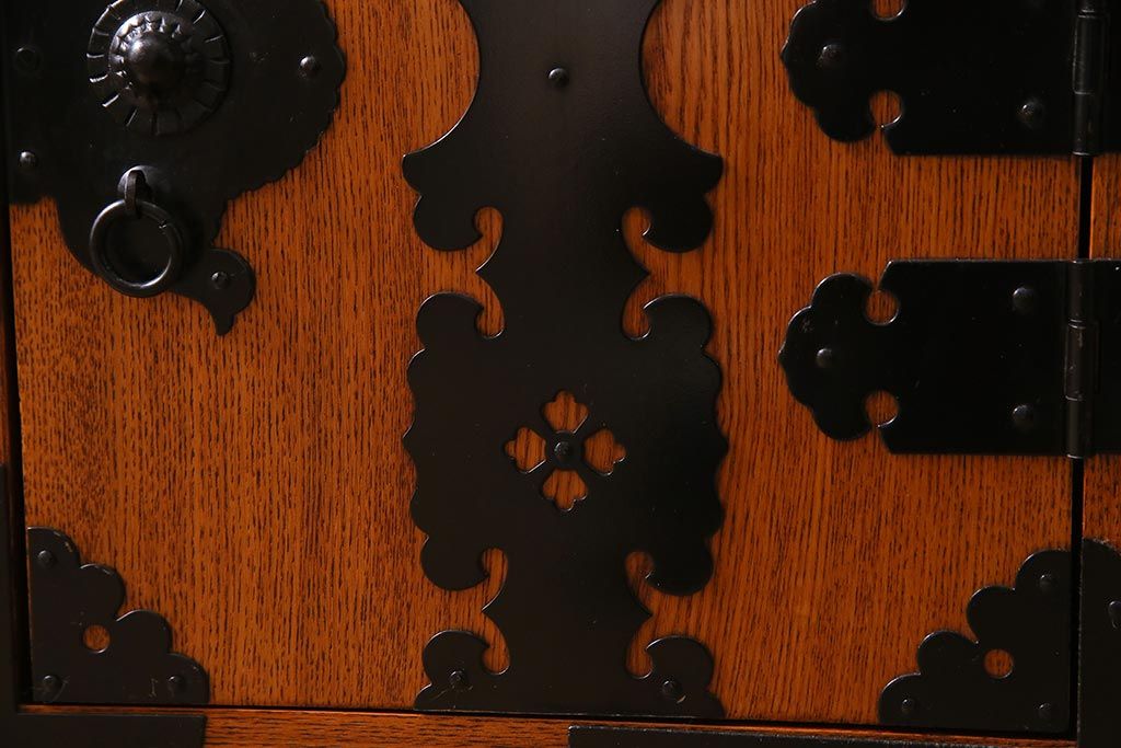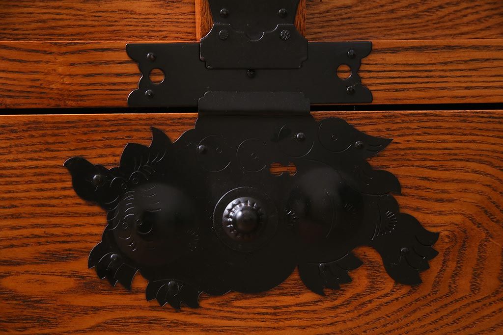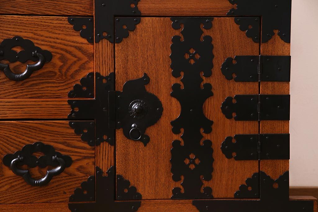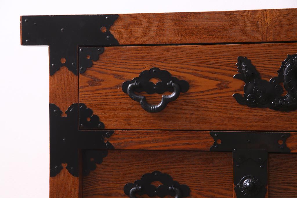 和箪笥 > 新古品 民芸家具 楡(ニレ)材総無垢 重厚な金具が目を引く車箪笥(帳場箪笥、チェスト)(R-038294)