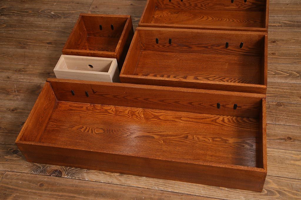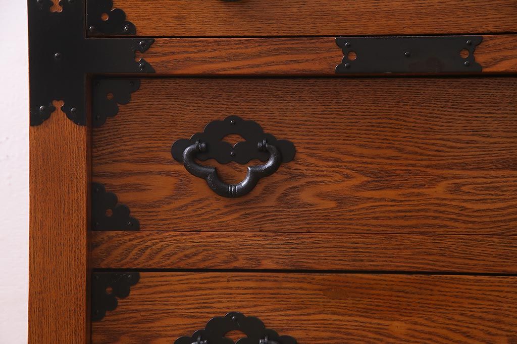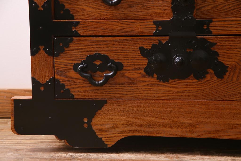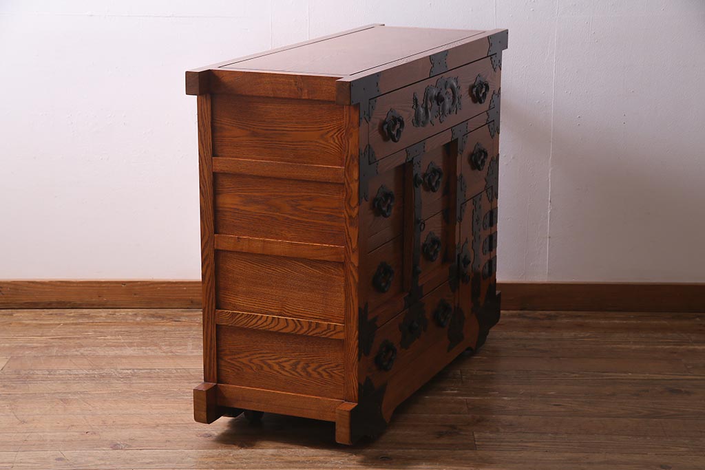 和箪笥> 帳場箪笥 > 新古品 民芸家具 楡(ニレ)材総無垢 重厚な金具が目を引く車箪笥(帳場箪笥、チェスト)(R-038294)