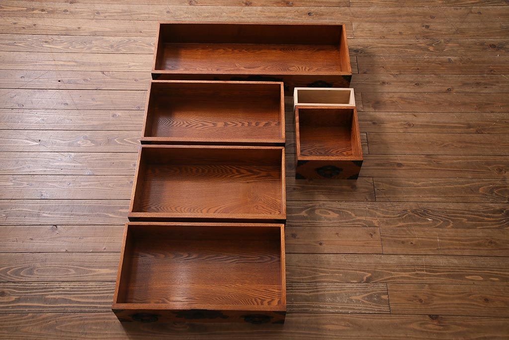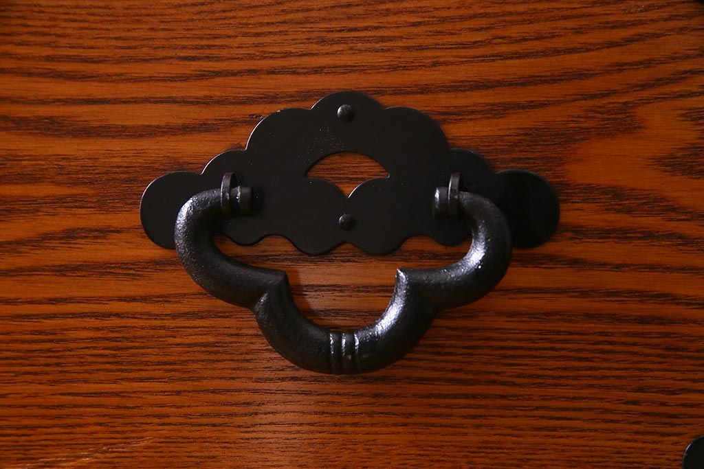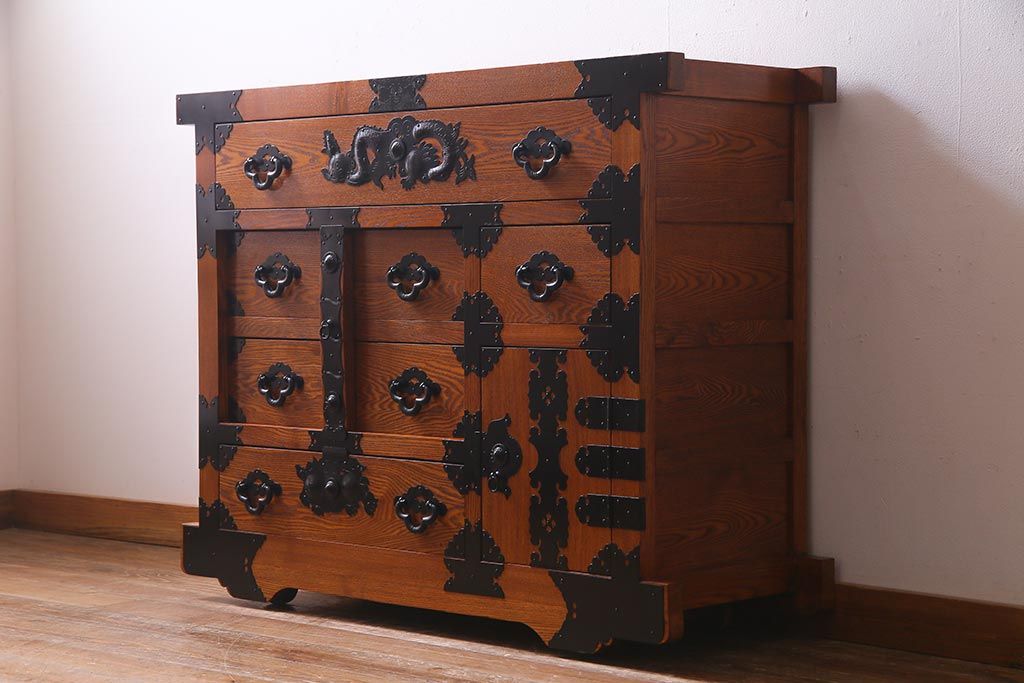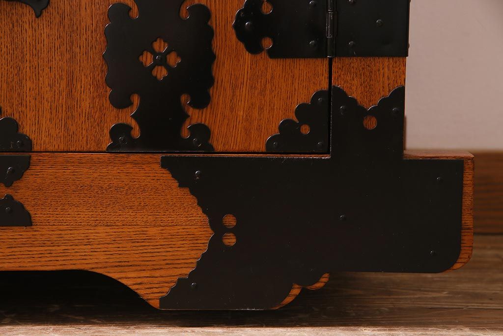 民芸家具 > 新古品 民芸家具 楡(ニレ)材総無垢 重厚な金具が目を引く車箪笥(帳場箪笥、チェスト)(R-038294)