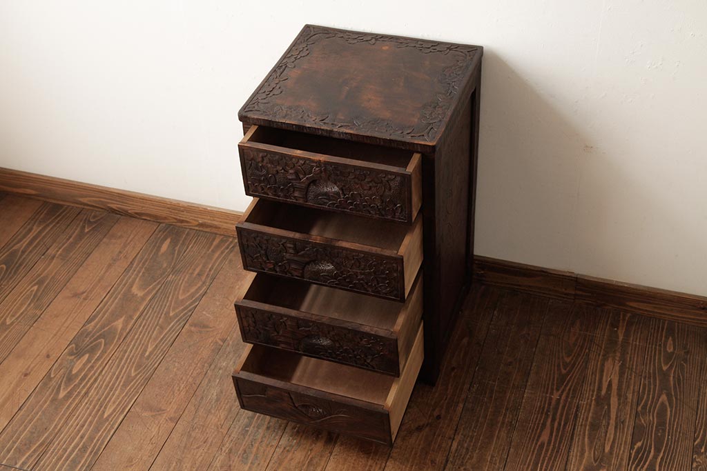 ビンテージ家具 伝統工芸 軽井沢彫り 桜の彫りが優美なチェスト(引き出し)(R-038298)
