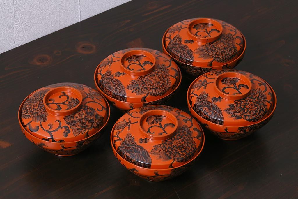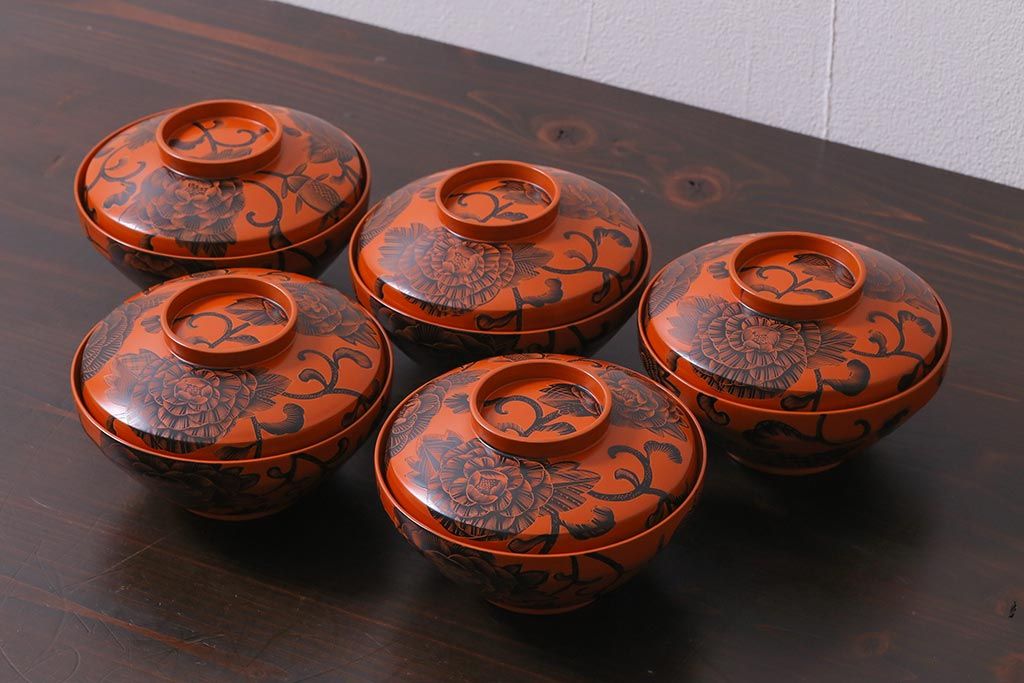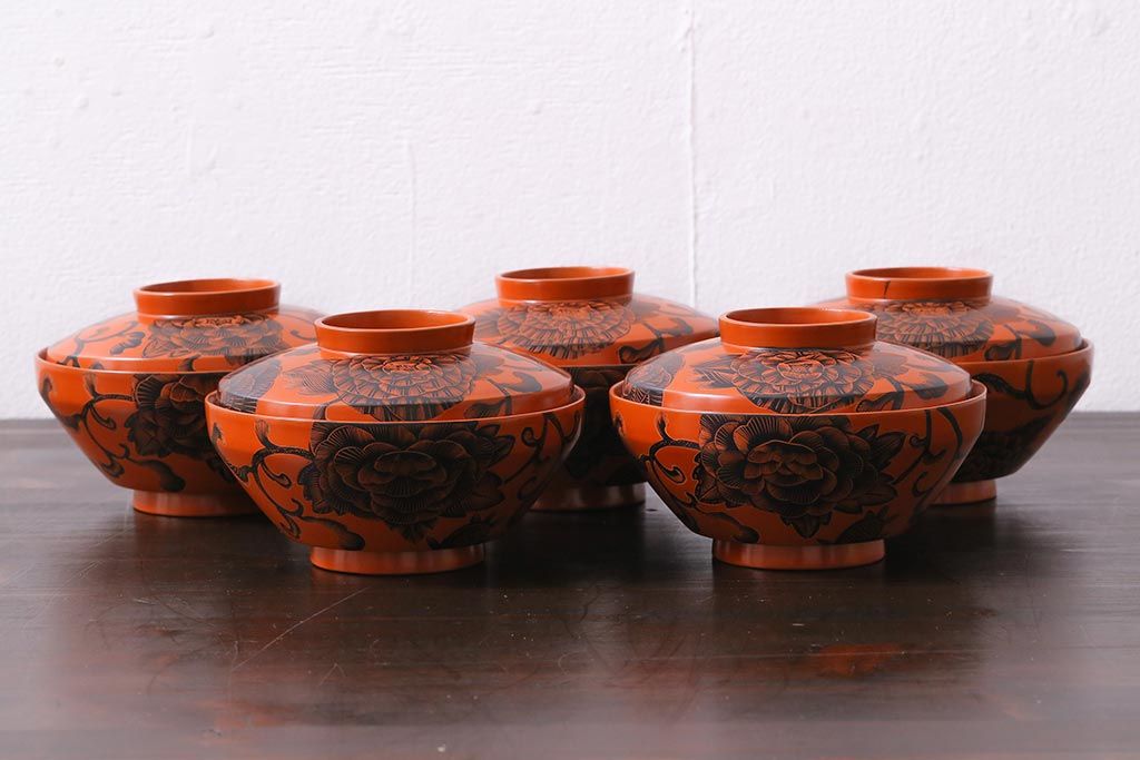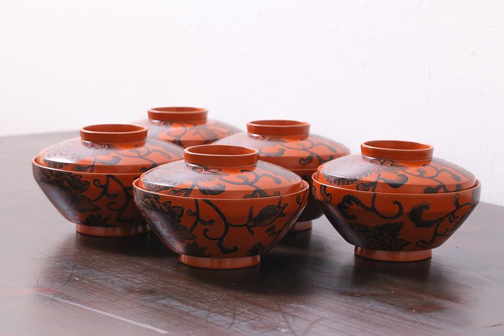 ラフジュ工房> 和食器・茶道具> お椀・茶碗 > アンティーク雑貨 大正期 漆塗り 沈黒・金蒔絵が贅沢な蓋付き木製椀5客セット(漆器、和食器)(R-038050)