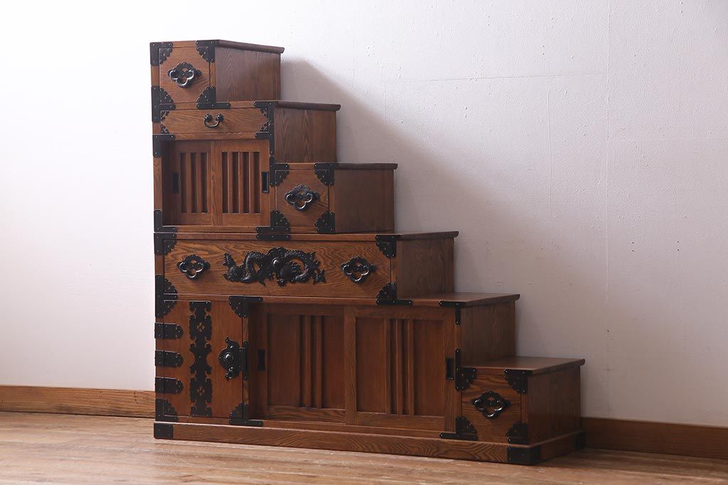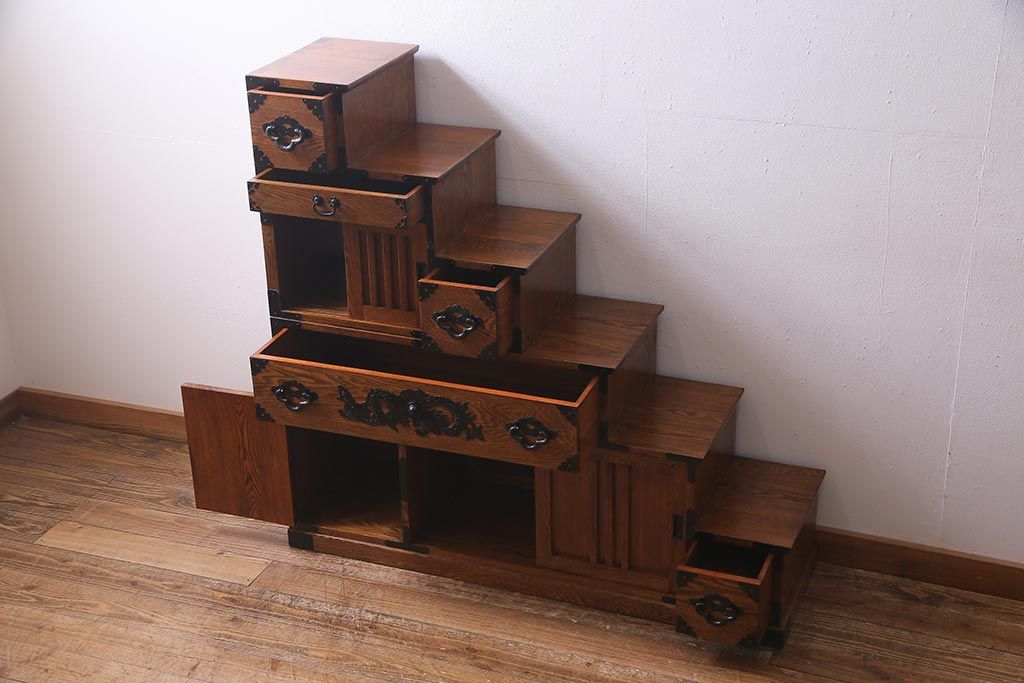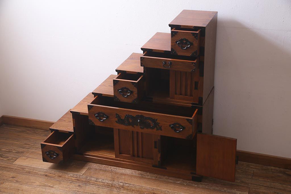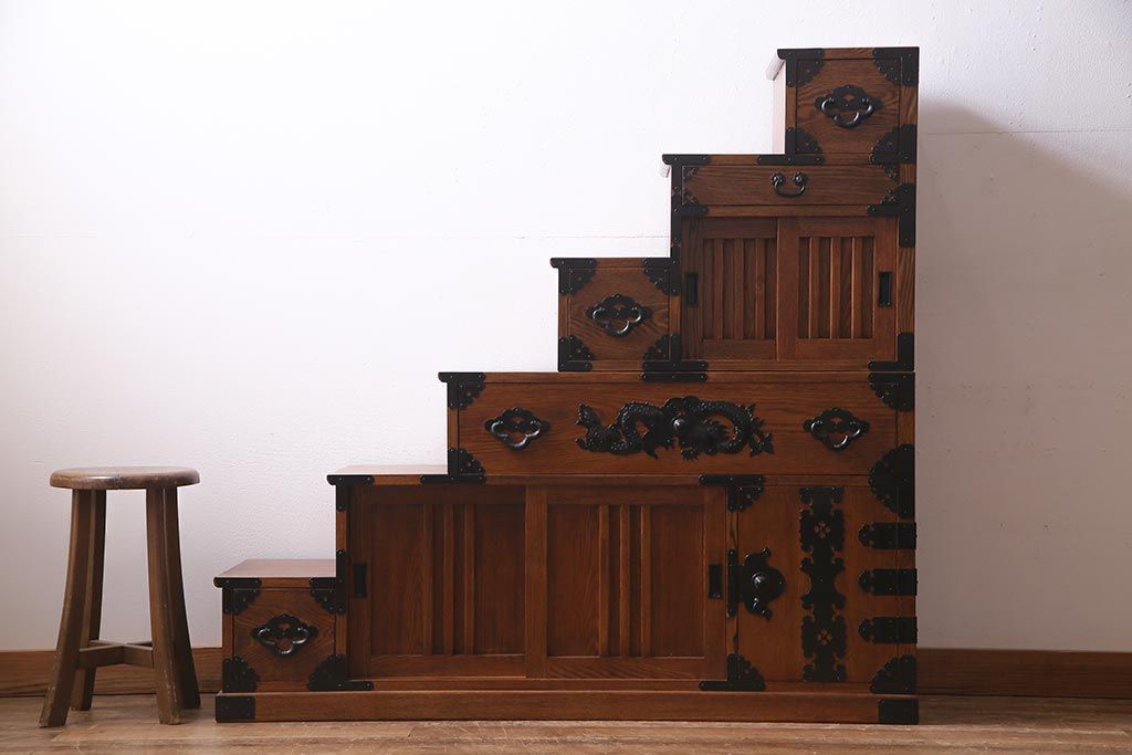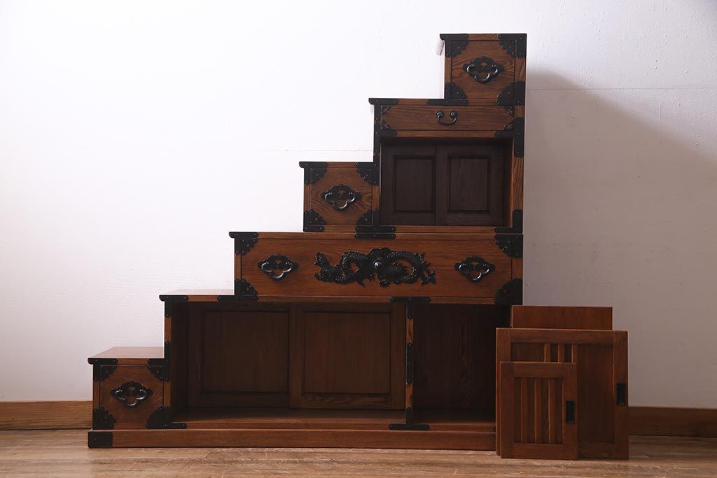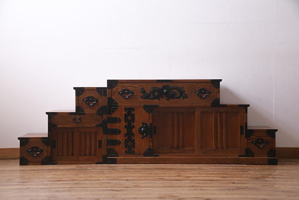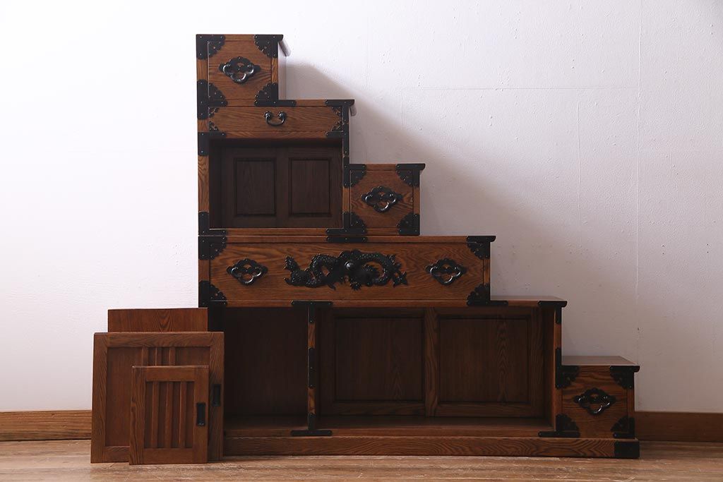 新古品 民芸家具 ニレ無垢材 雲竜金具 両面使い!ユニット型階段箪笥(和タンス)(R-038322)