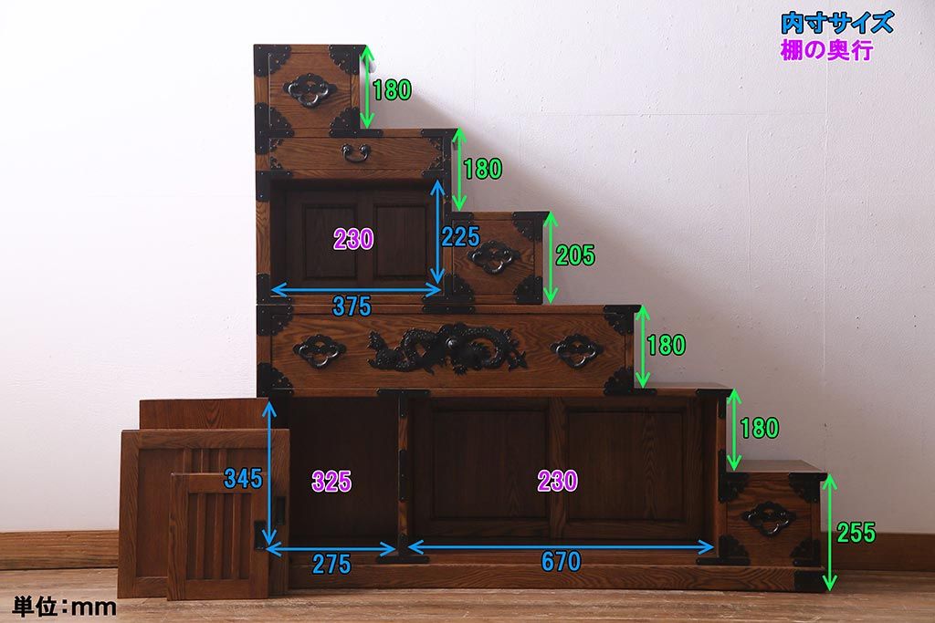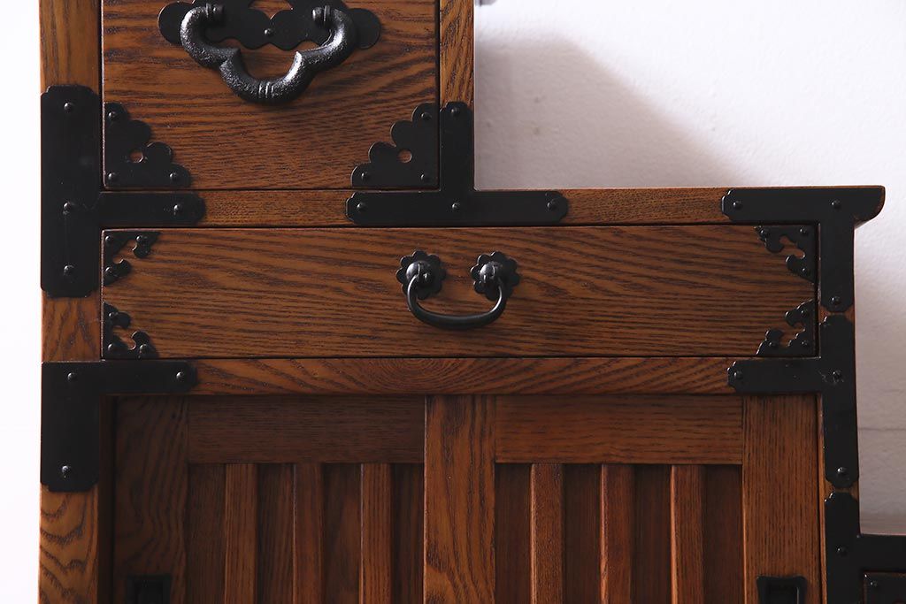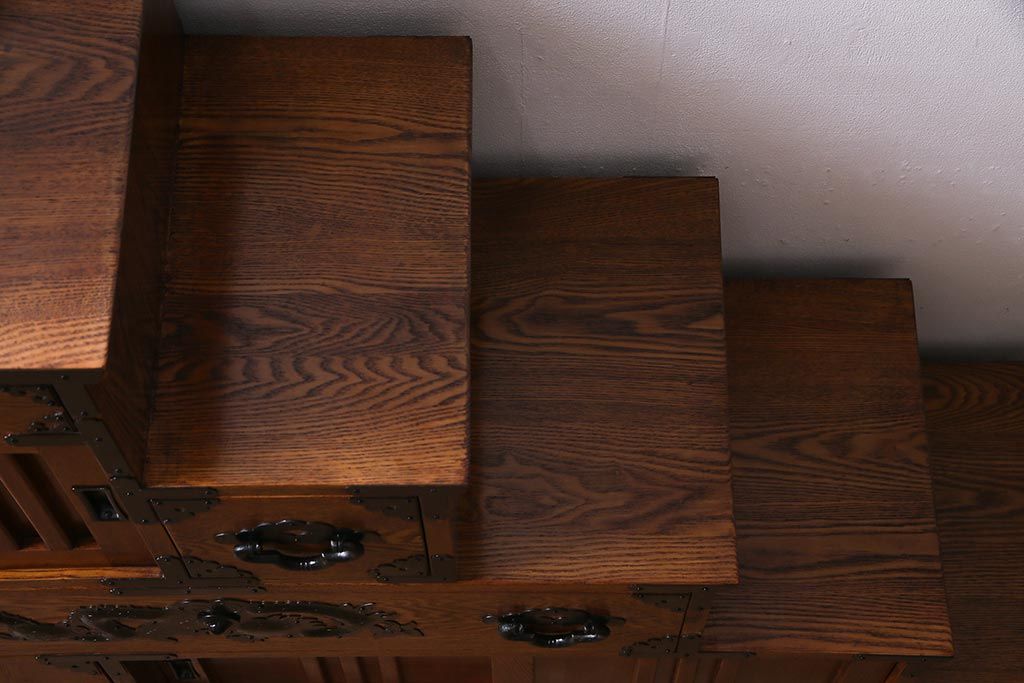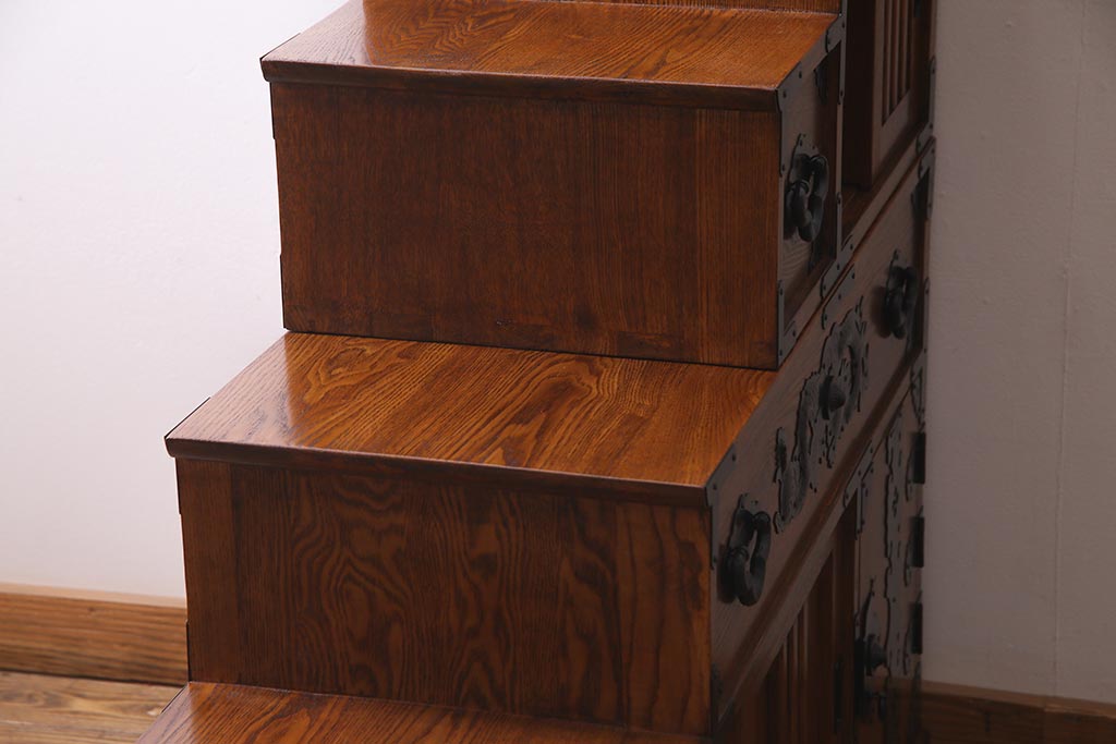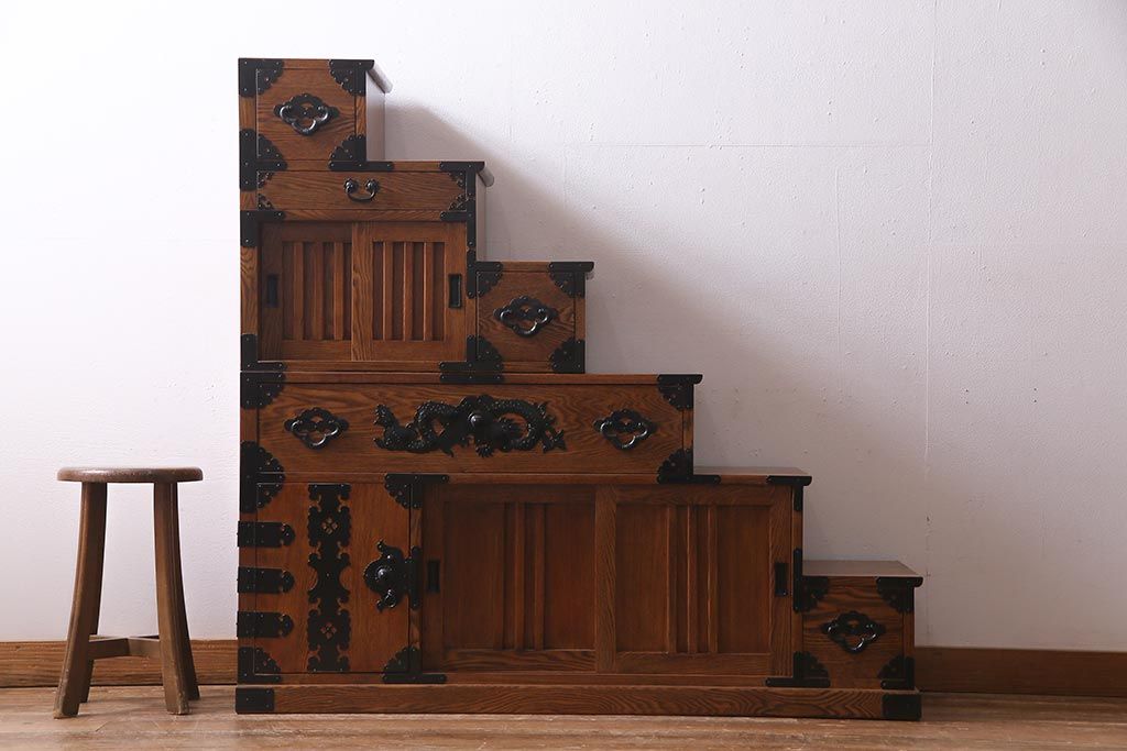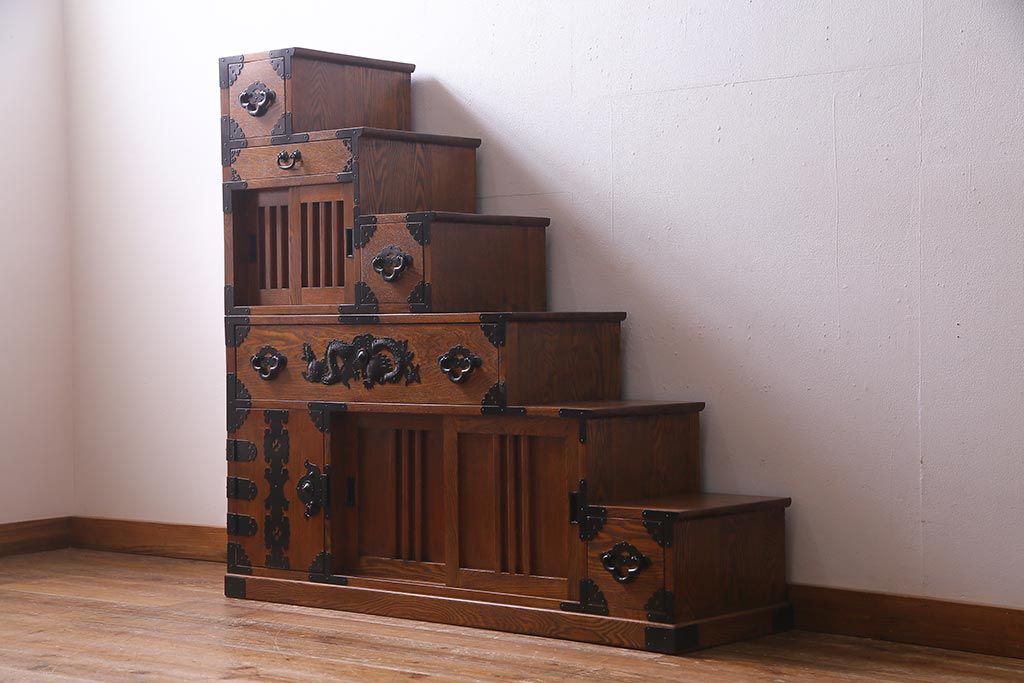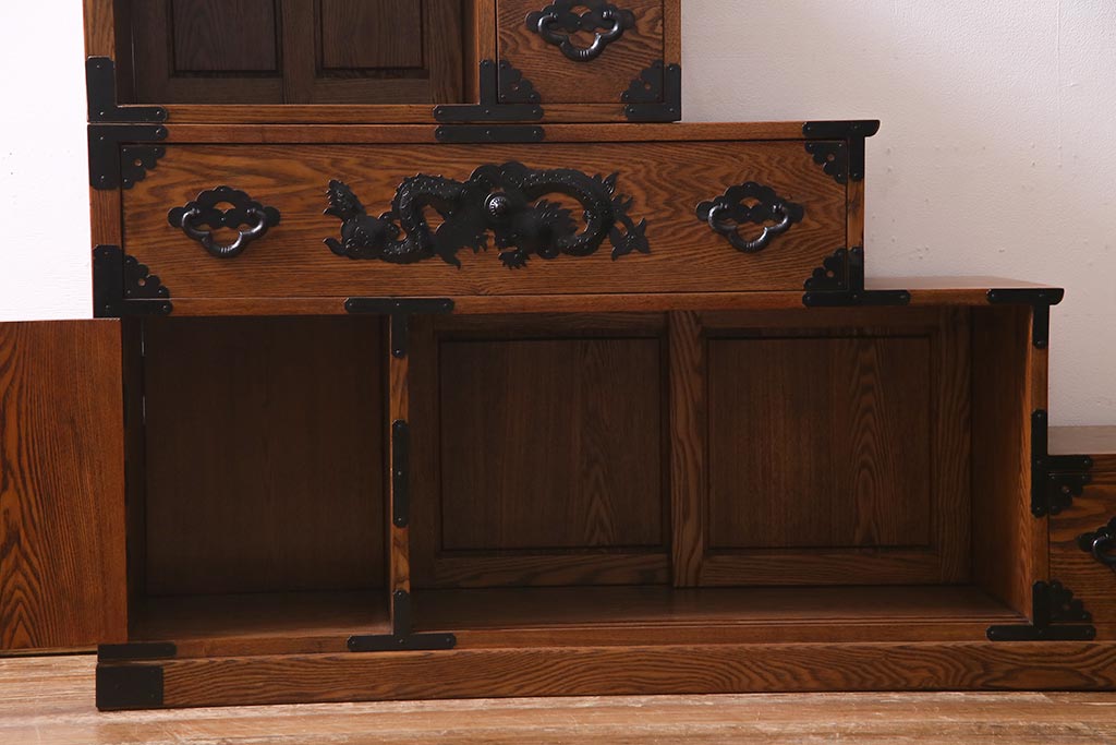 新古品 民芸家具 ニレ無垢材 雲竜金具 両面使い!ユニット型階段箪笥(和タンス)(R-038322)