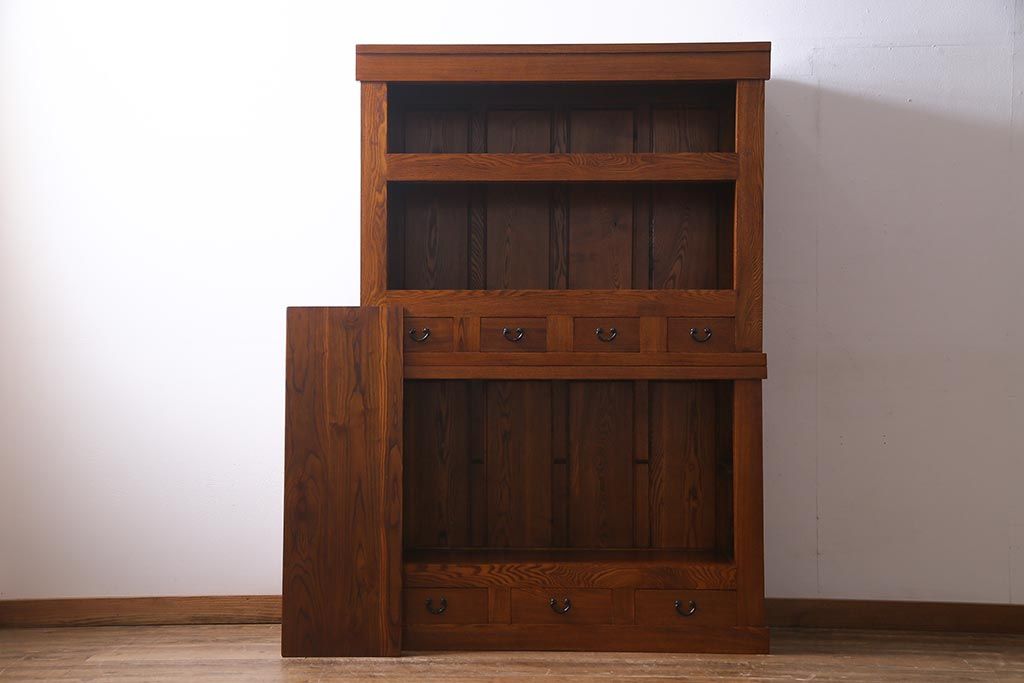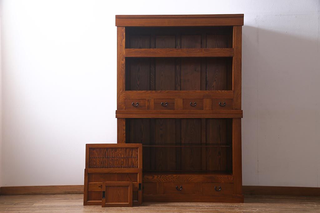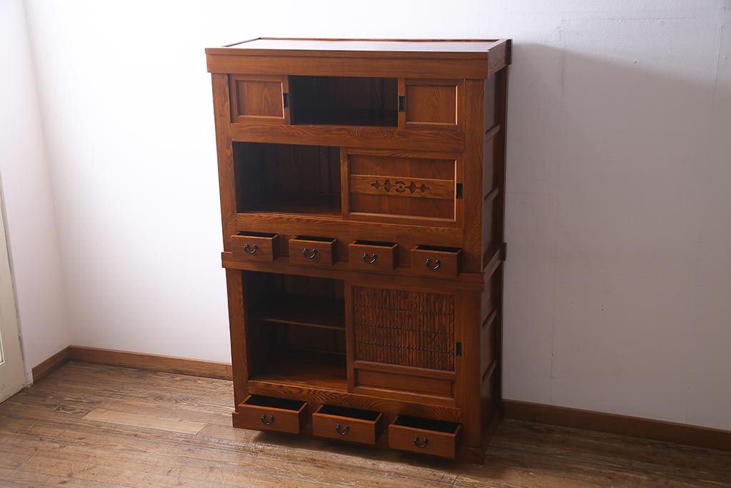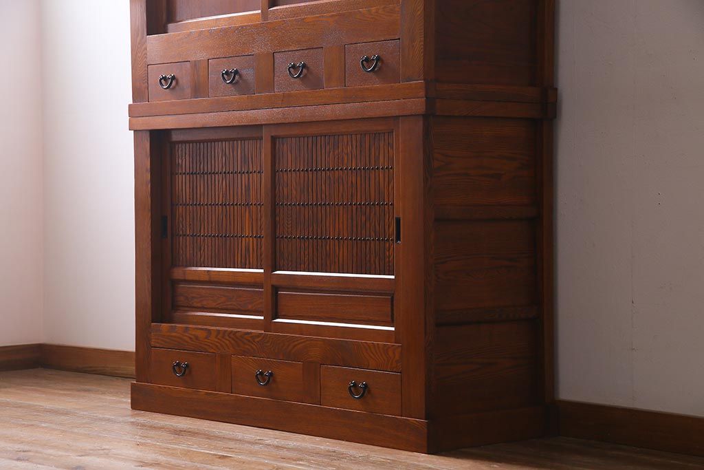 新古品 民芸家具 ニレ無垢材 上品な和の雰囲気を醸し出す重ね水屋箪笥(収納棚、戸棚)(R-038328)