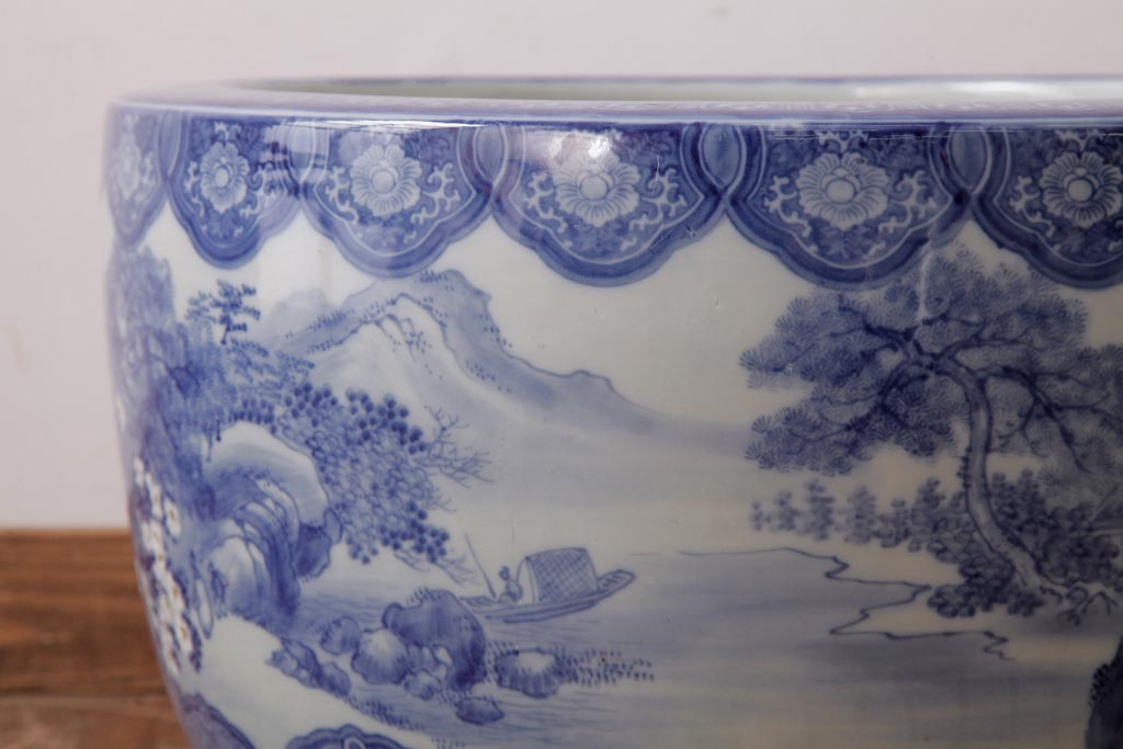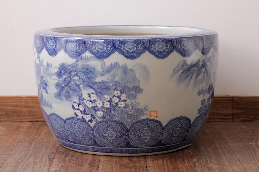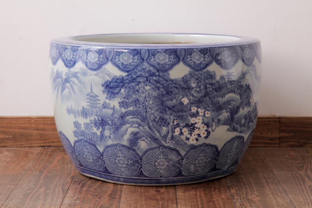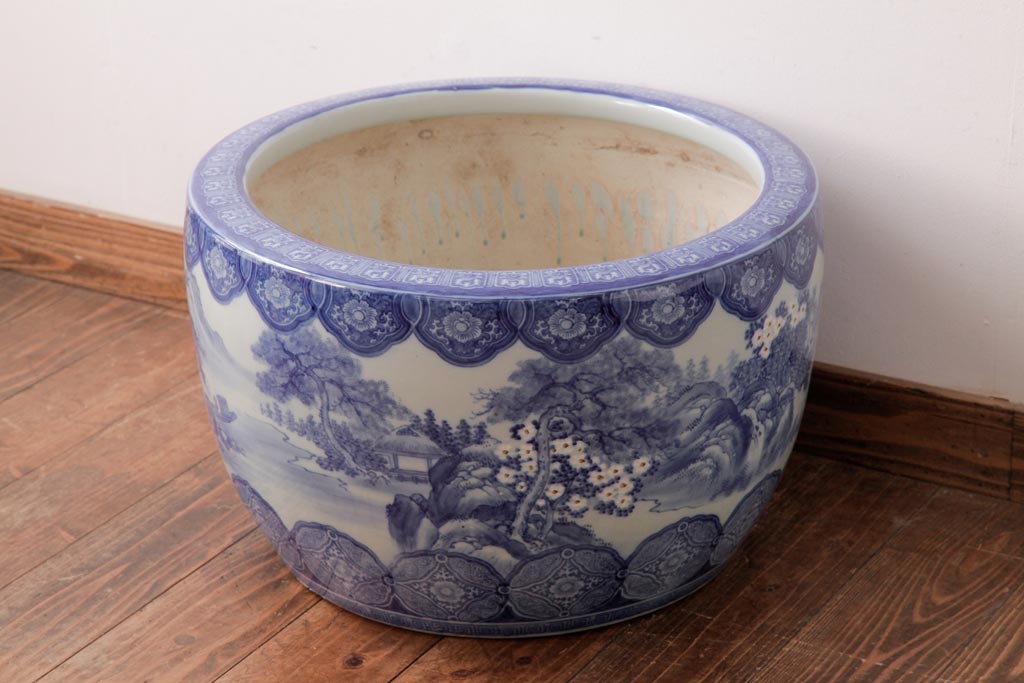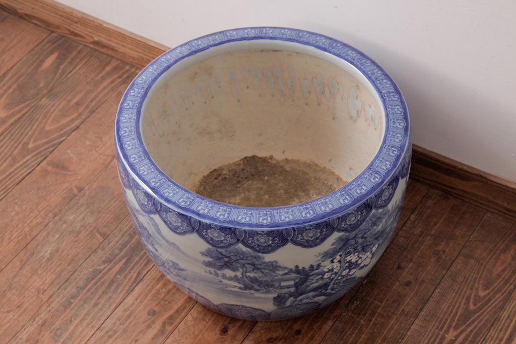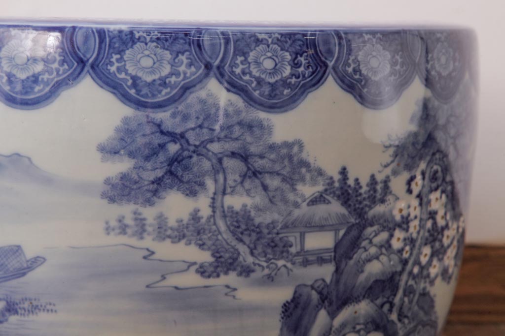 火鉢> 瀬戸火鉢 > アンティーク雑貨 昭和初期 山水図 繊細で優しげな風景画の瀬戸火鉢(R-038406)