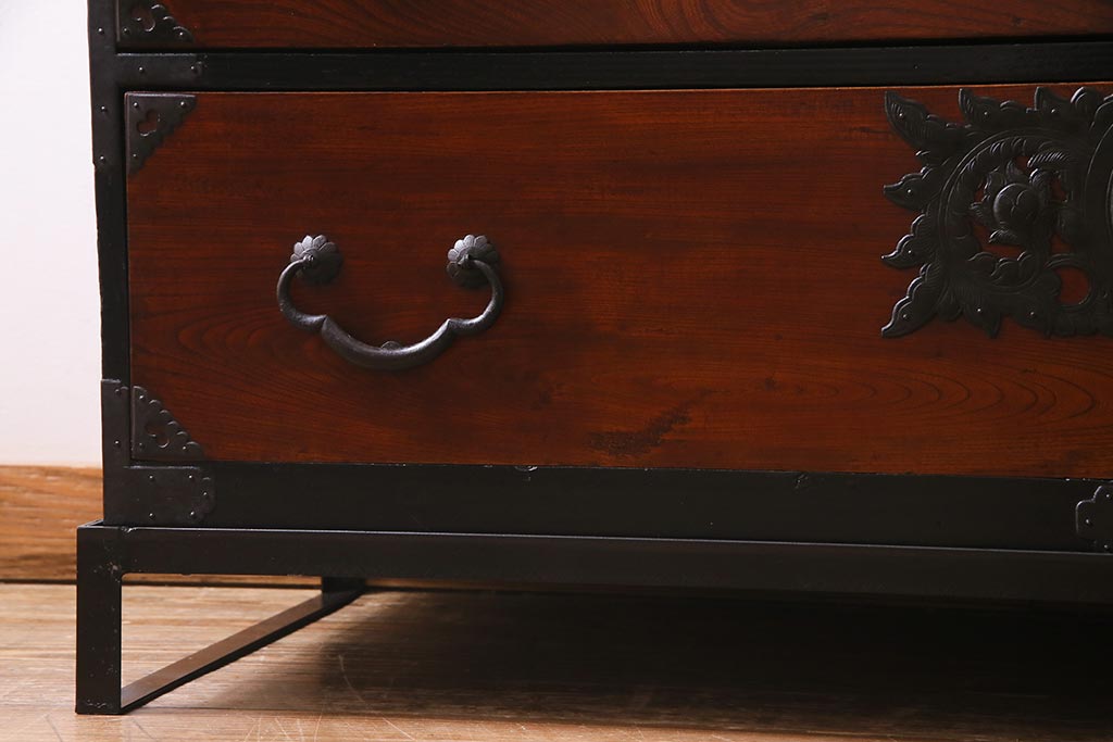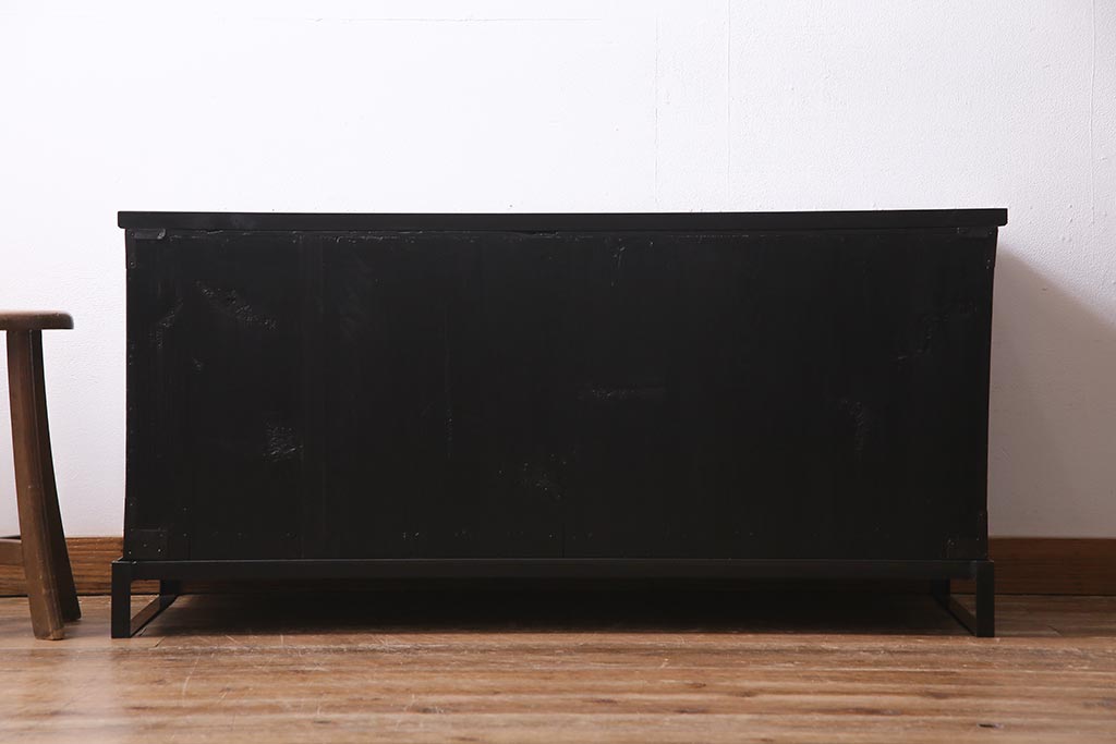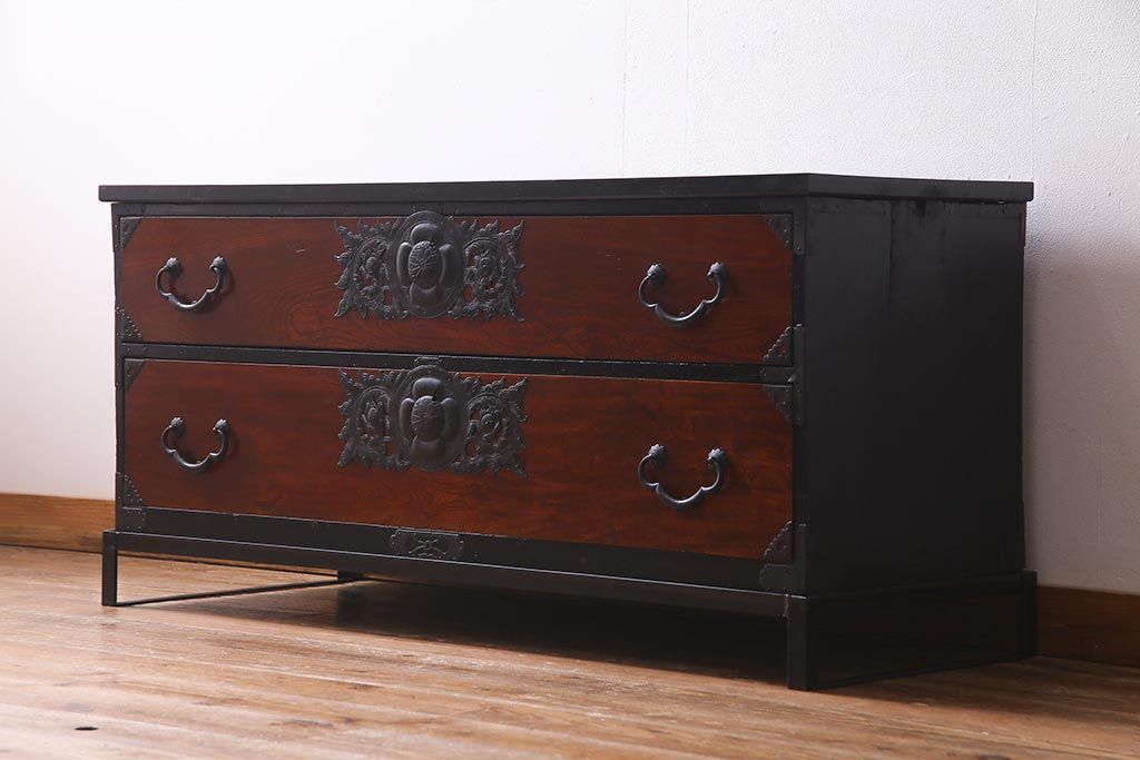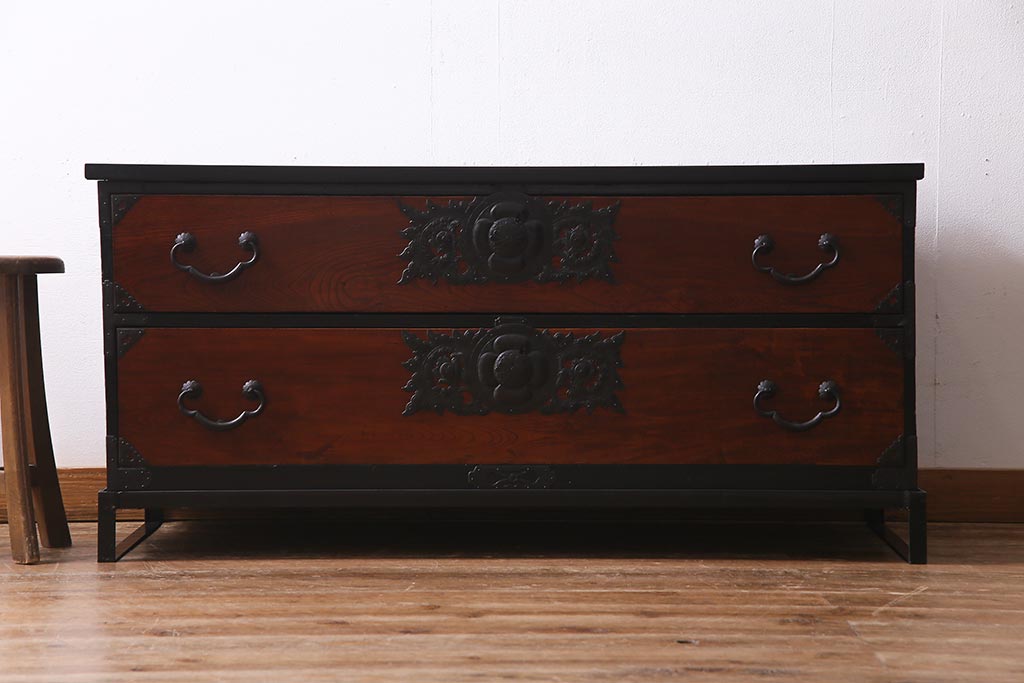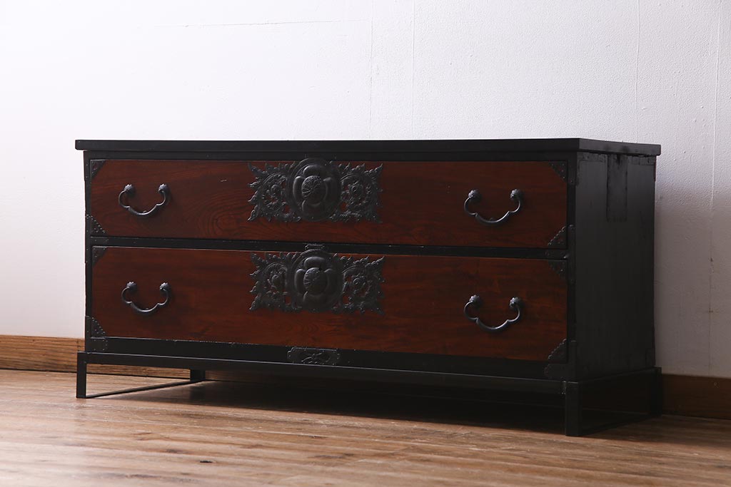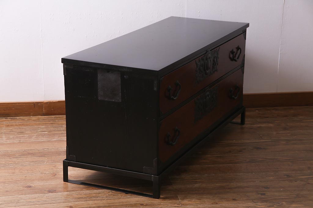 和箪笥> 衣装箪笥 > アンティーク家具 前面ケヤキ材漆塗り 台付きリメイク 和モダンな仙台箪笥ローチェスト(ローボード、引き出し、時代箪笥)(R-038348)