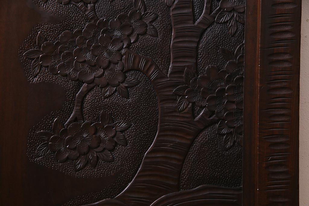 侘び寂感じる桜の木が2本、彫刻で描かれています。