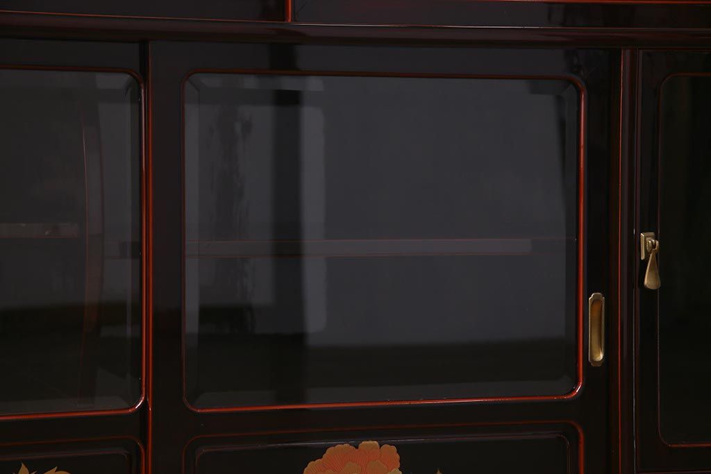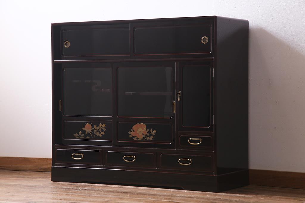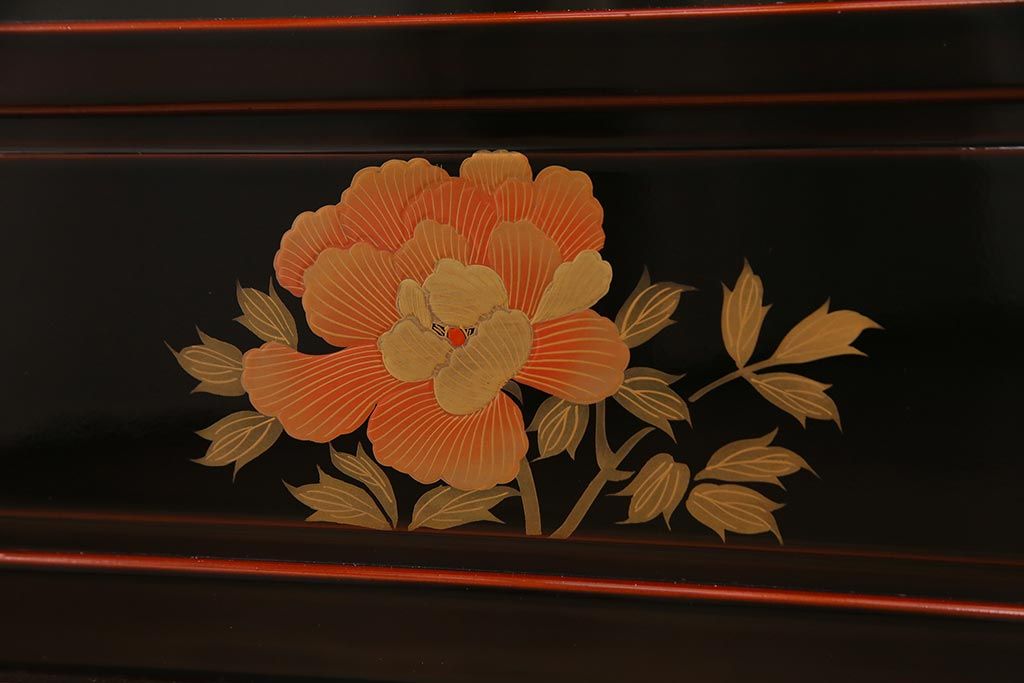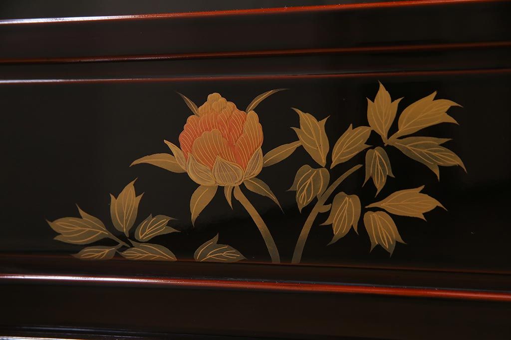 中古 工芸家具 桐材 漆・溜塗り 蒔絵の牡丹が美しい茶箪笥(タンス、飾り棚)(定価約90万円)(R-038345)です。