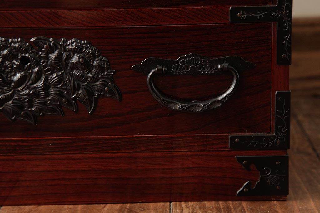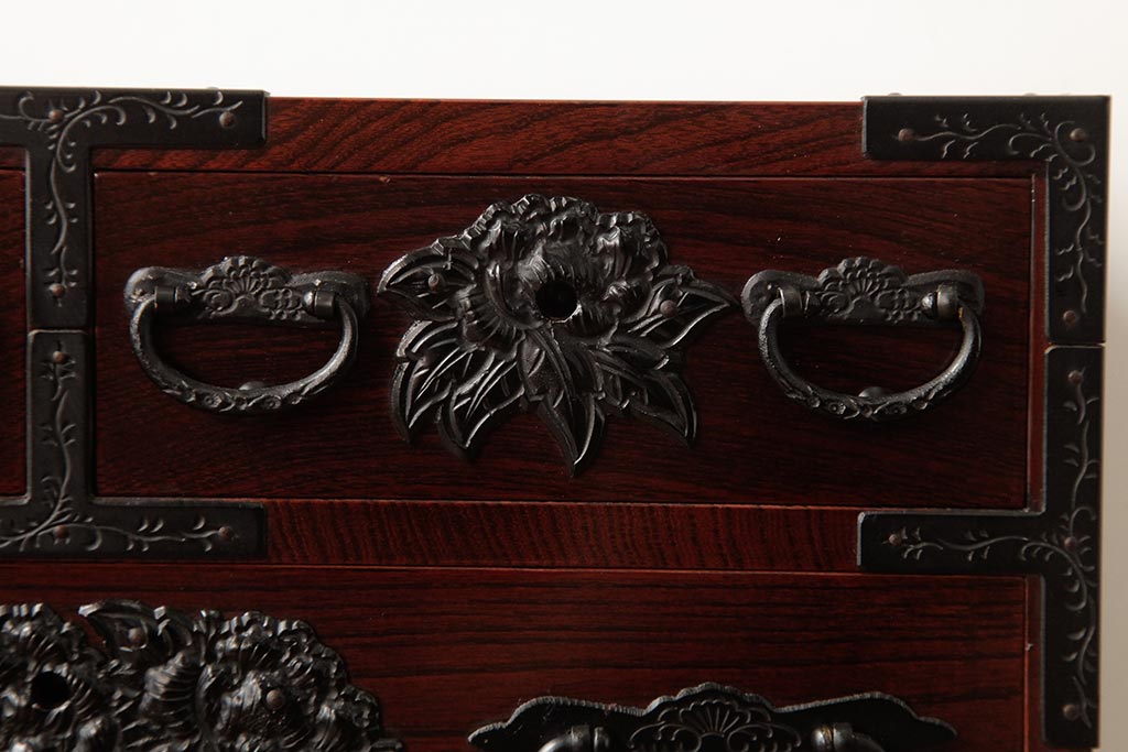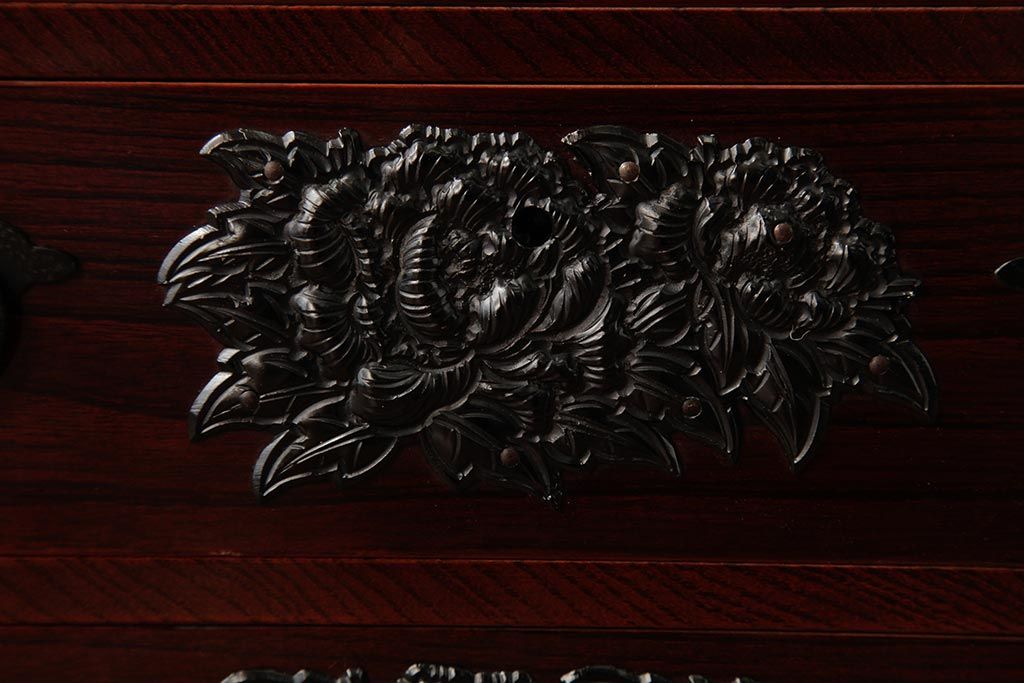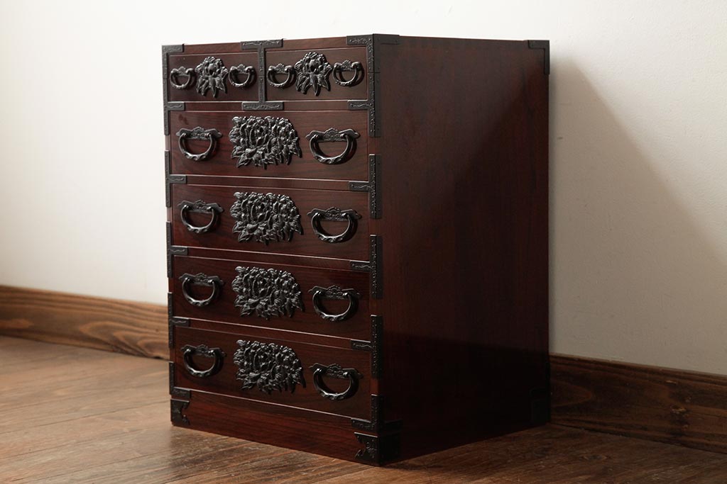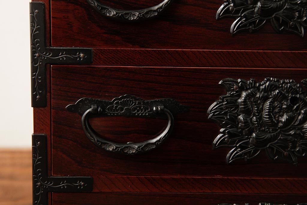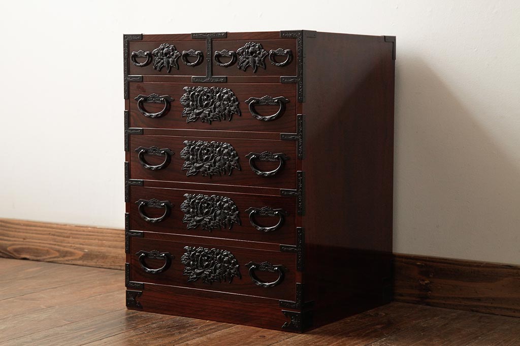 和箪笥 > 中古 仙台箪笥 門間箪笥店(門間屋) ケヤキ材 木地呂塗 牡丹をあしらった金具が美しい小箪笥 (収納棚、引き出し)(R-038329)