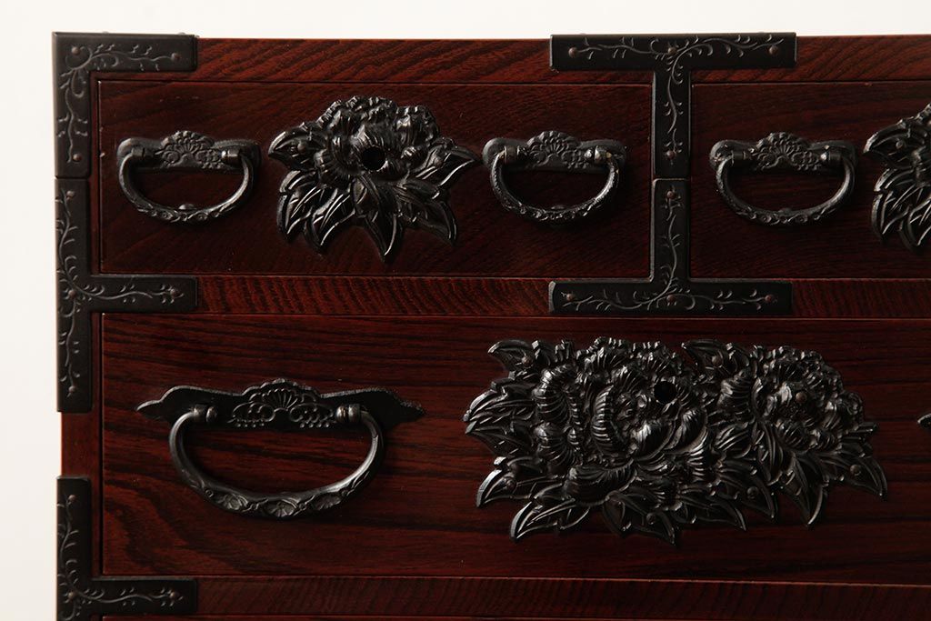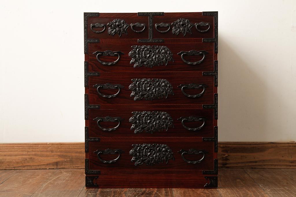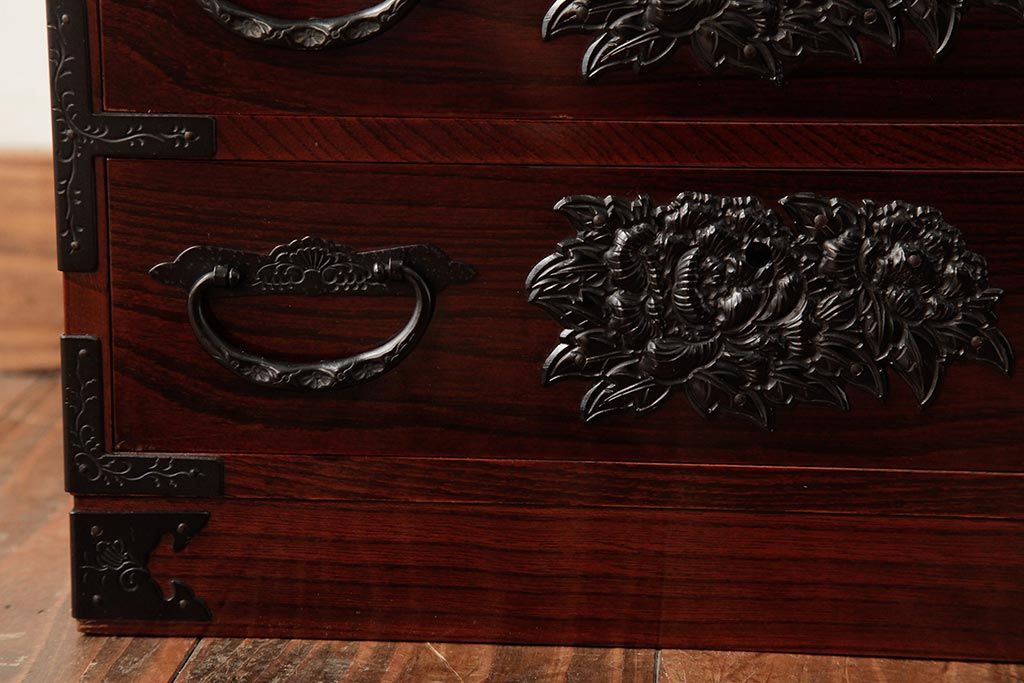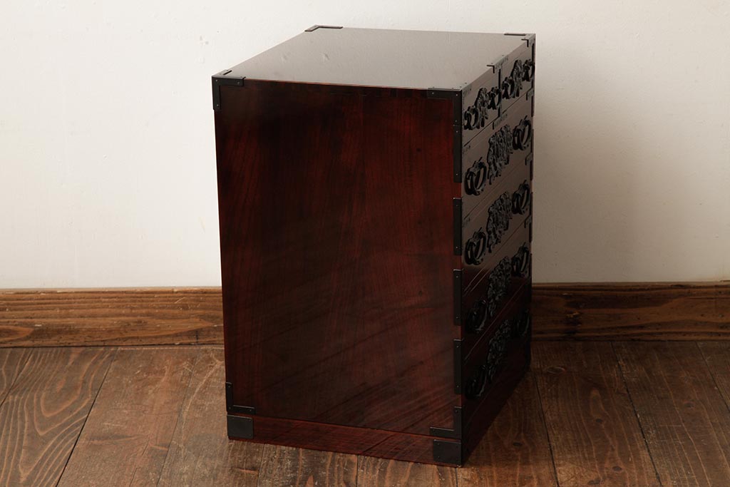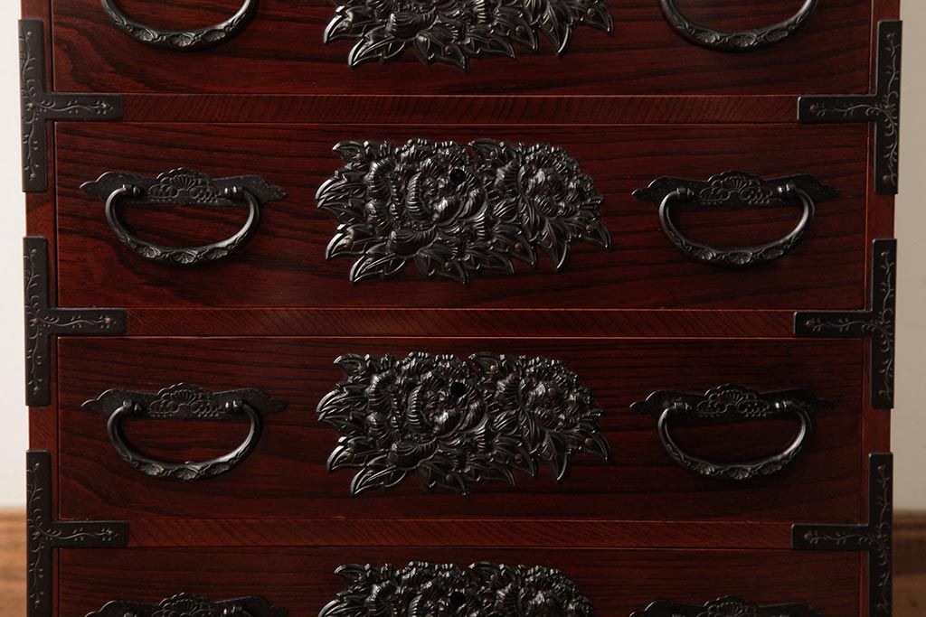 和箪笥> 小箪笥 > 中古 仙台箪笥 門間箪笥店(門間屋) ケヤキ材 木地呂塗 牡丹をあしらった金具が美しい小箪笥 (収納棚、引き出し)(R-038329)