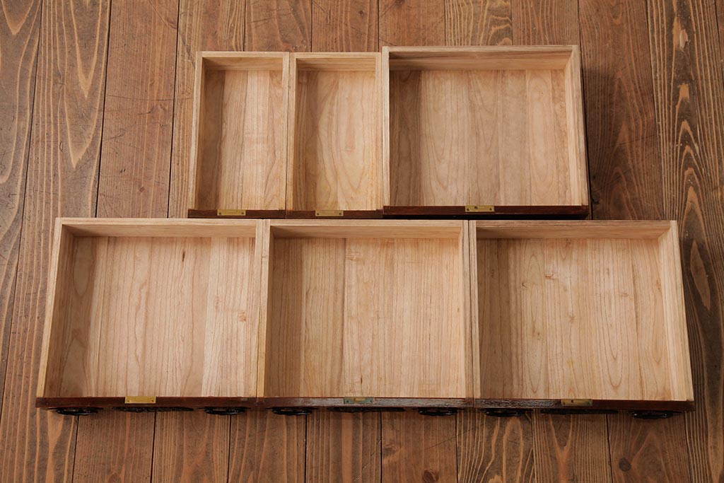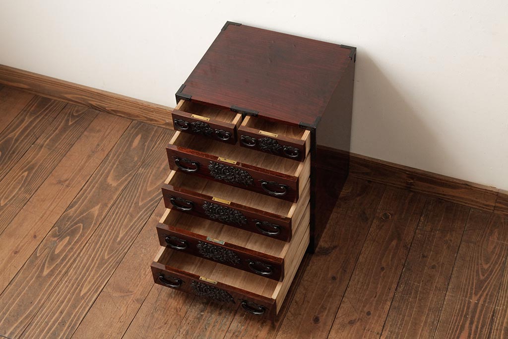 中古 仙台箪笥 門間箪笥店(門間屋) ケヤキ材 木地呂塗 牡丹をあしらった金具が美しい小箪笥 (収納棚、引き出し)(R-038329)
