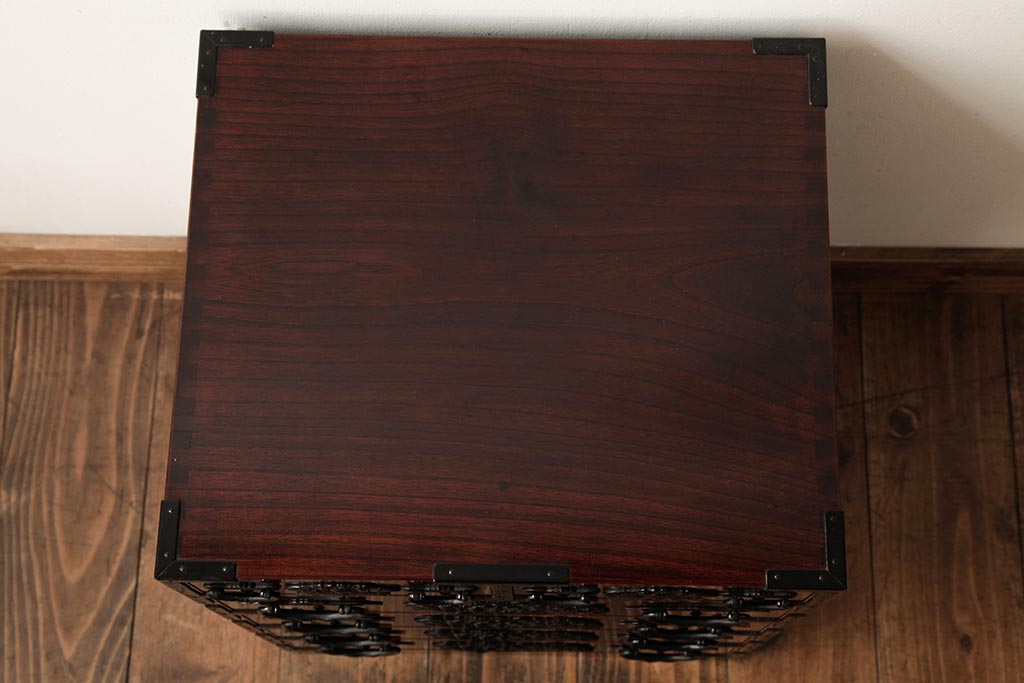 中古 仙台箪笥 門間箪笥店(門間屋) ケヤキ材 木地呂塗 牡丹をあしらった金具が美しい小箪笥 (収納棚、引き出し)(R-038329)です。