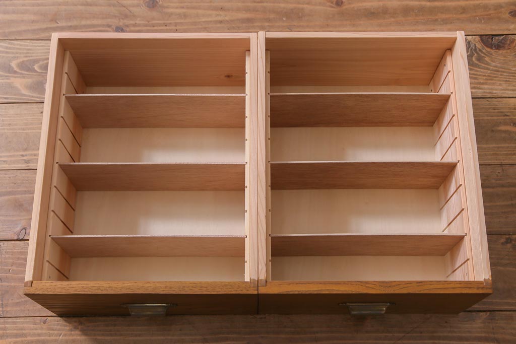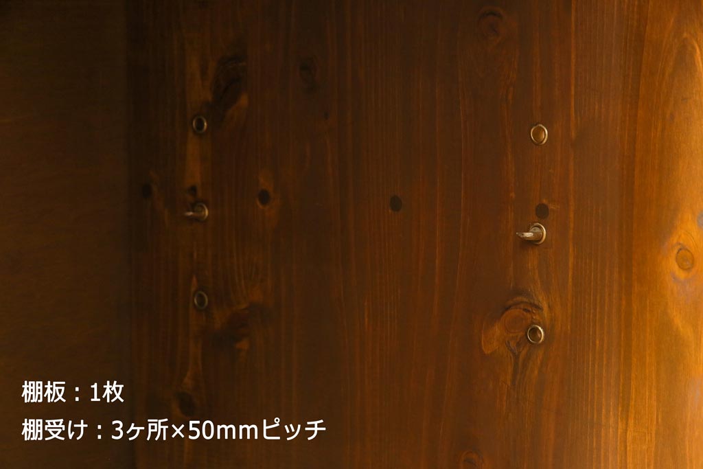 棚板は取り外しできます。棚板は1枚あります。棚受けは3ヶ所、50mmピッチで調整できます。棚幅サイズのものが1枚の作りです。