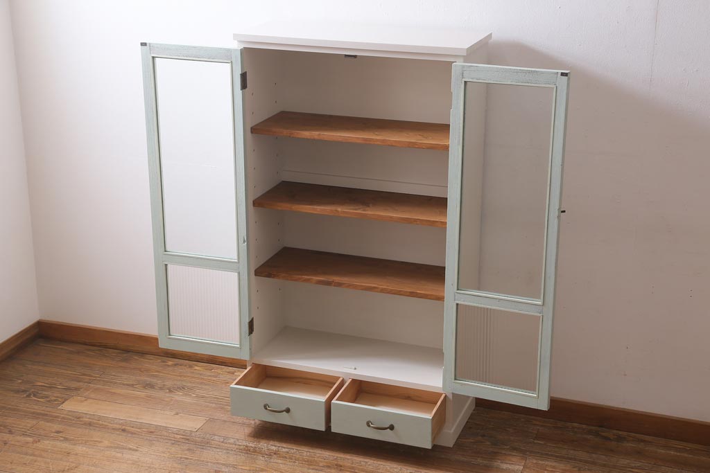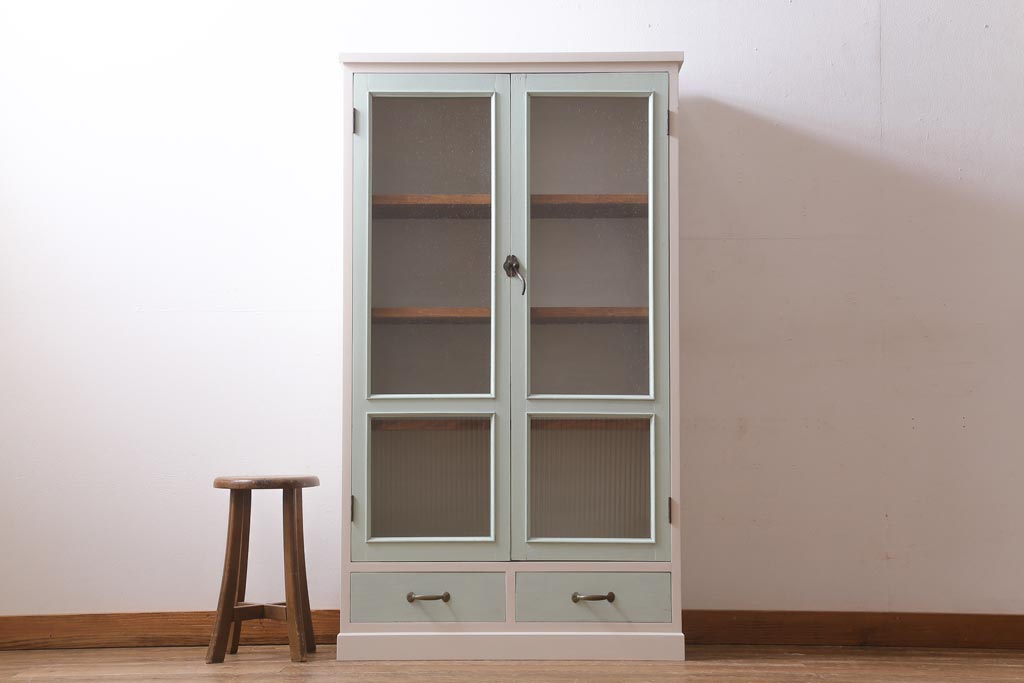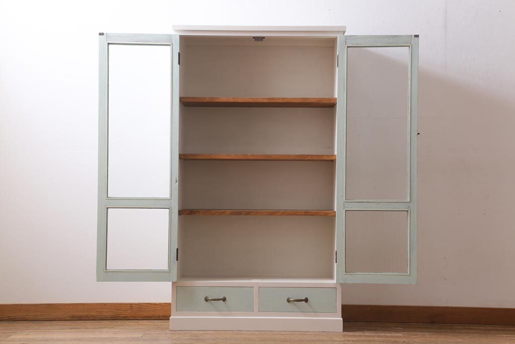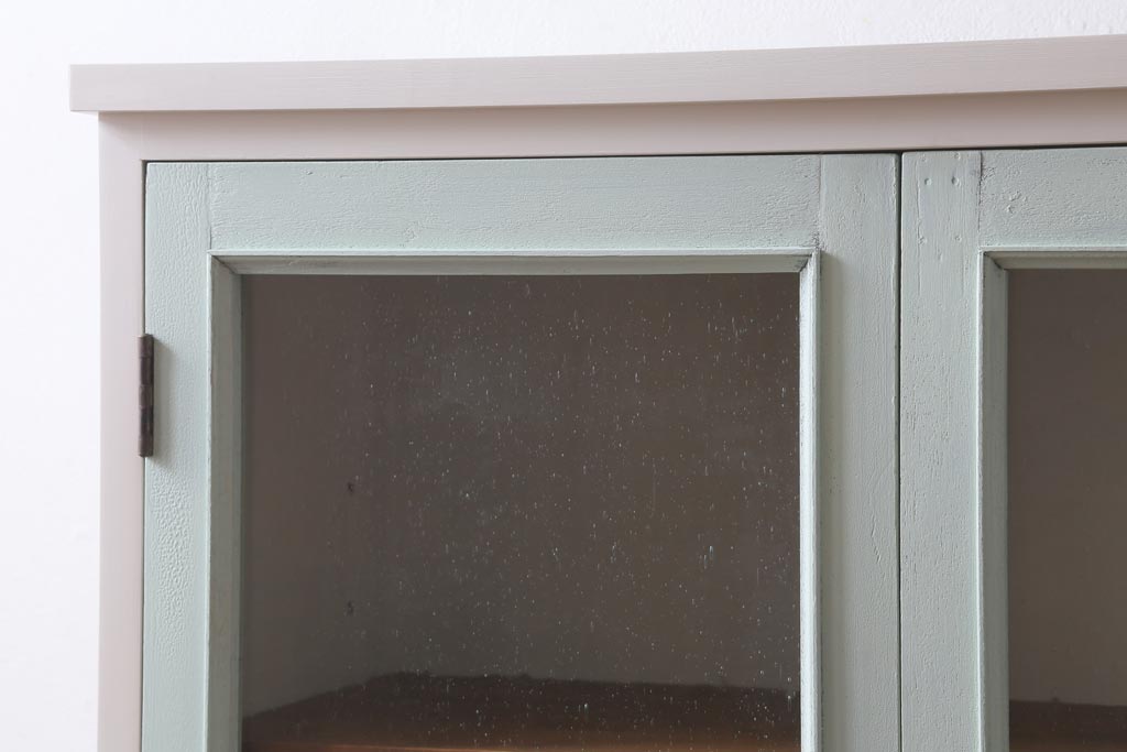 キャビネット・戸棚> 本箱 > ラフジュ工房オリジナル 古建具リメイク 気泡ガラス・モールガラス 淡いペイントがお洒落なブックケース(本箱、収納棚、キャビネット)(R-038517)
