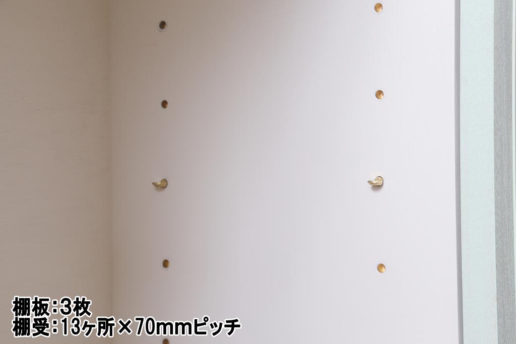 棚板は取り外しできます。棚板は3枚あります。棚受けは13ヶ所、70mmピッチで調整できます。棚幅サイズのものが1枚の作りです。