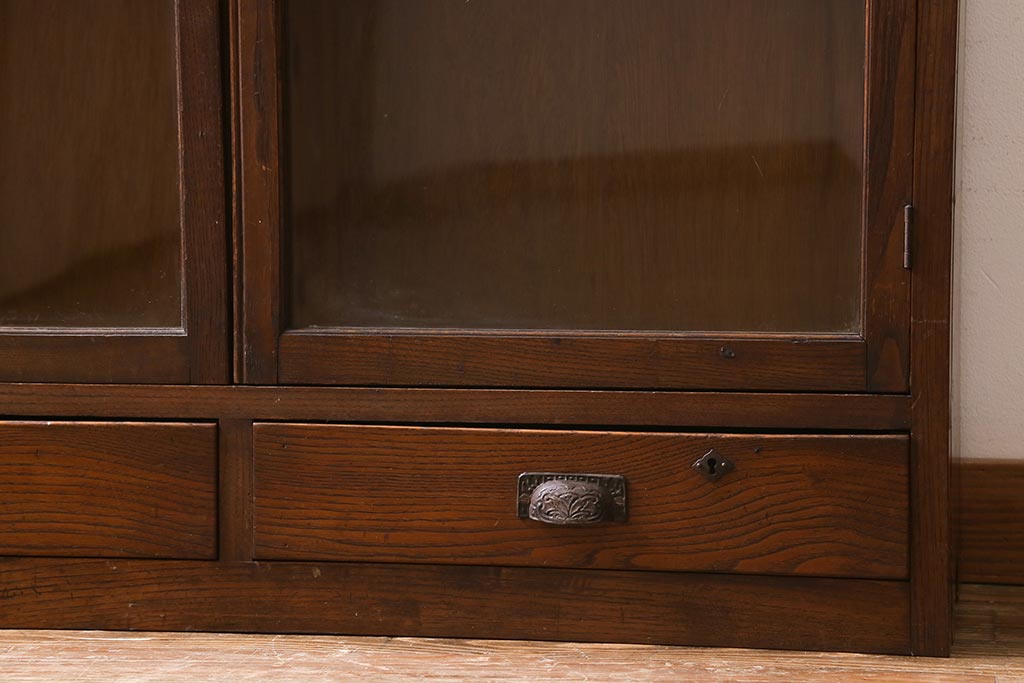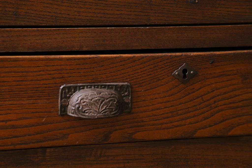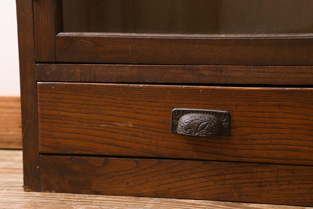 キャビネット・戸棚> 本箱 > アンティーク家具 昭和初期 三方栗材 味わいのある木味が魅力のレトロな引き出し付き本箱(ブックケース、収納棚)(R-038431)