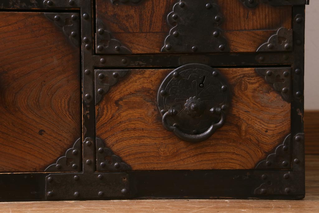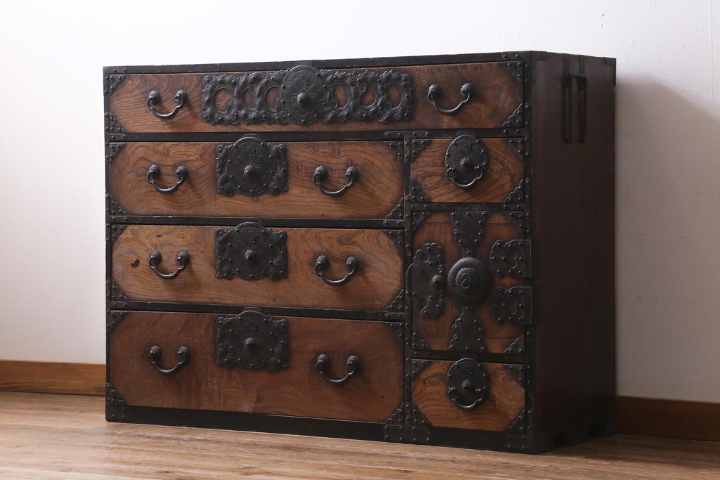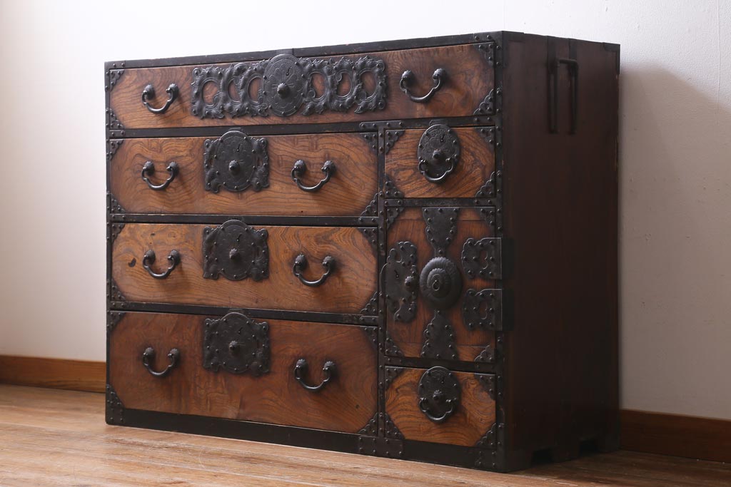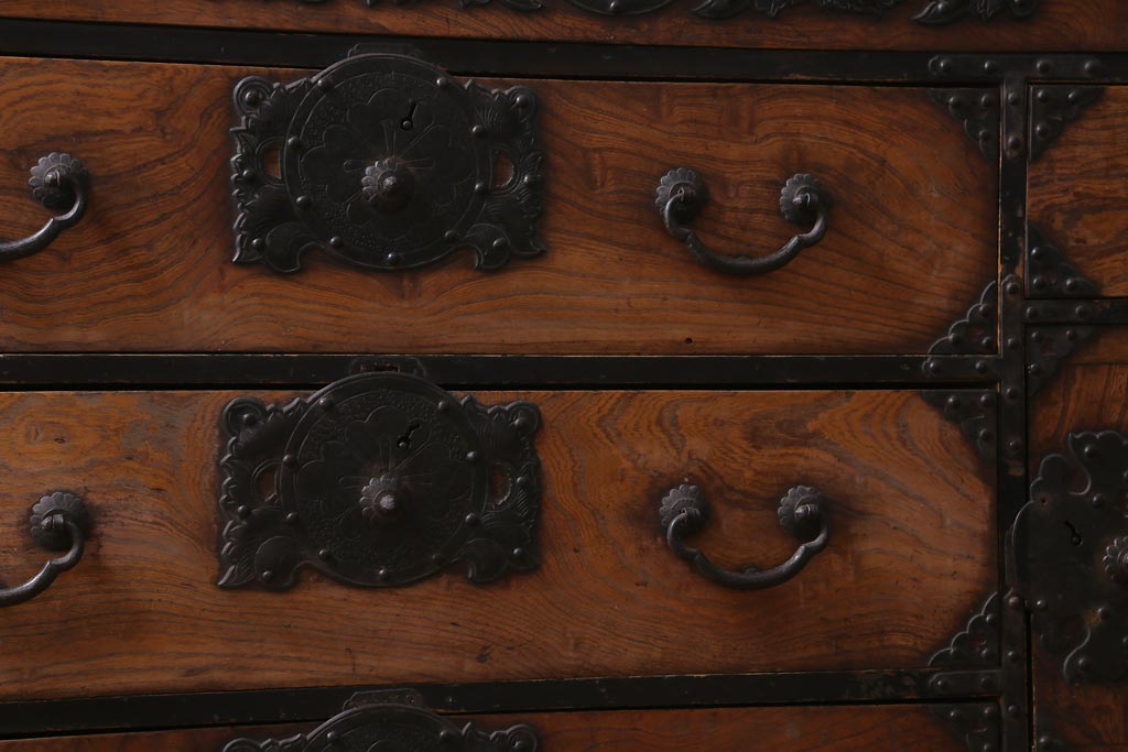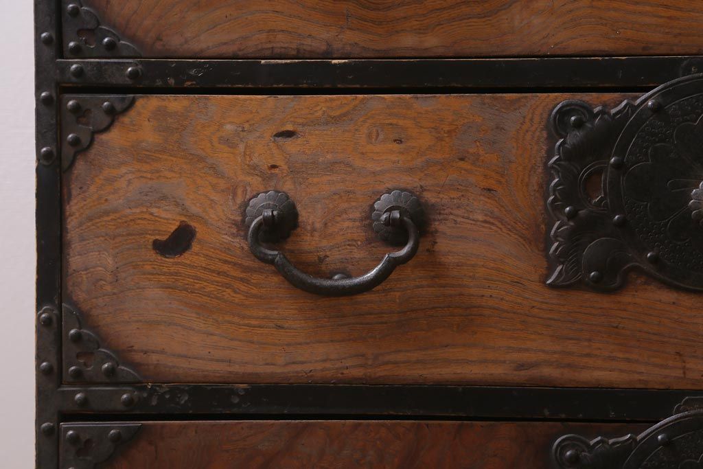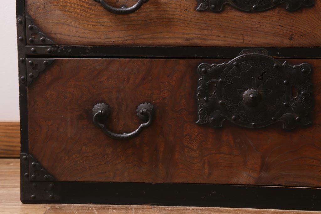 和箪笥> 衣装箪笥 > アンティーク家具 和製アンティーク 前面ケヤキ材 味わいのある杢目が目を引く仙台箪笥(衣装箪笥、和タンス)(R-038609)