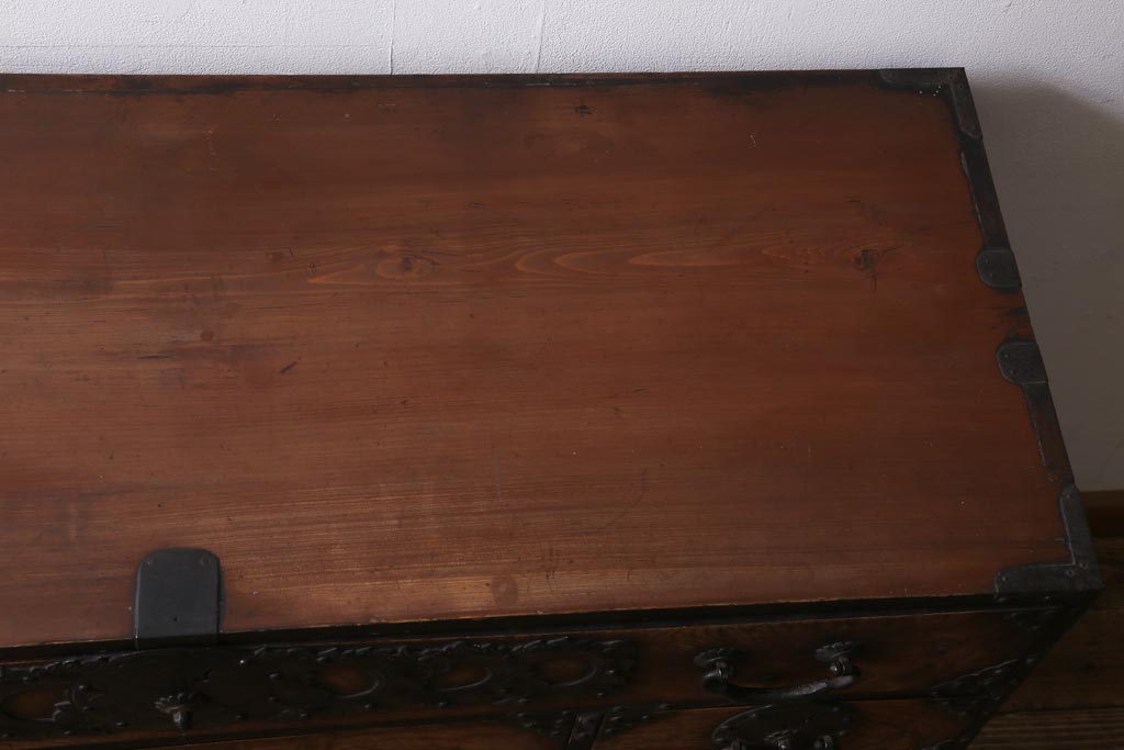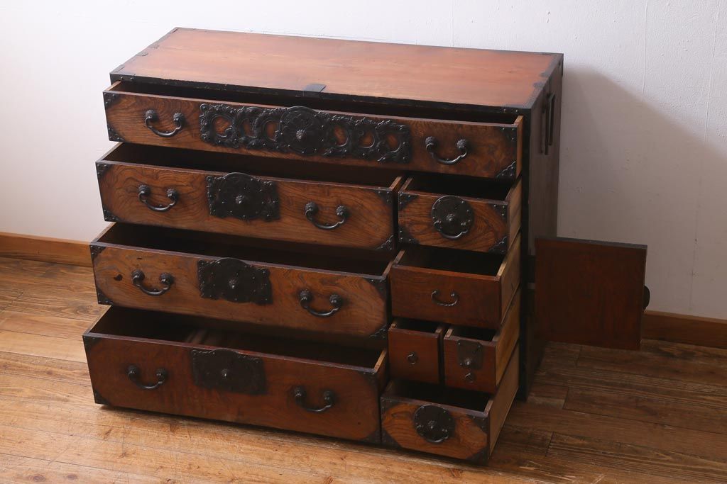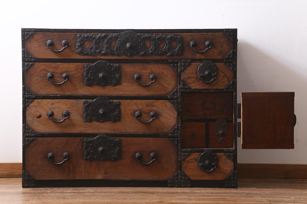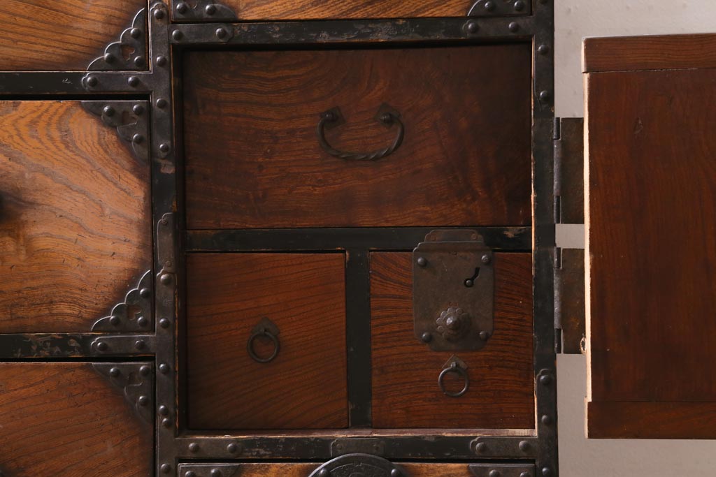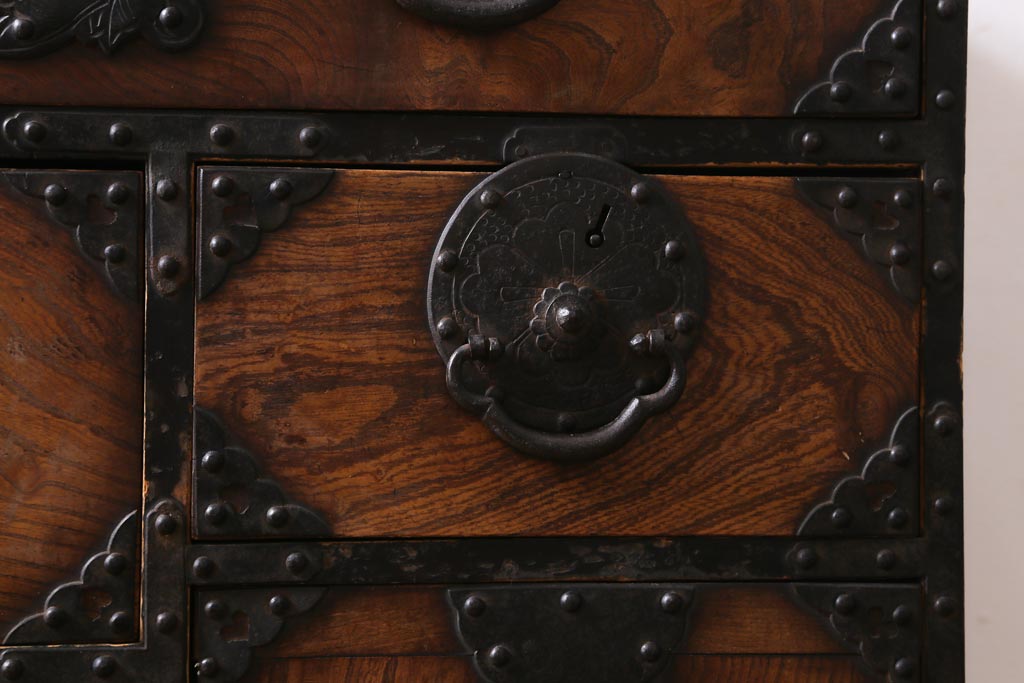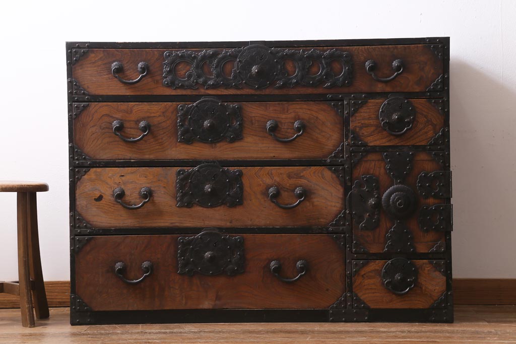 和箪笥> 衣装箪笥 > アンティーク家具 和製アンティーク 前面ケヤキ材 味わいのある杢目が目を引く仙台箪笥(衣装箪笥、和タンス)(R-038609)