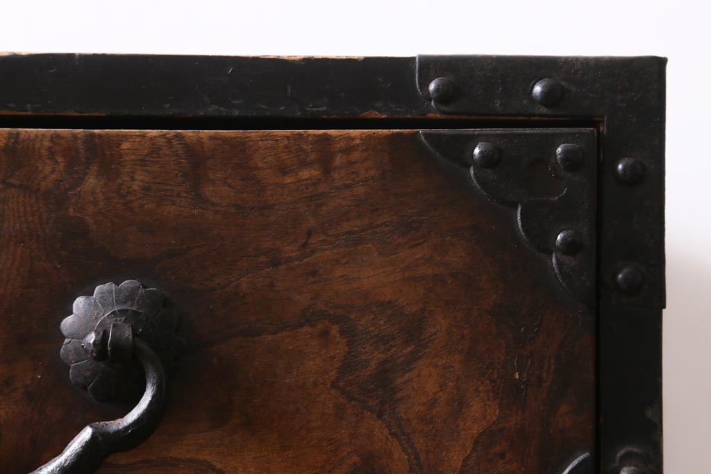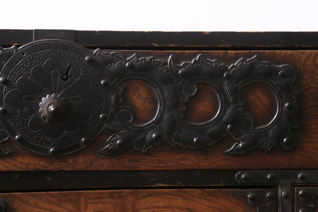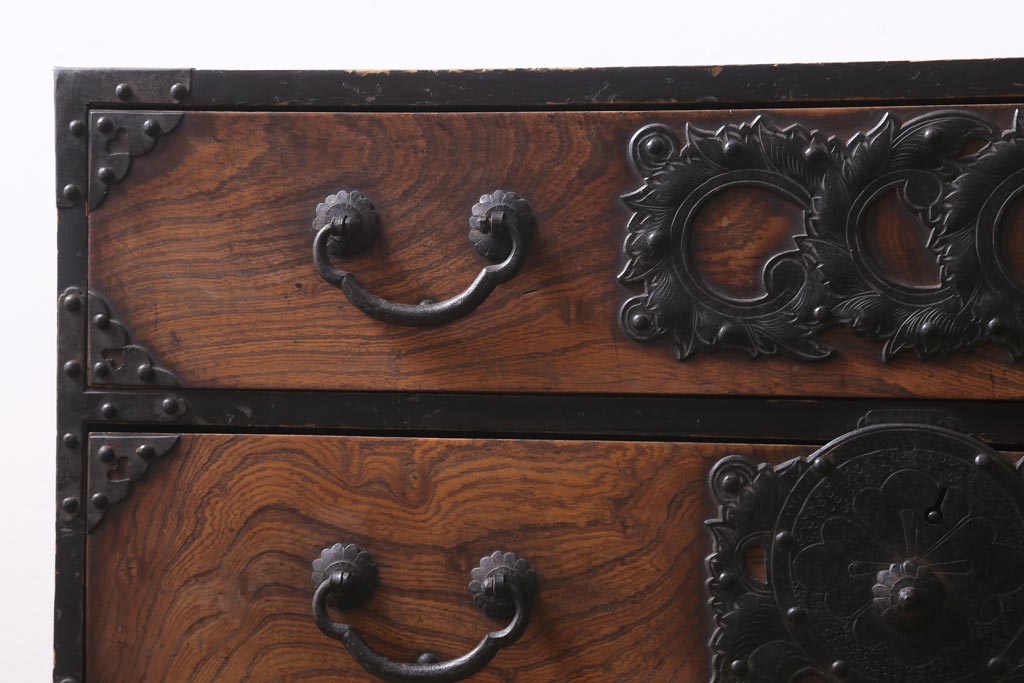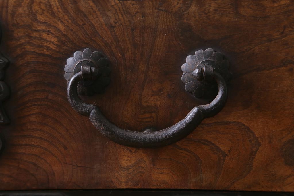 重厚感のある飾り金具がケヤキの杢目を引き立て、