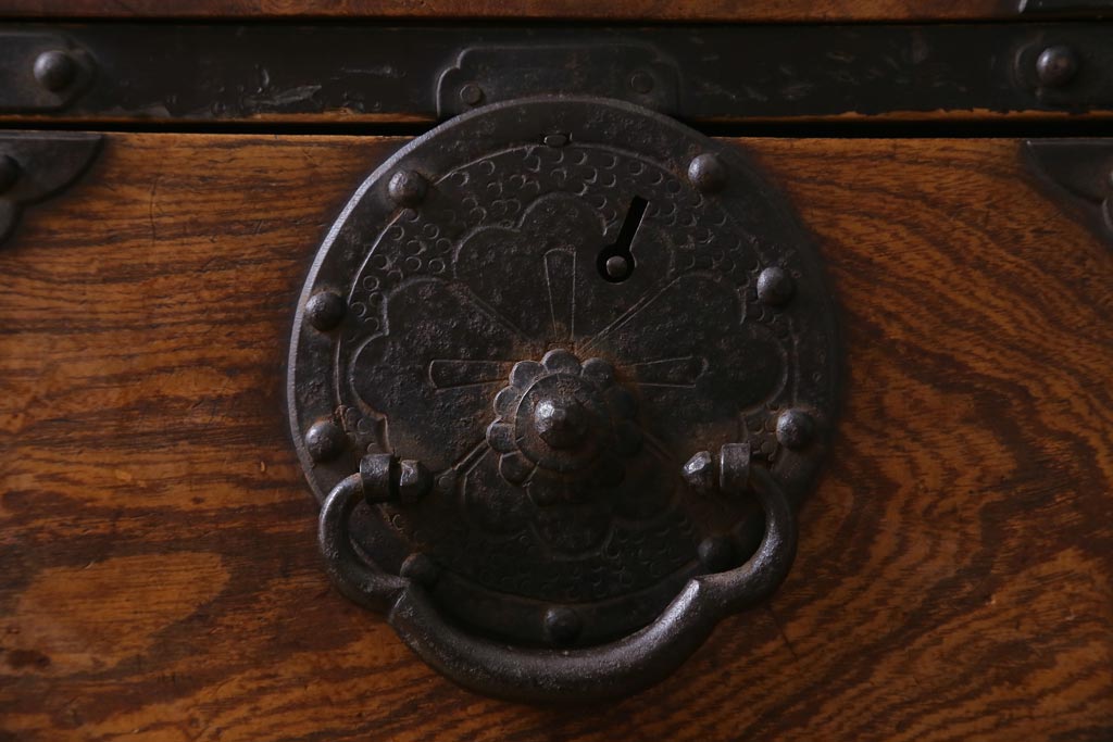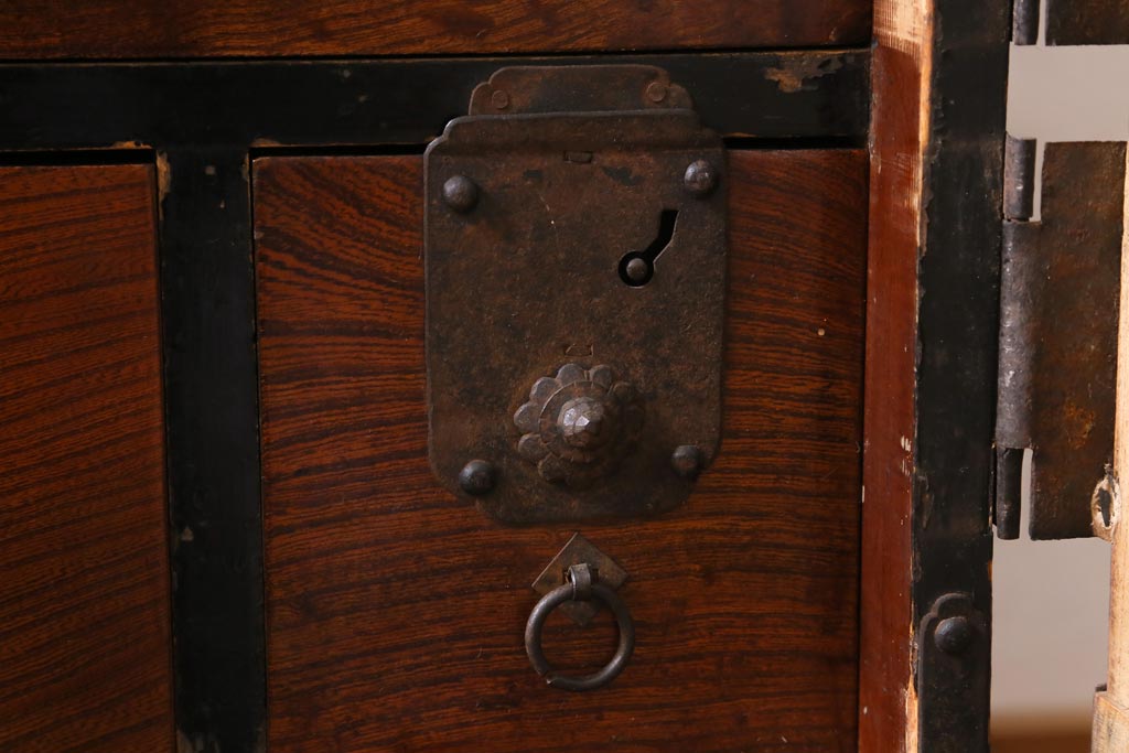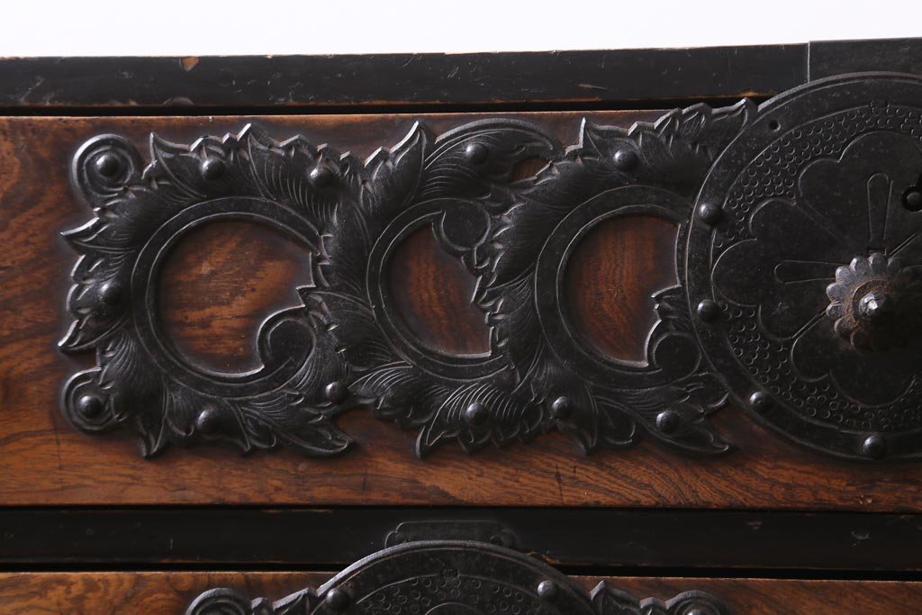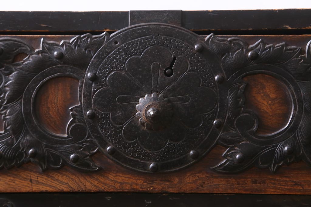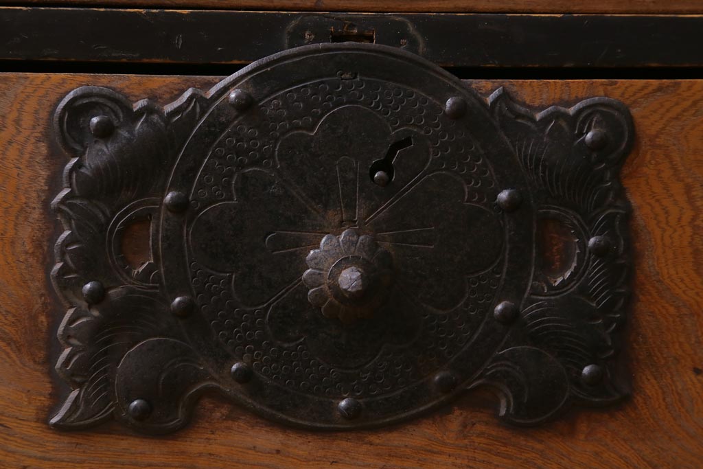 重厚感のある飾り金具がケヤキの杢目を引き立て、