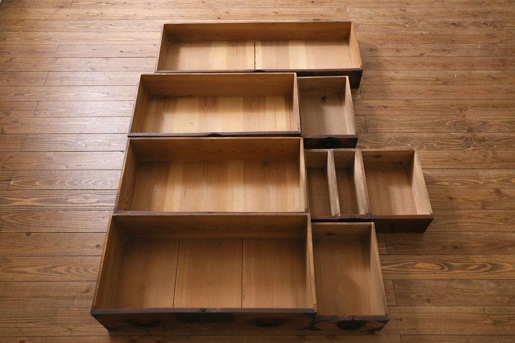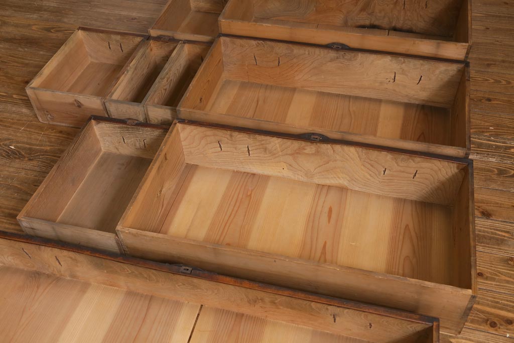 アンティーク家具 和製アンティーク 前面ケヤキ材 味わいのある杢目が目を引く仙台箪笥(衣装箪笥、和タンス)(R-038609)です。