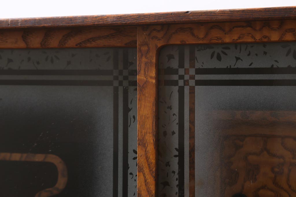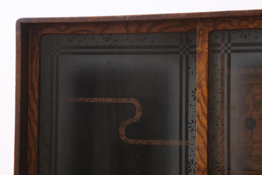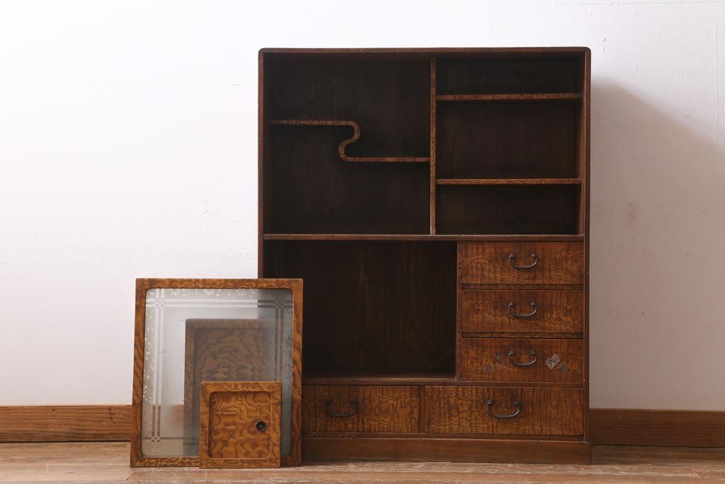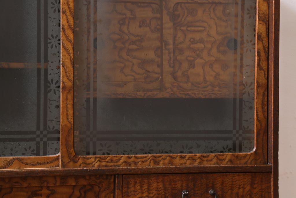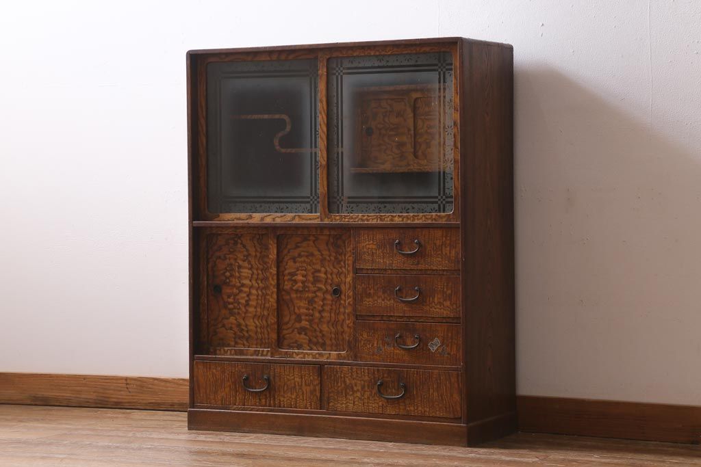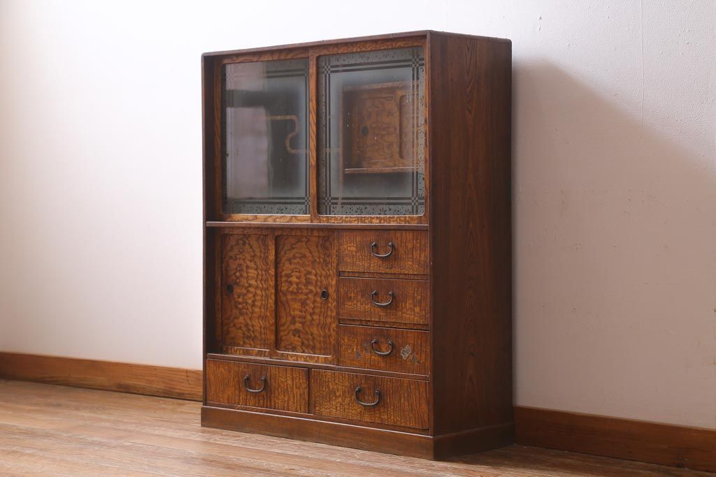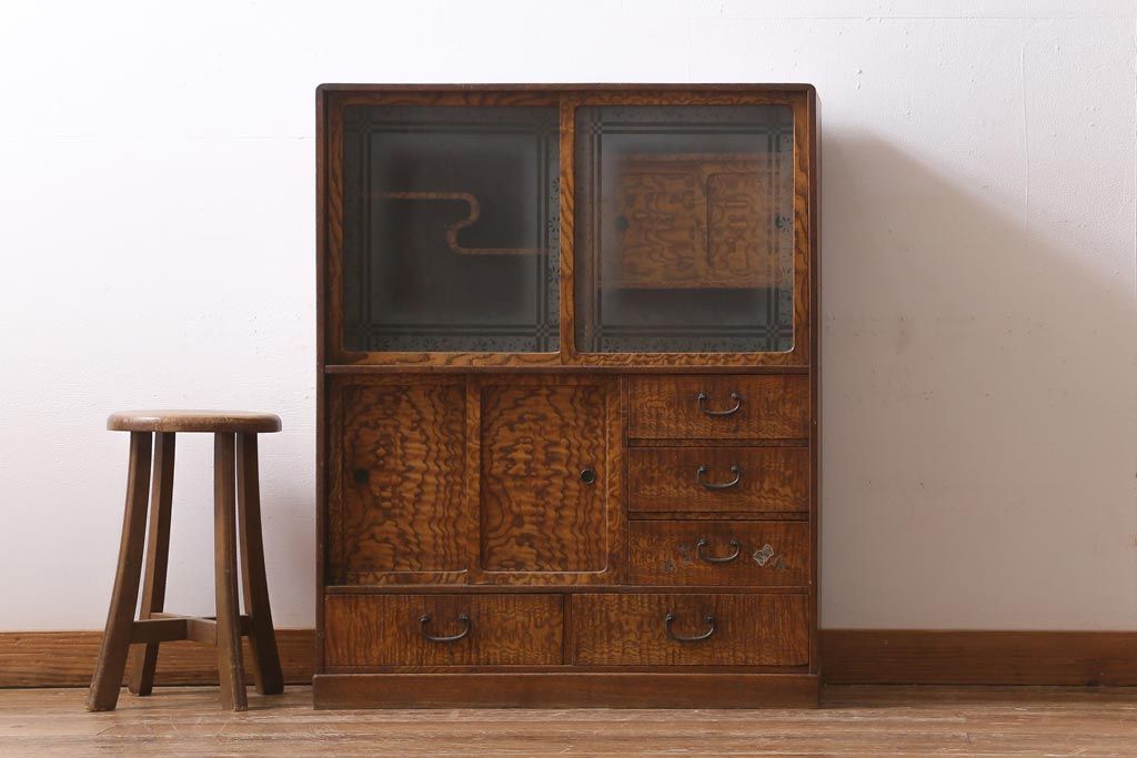 アンティーク家具 前面タモ玉杢材 ガラス引き戸のデザインがお洒落な茶箪笥(茶棚、戸棚、収納棚)(R-038705)