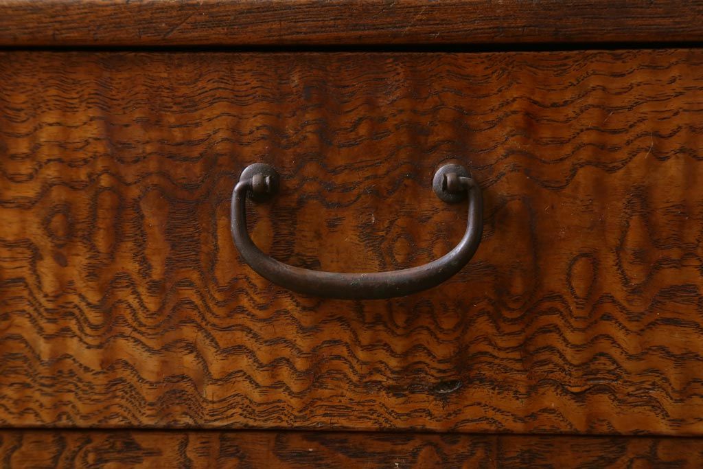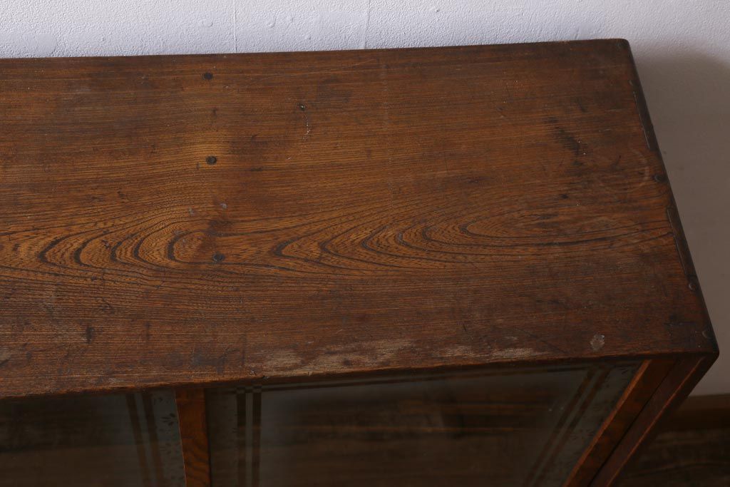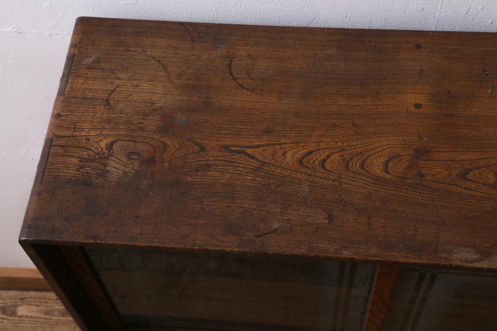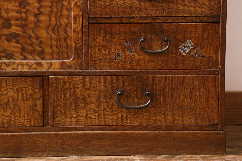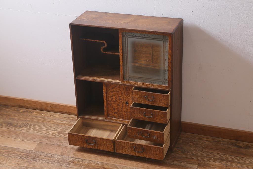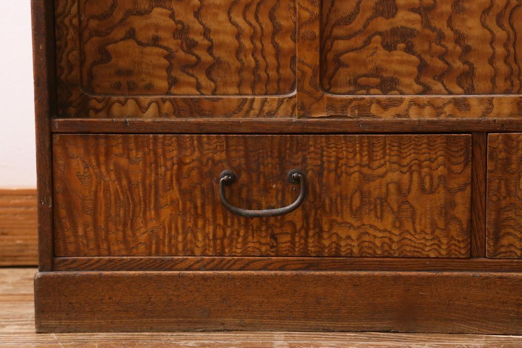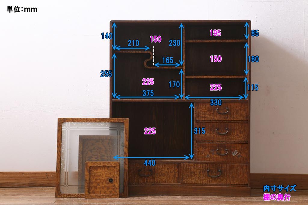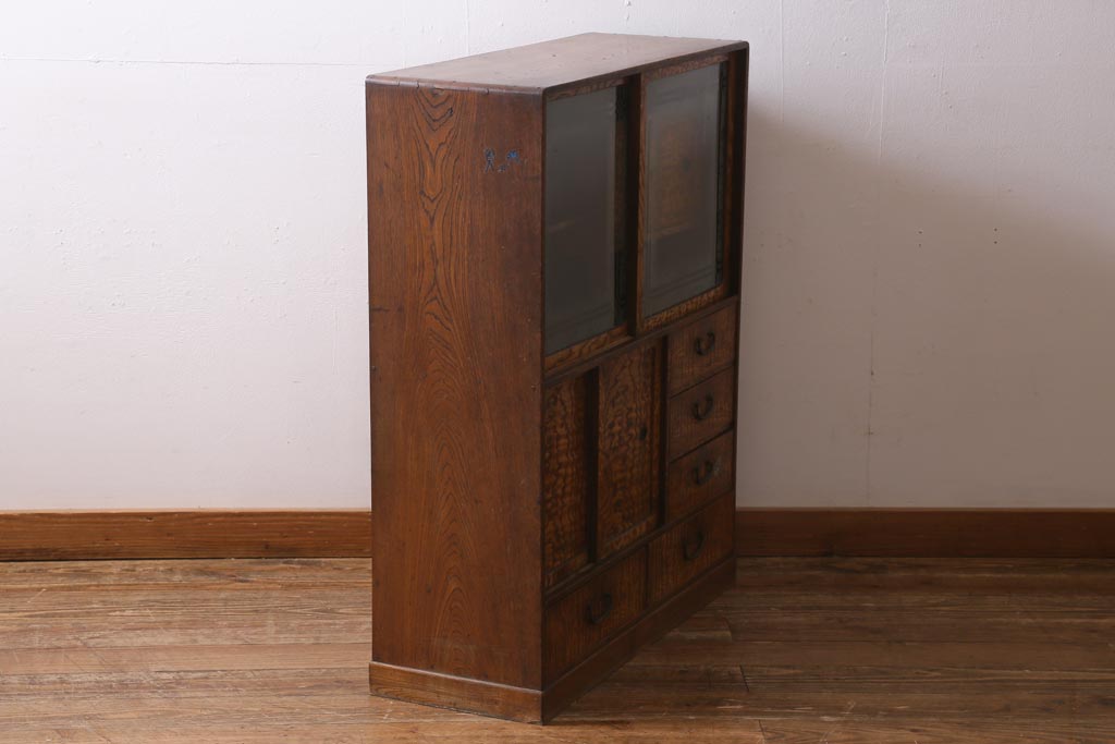 アンティーク家具 前面タモ玉杢材 ガラス引き戸のデザインがお洒落な茶箪笥(茶棚、戸棚、収納棚)(R-038705)