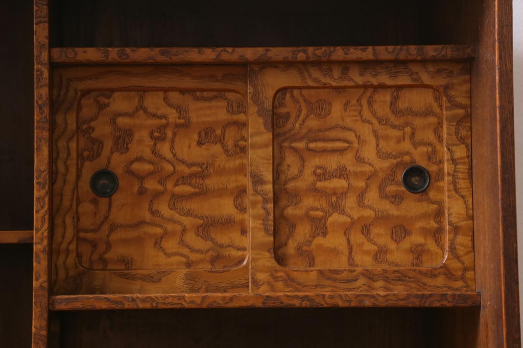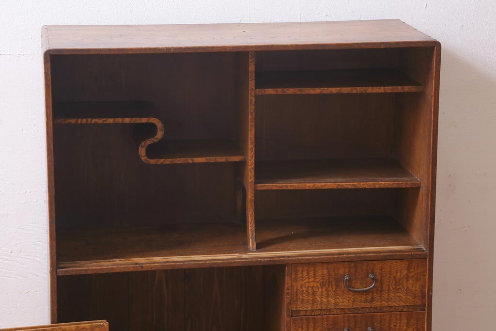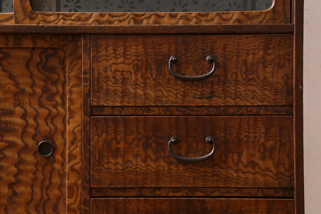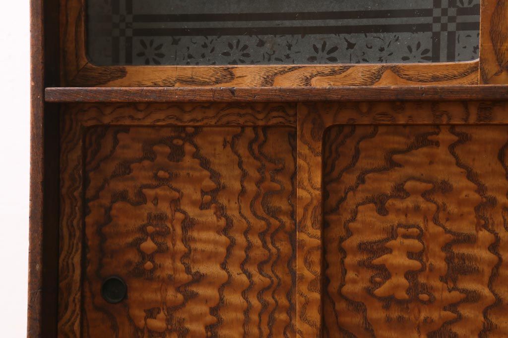 和箪笥> 茶箪笥・茶棚 > アンティーク家具 前面タモ玉杢材 ガラス引き戸のデザインがお洒落な茶箪笥(茶棚、戸棚、収納棚)(R-038705)