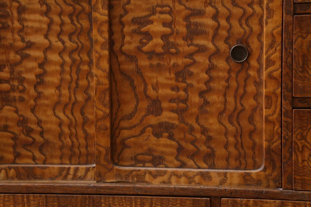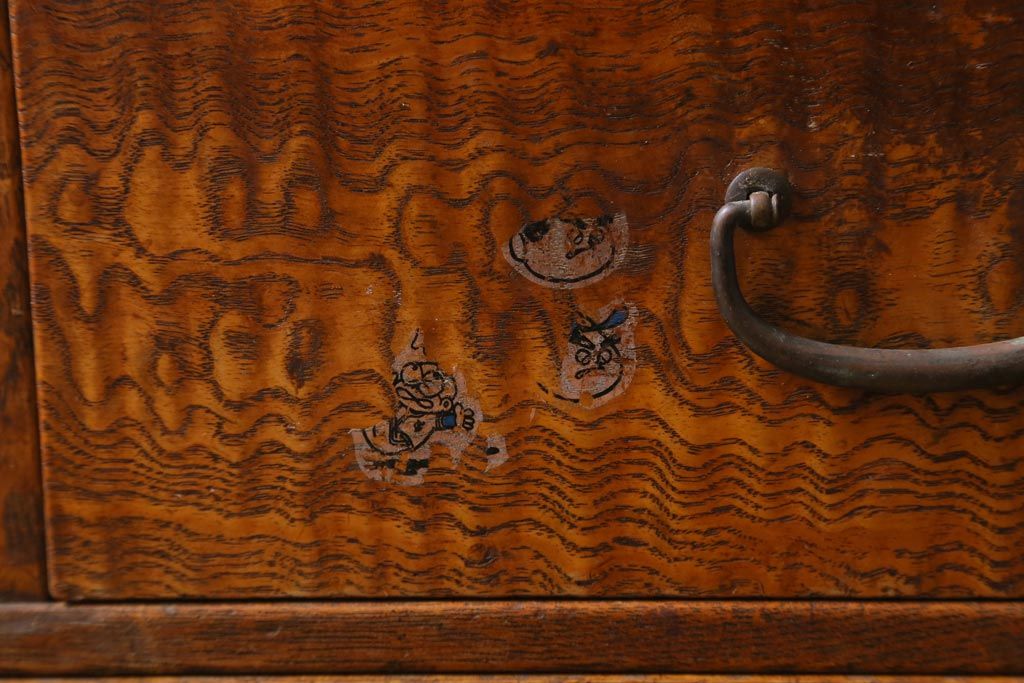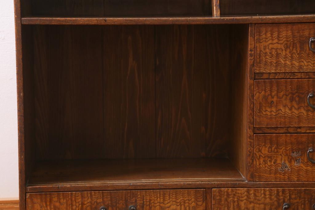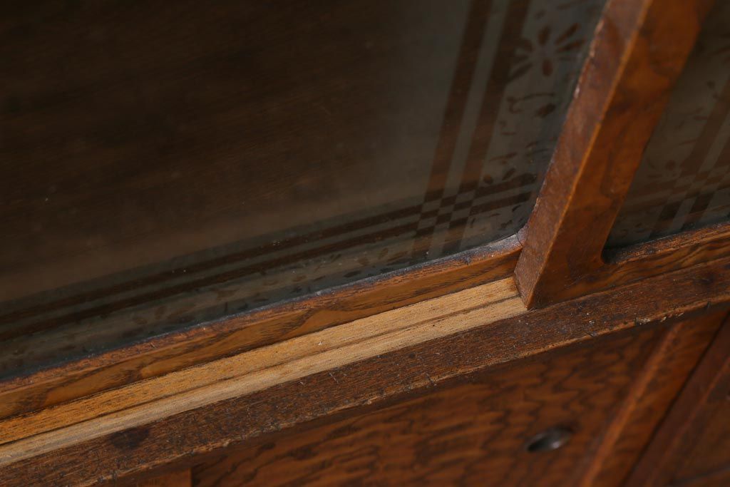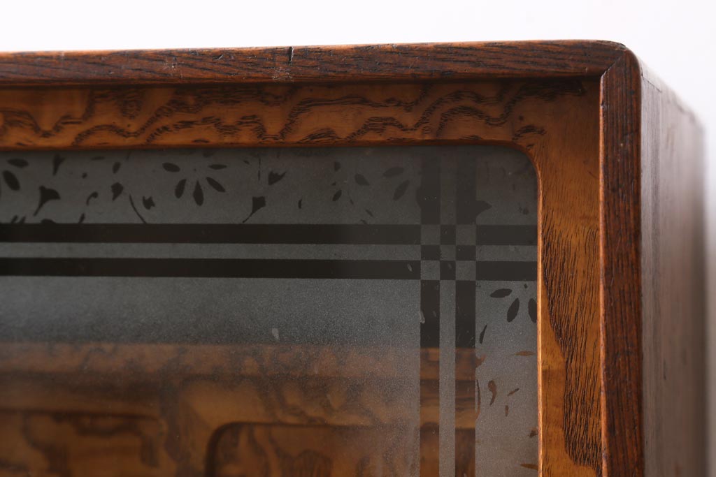 和箪笥> 茶箪笥・茶棚 > アンティーク家具 前面タモ玉杢材 ガラス引き戸のデザインがお洒落な茶箪笥(茶棚、戸棚、収納棚)(R-038705)