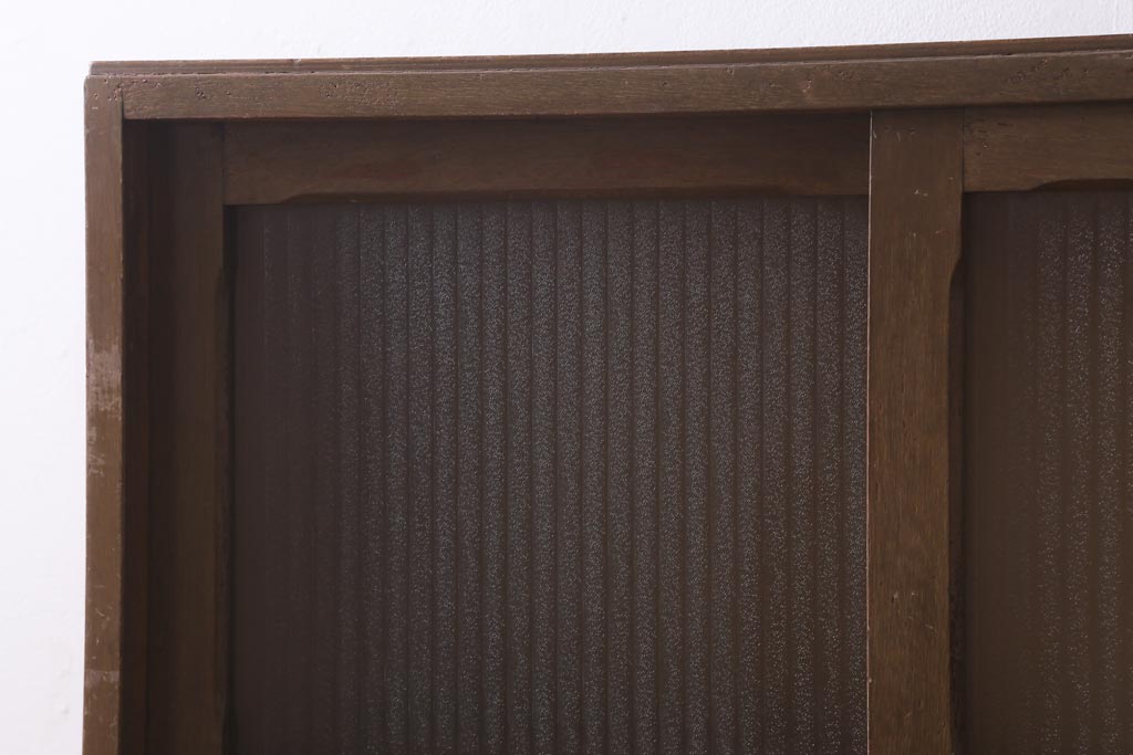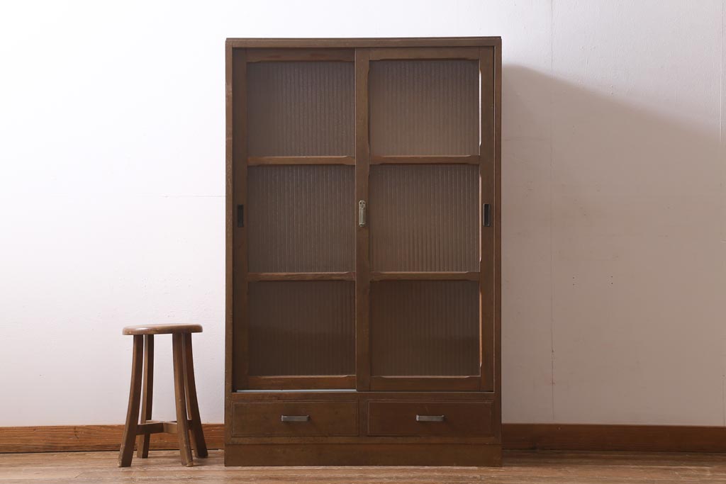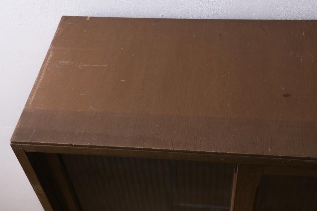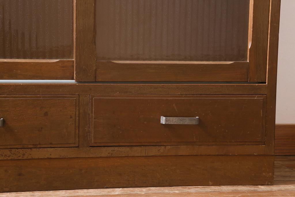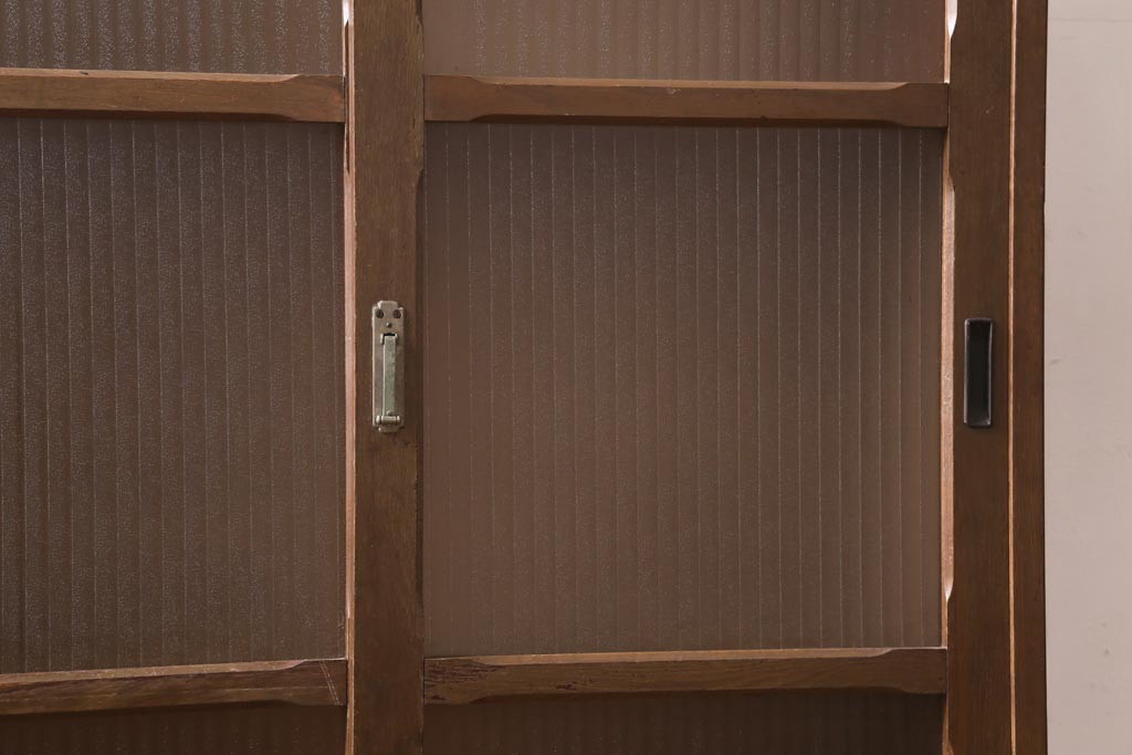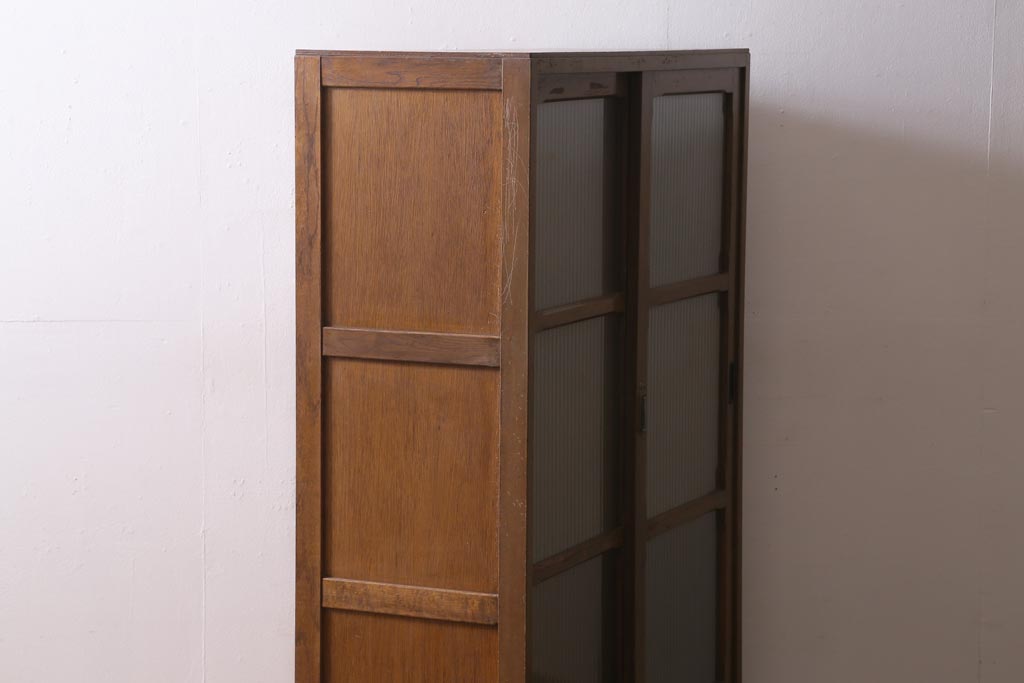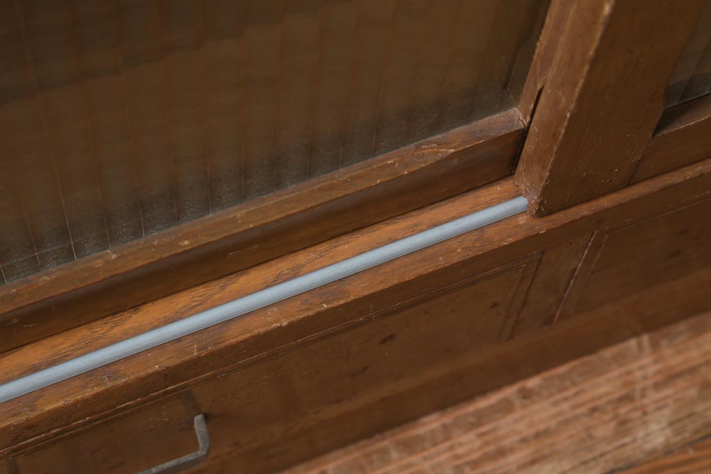 アンティーク家具 昭和中期 銀モールガラス 温かみのある木肌が魅力のレトロなガラス戸棚(収納棚、食器棚、キャビネット)(R-038684)です。