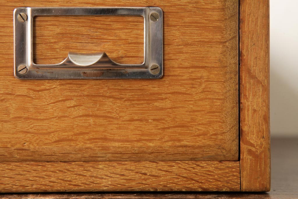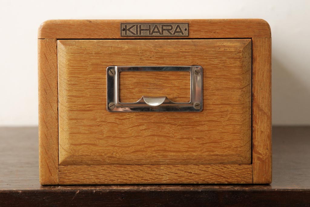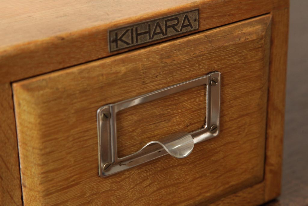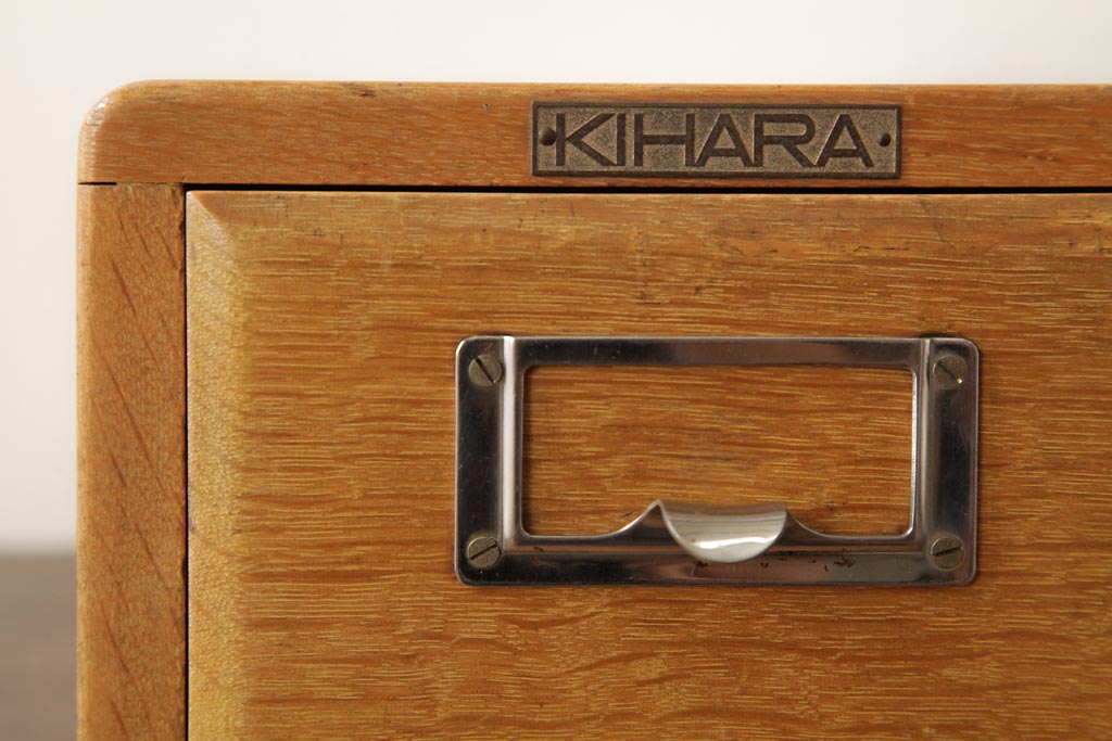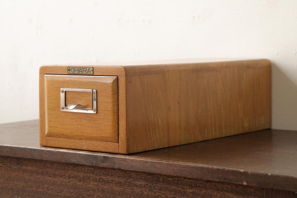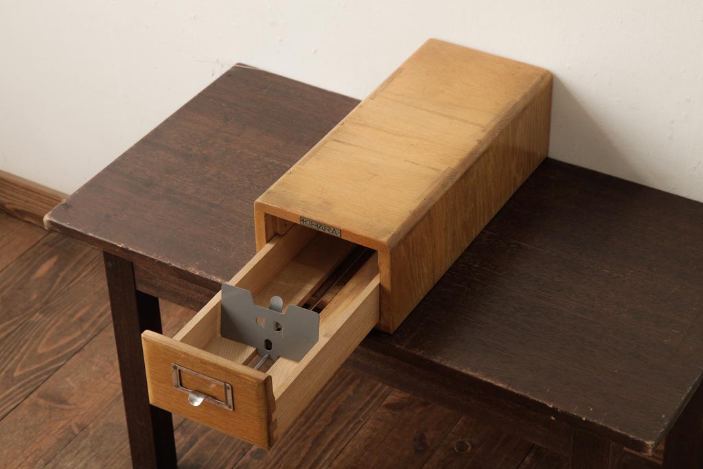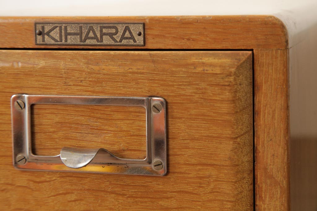レトロ家具 昭和レトロ ナラ材 KIHARA ネームプレート付きの小さなカードケース(小引き出し、図書館、図書室)(R-038694)です。
