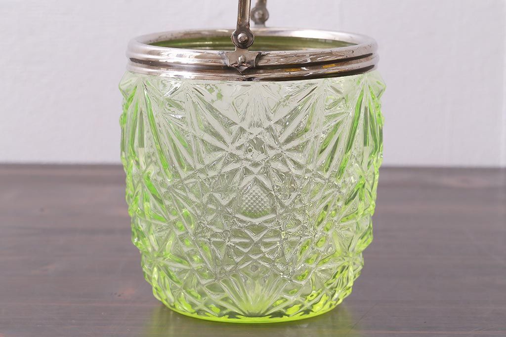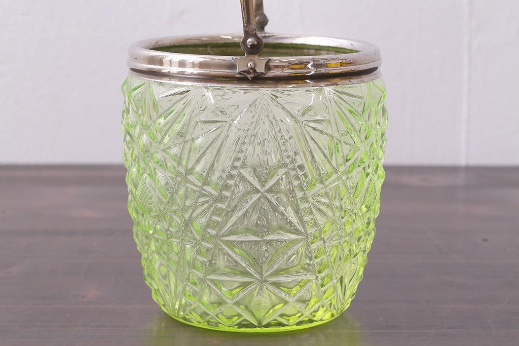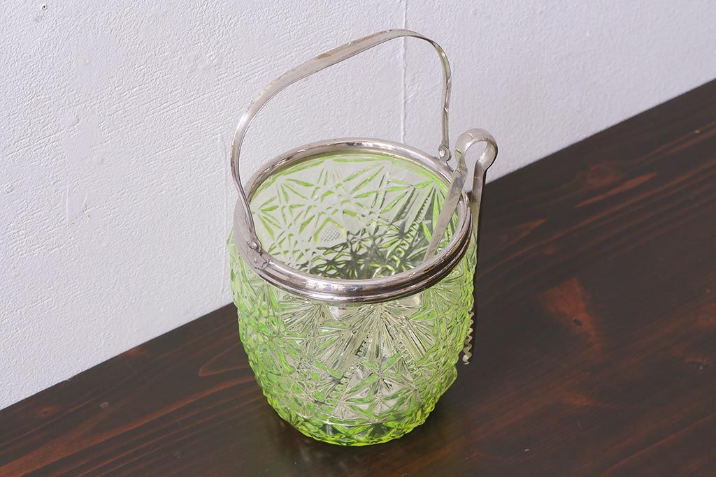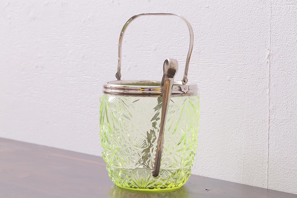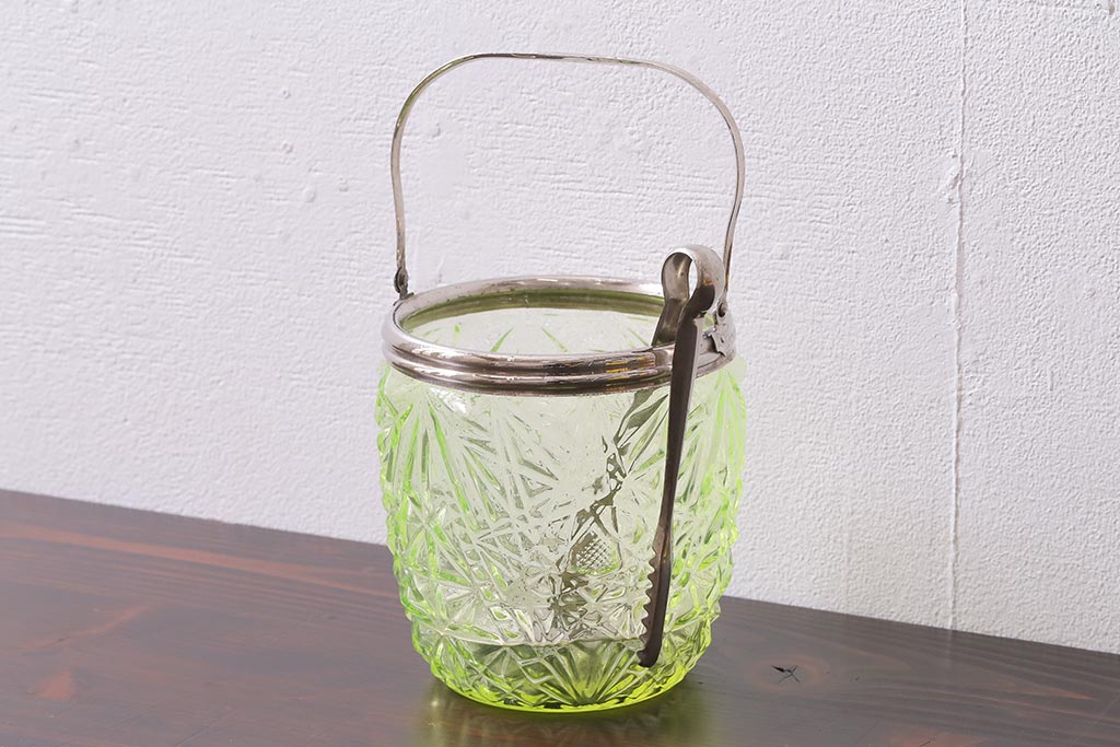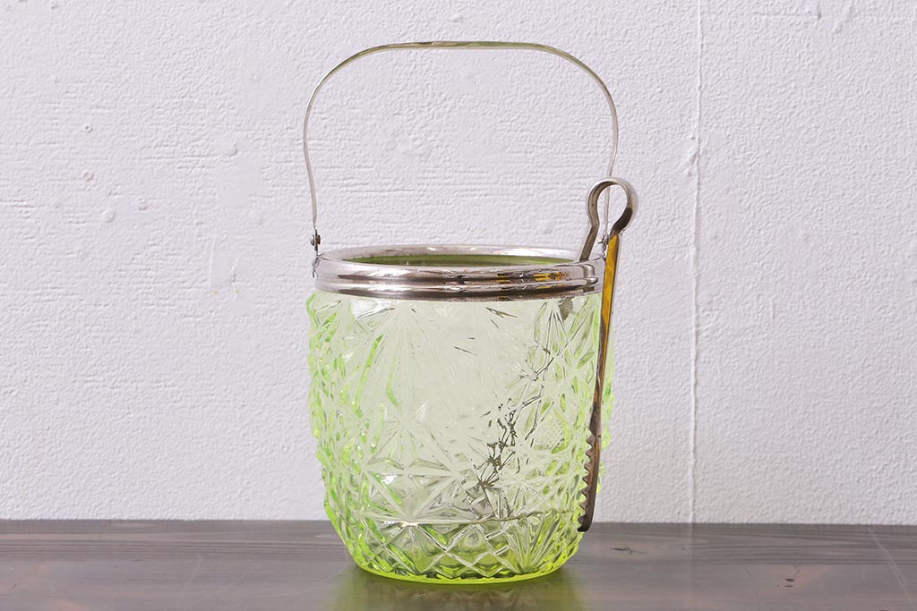 アンティーク雑貨 大正昭和初期 ウランガラス製のアイスペール(アイスバスケット、ワセリンガラス)(R-038051)