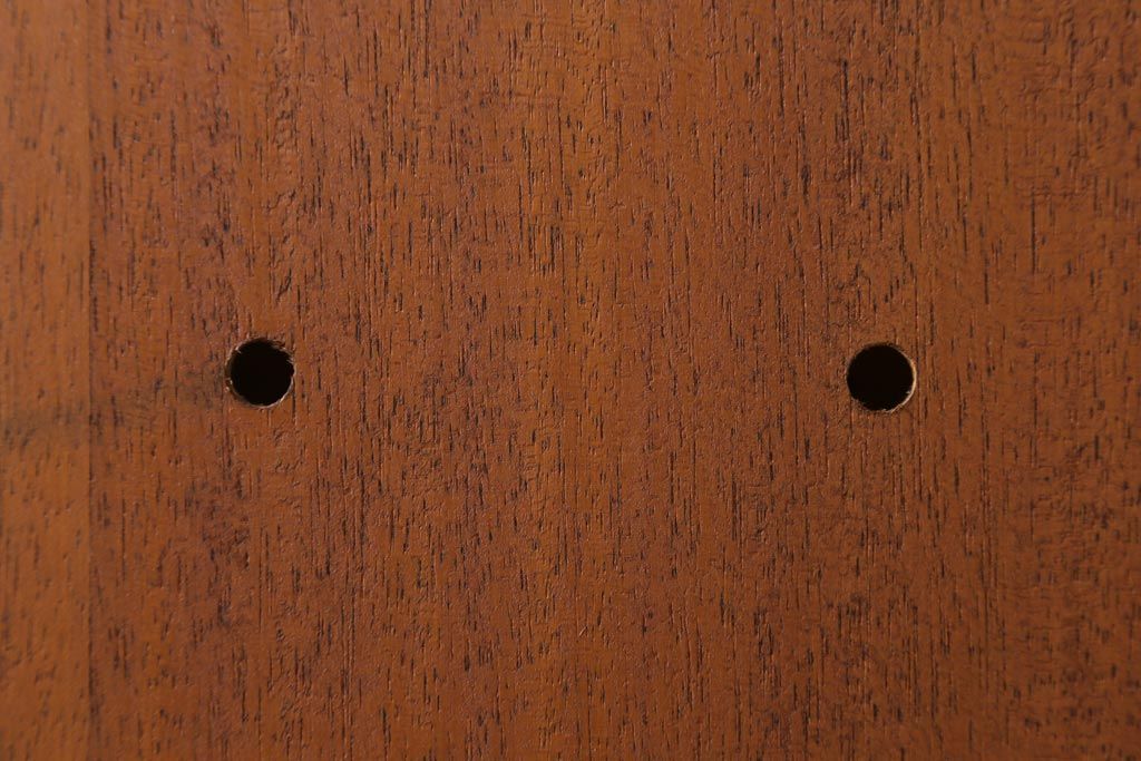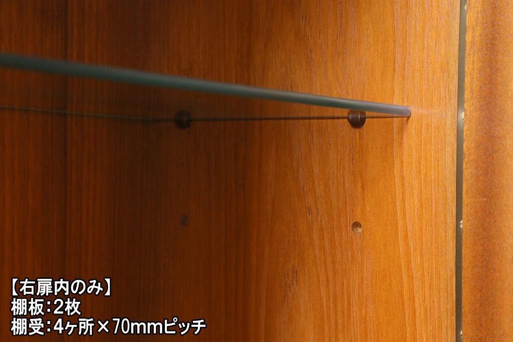ガラス棚板のみ取り外しできます。右の扉内のみ棚板は2枚、棚受けは4ヶ所、70mmピッチで調整できます。棚幅サイズのものが1枚の作りです。