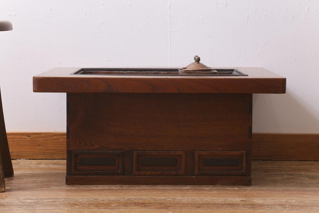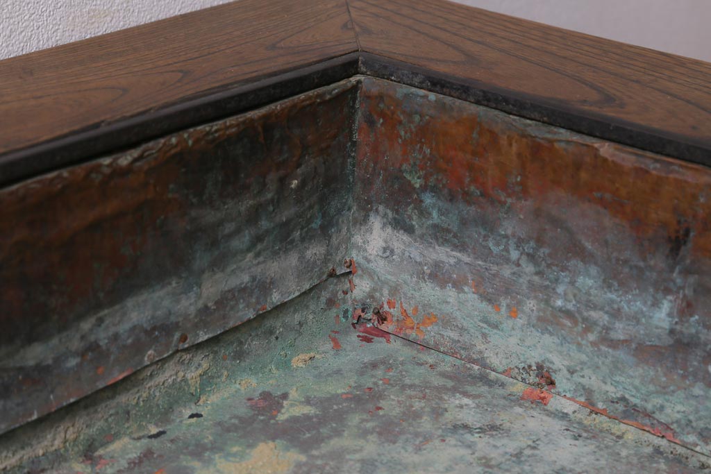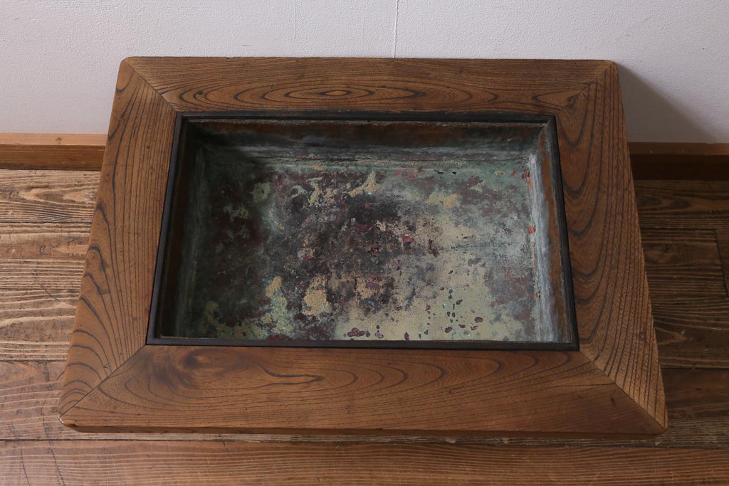アンティーク雑貨 銅壺(銅壷)付き! 総欅(ケヤキ)材 関西火鉢(木製火鉢、囲炉裏)(R-038860)
