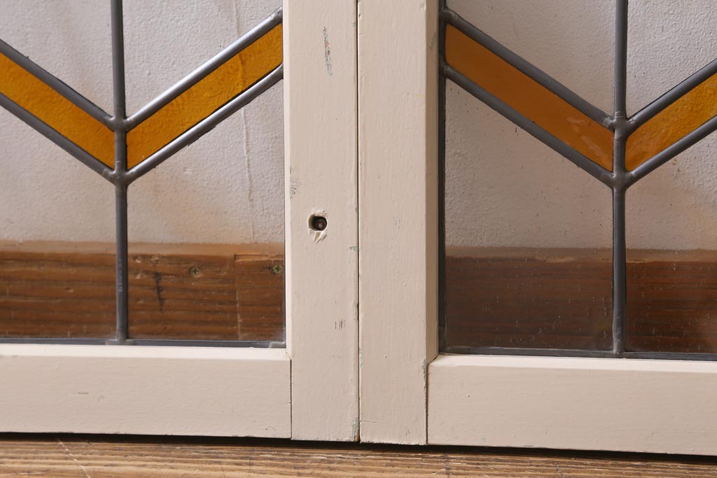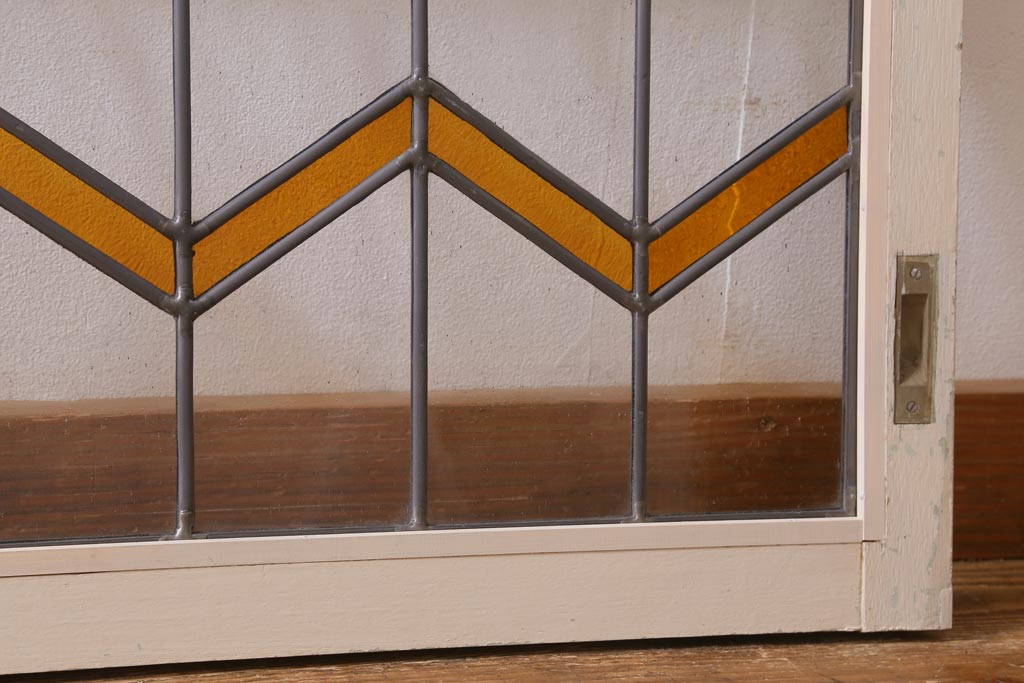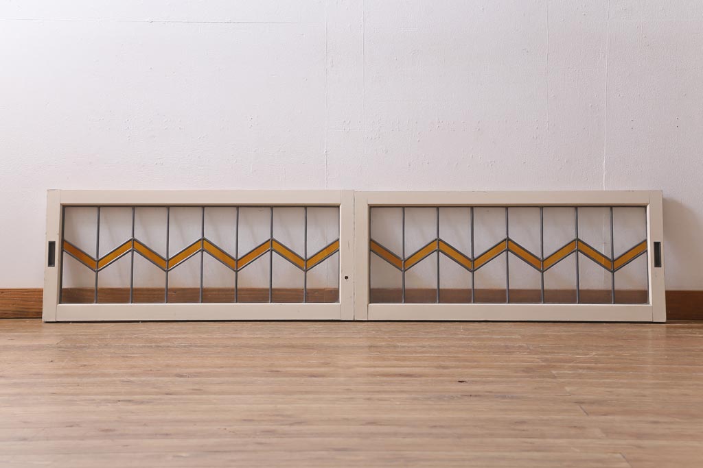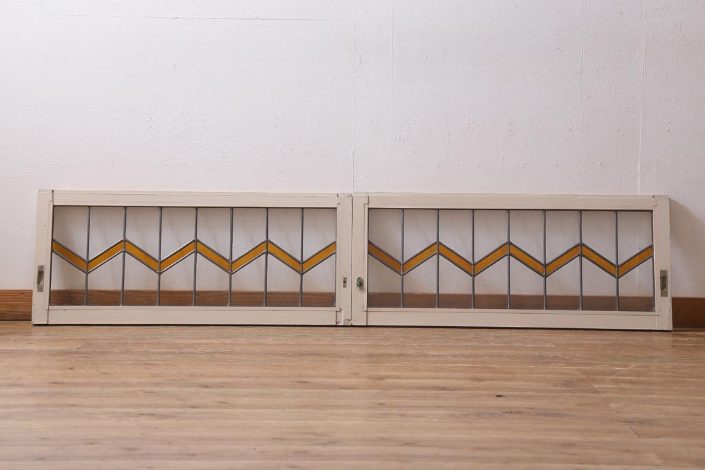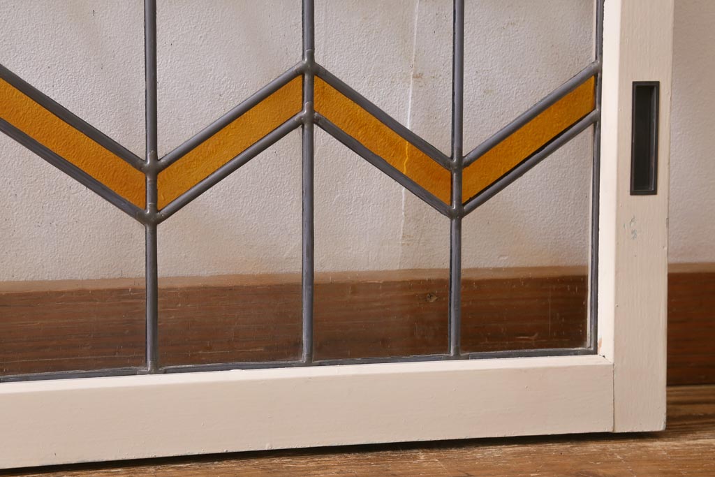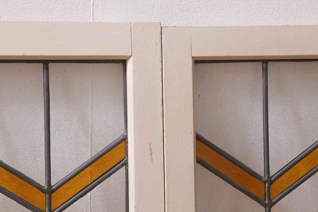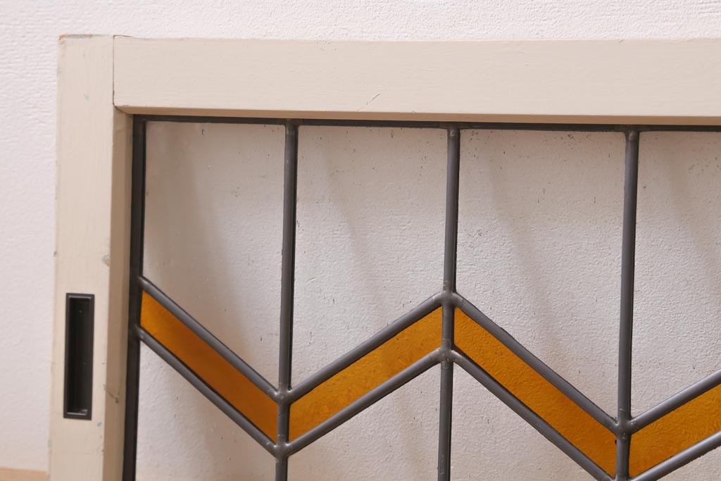 ラフジュ工房> ステンドグラス > アンティーク建具 古建具リメイク オリジナルペイント 黄色のジグザク模様が目を引くガラス戸2枚セット(窓、建具)(R-038889)