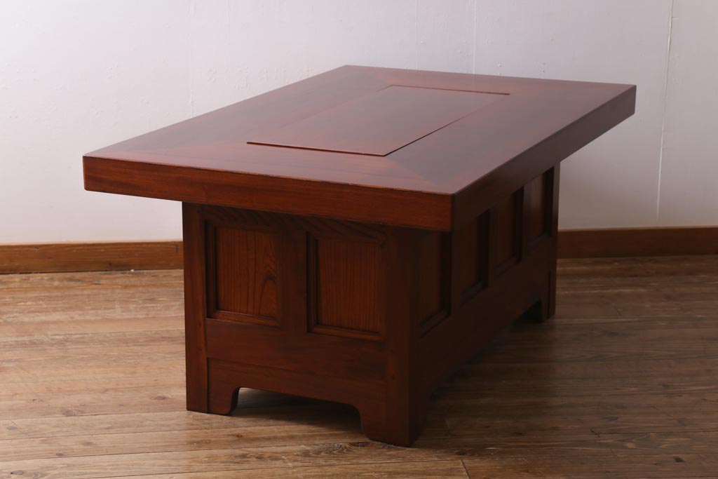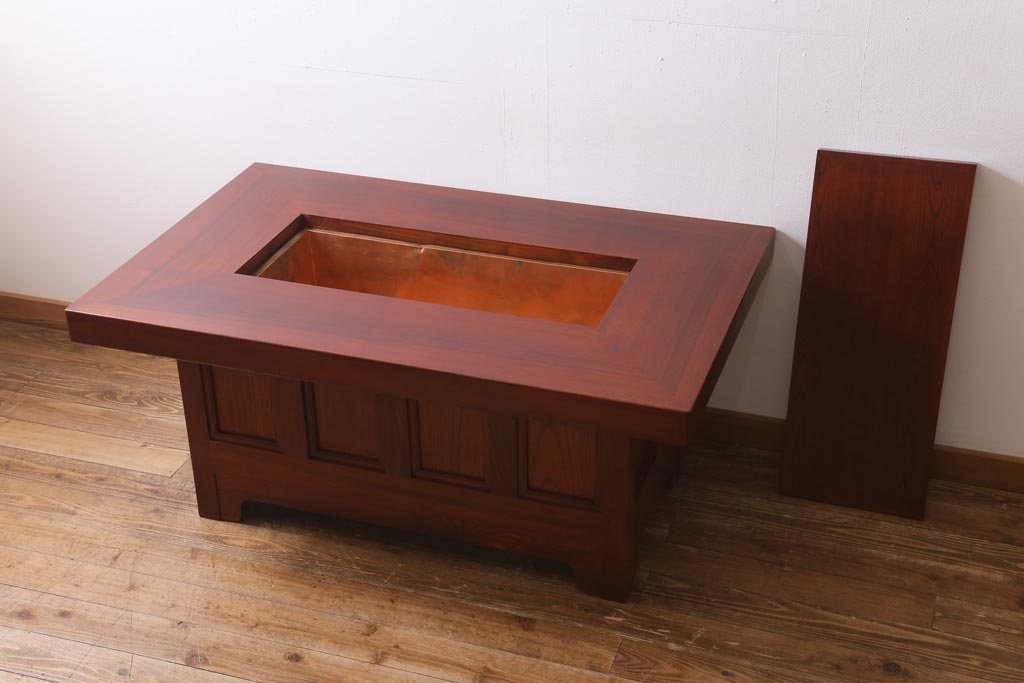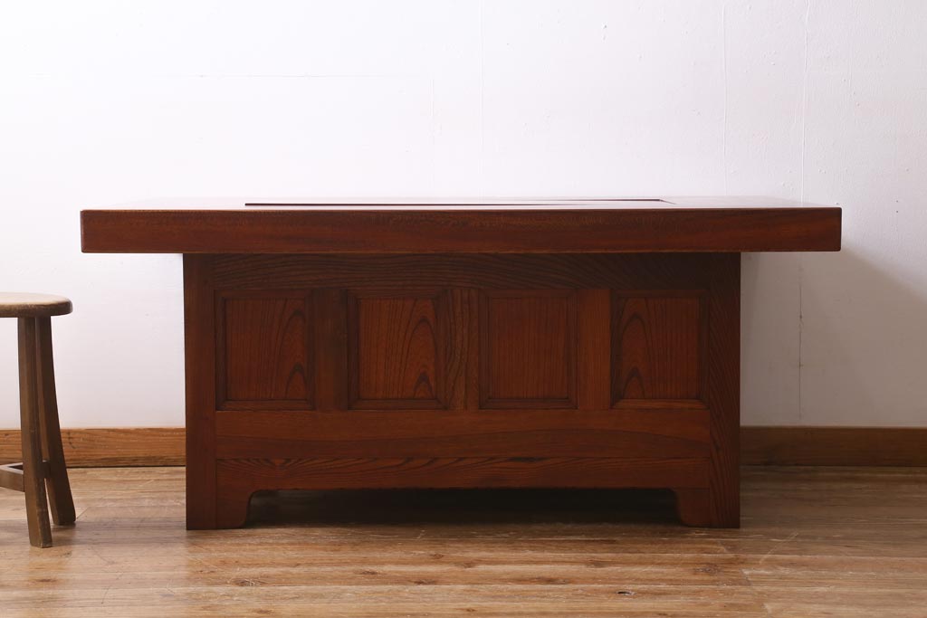 中古 松本民芸家具 激レア! 総欅材 漆塗り かくし収納付きA型洋炉卓(木製火鉢、囲炉裏、テーブル)(定価約100万円)(R-038992)